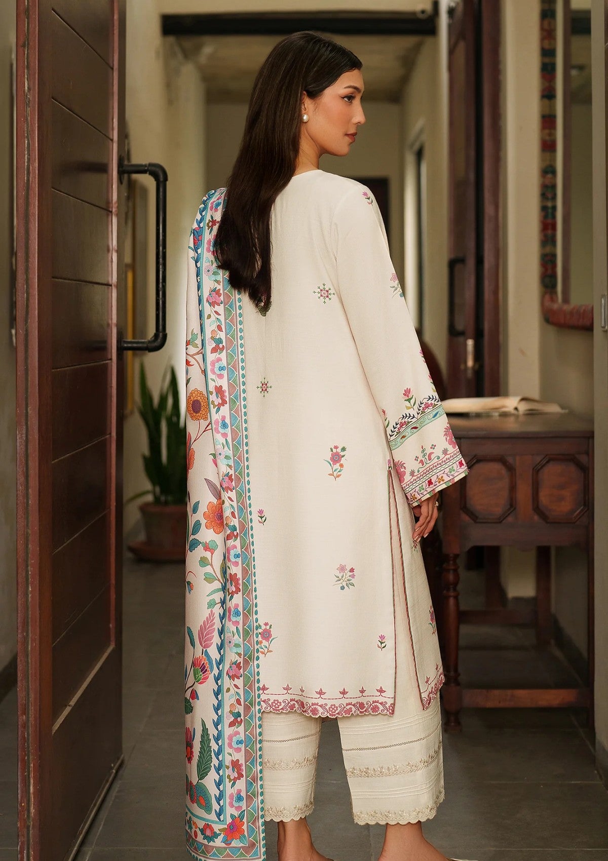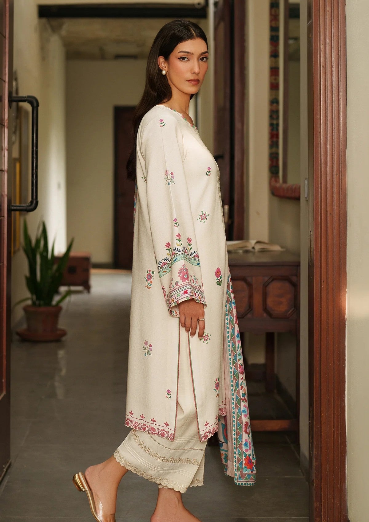 Alyune captures timeless elegance through a refined winter palette. Crafted from slub viscose, the shirt features delicate embroidery along the neckline, with scattered floral motifs across the front that create a beautifully balanced design. The cottel trousers are adorned with intricate lace and embroidered detailing along the hem, adding a touch of sophistication. Paired with a printed blended shawl showcasing vibrant florals and ornate borders, this ensemble seamlessly blends subtle luxury with feminine charm.