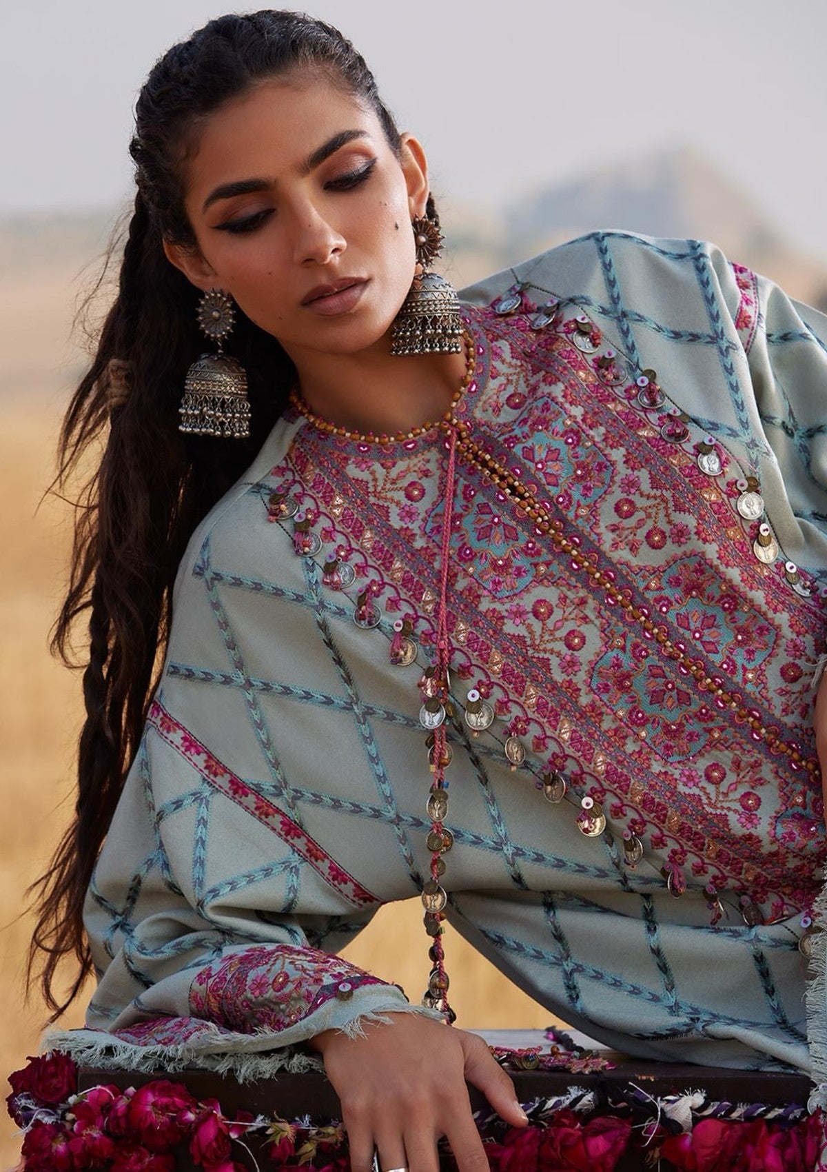 Nayab embodies the wild elegance of winter — a soft karandi shirt that drapes like whispered stories, paired with a flowing dupatta that moves with the rhythm of the wind. Crafted from breathable, premium karandi fabric, the shirt offers a perfect blend of comfort and structured sophistication, while subtle tribal-inspired details add depth and intrigue.The matching dupatta complements the shirt with ethereal grace, featuring delicate textures and motifs that evoke winter’s quiet poetry. Together, they create a look that is effortlessly moody, tribal, and unapologetically free.