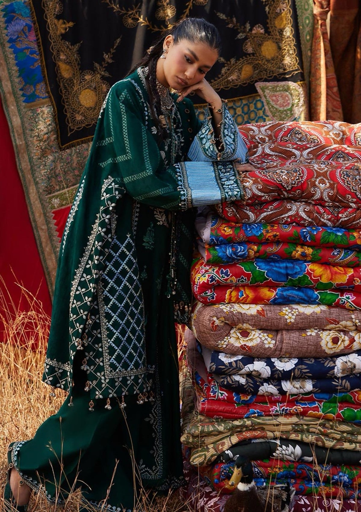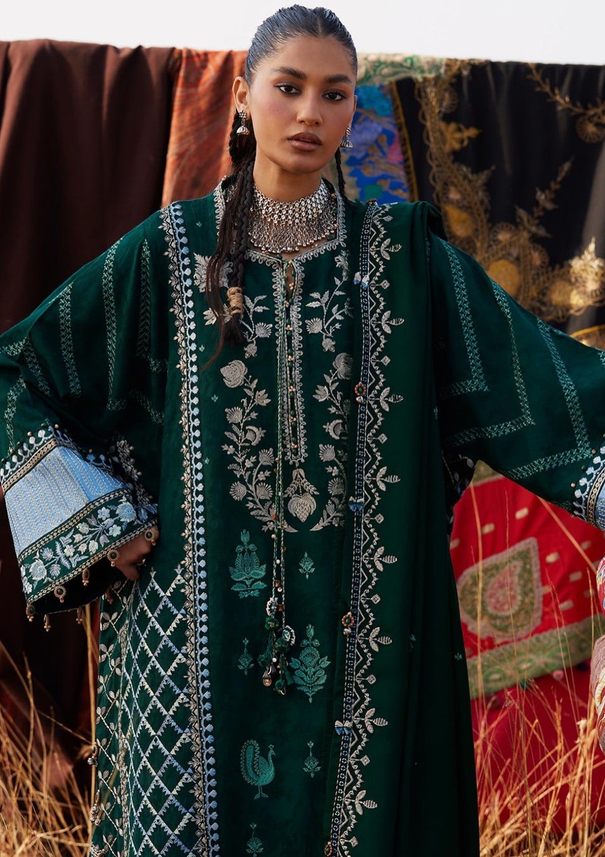 Yasmin — winter green jacquard khaddar shirt and trouser, layered with a soft woolen shawl, infused with steel-blue tribal echoes. Each thread whispers the stories of ancestral motifs, stitched with care, weaving a quiet winter tale that moves with effortless elegance. Moody, grounded, and timeless — Yasmin is winter embodied.