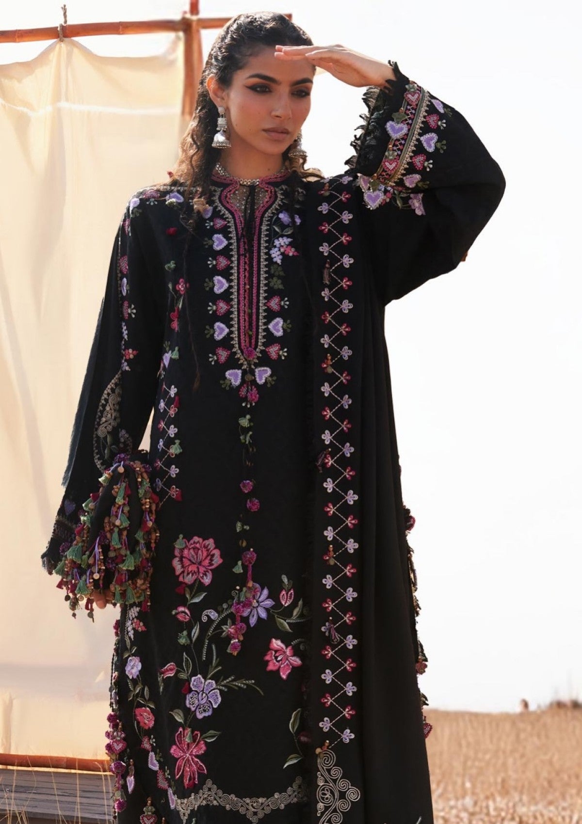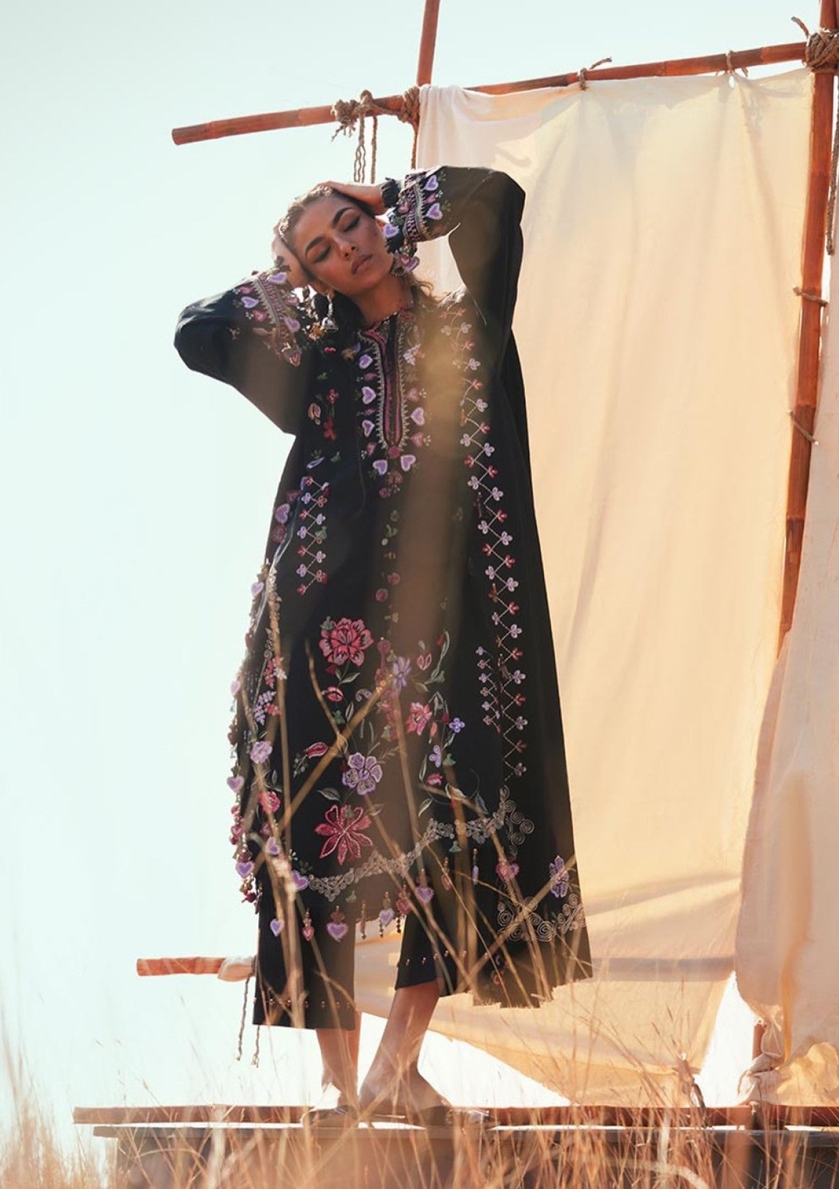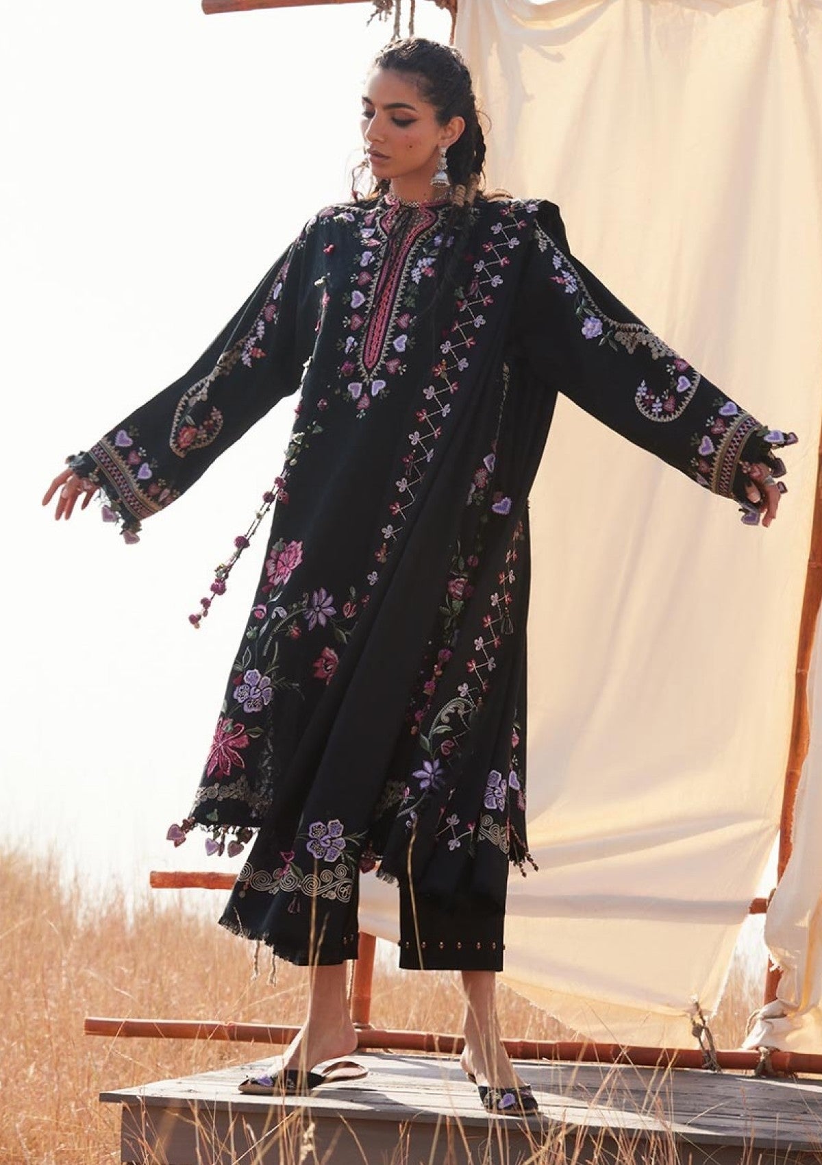 Sehyr — a wild midnight bloom brought to life on a jacquard khaddar shirt and trouser, draped in a soft woolen shawl. Untamed florals and storm-lit stitches ripple across the fabric, echoing the fierce, free heartbeat of winter. Moody, bold, and effortlessly wild — Sehyr is for the woman who moves through winter like a storm of style.