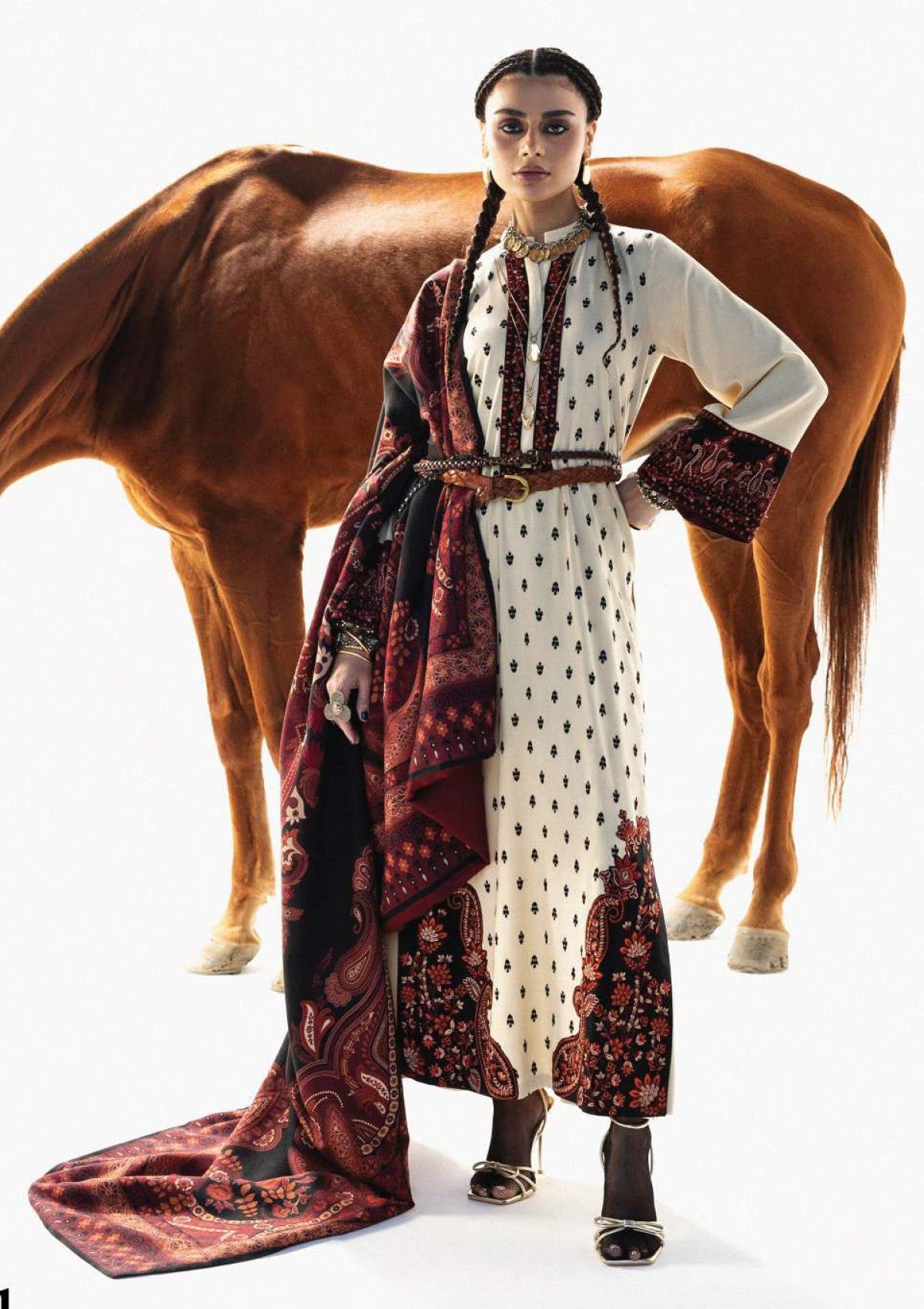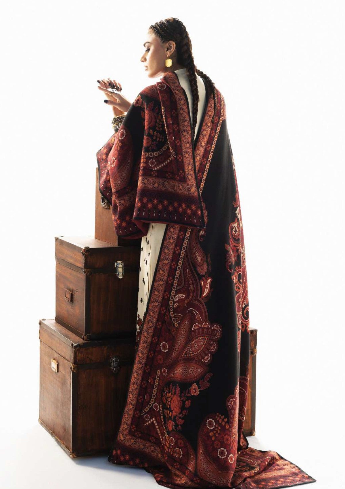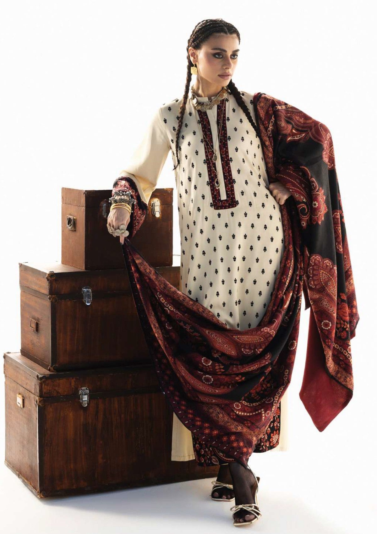 Imani the epitome of refined winter luxury, grounding the collection in a striking, monochromatic classic palette. The flowing cream Marina Twill suit, adorned with delicate black abstract motifs, provides the perfect canvas for the dramatic Lenzing Ecovero shawl. This exquisite shawl is defined by its deep black base, illuminated by intricate, fiery paisley and baroque patterns in rich maroon and crimson. The design captures a regal grace, suggesting artifacts discovered on a grand journey.