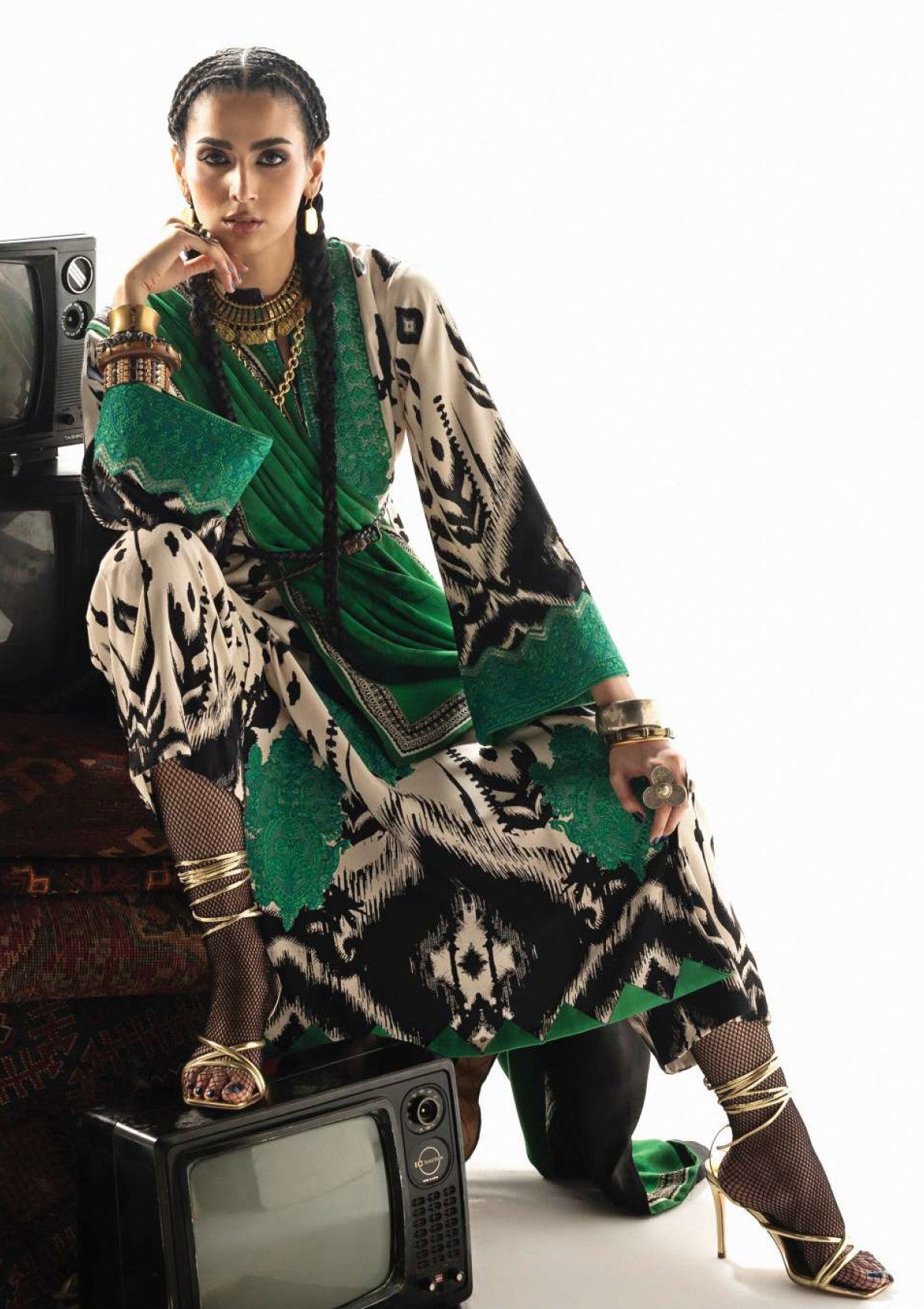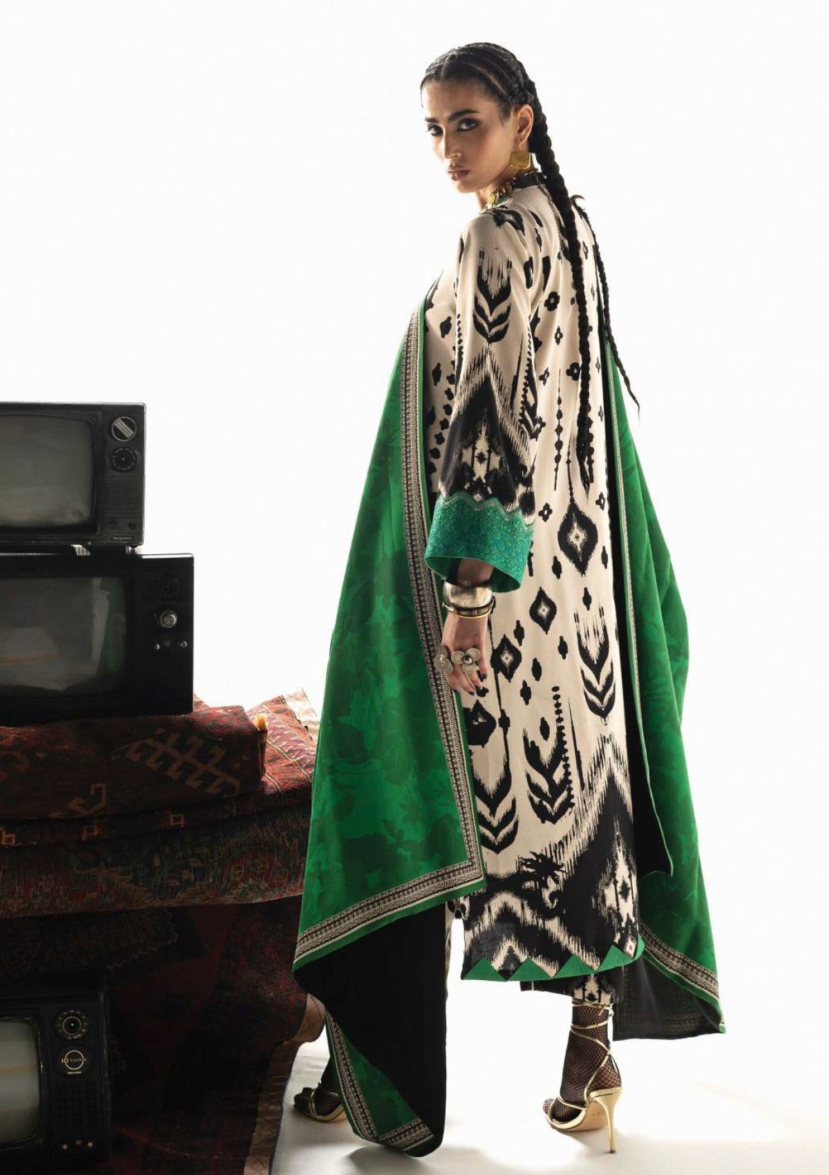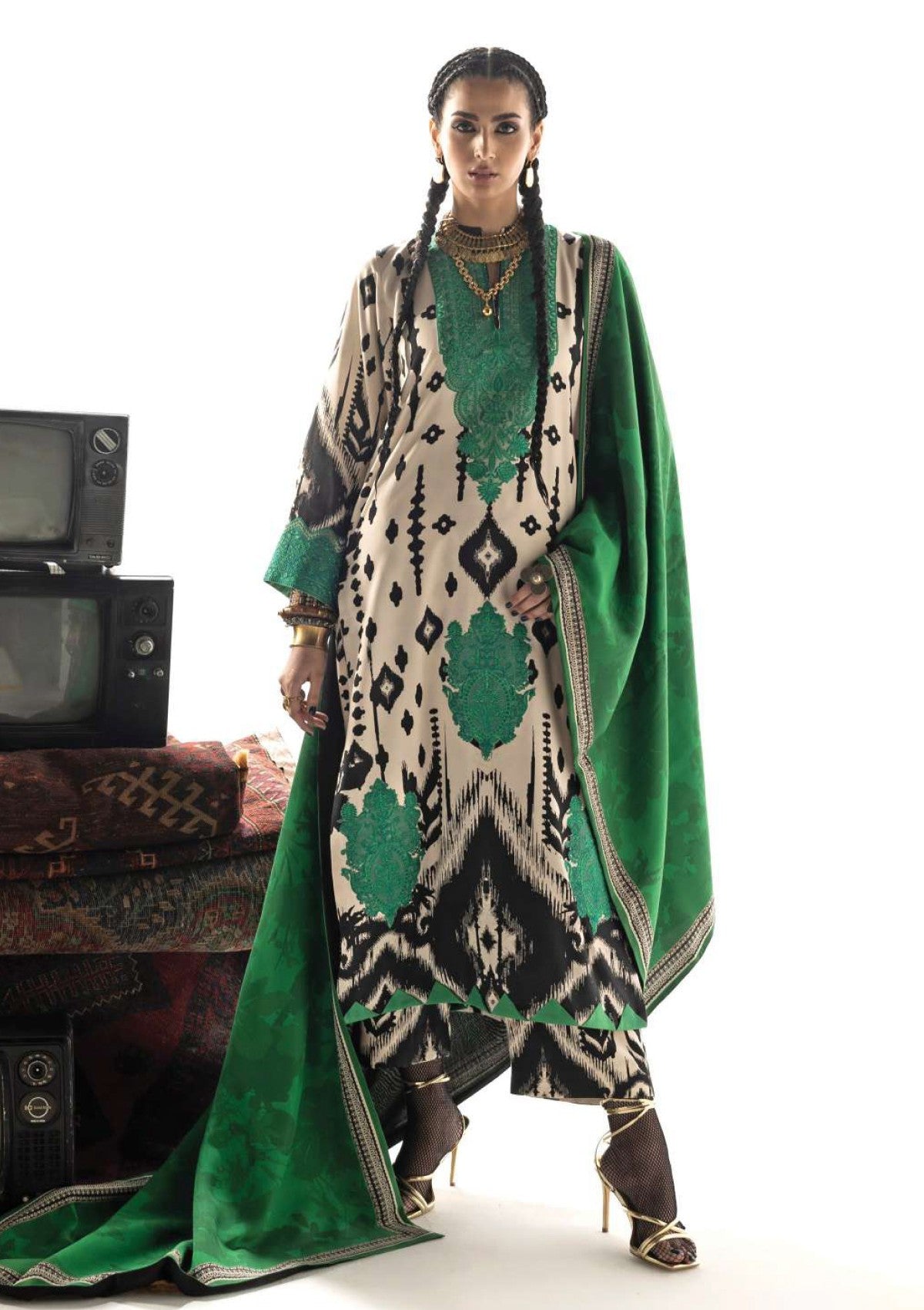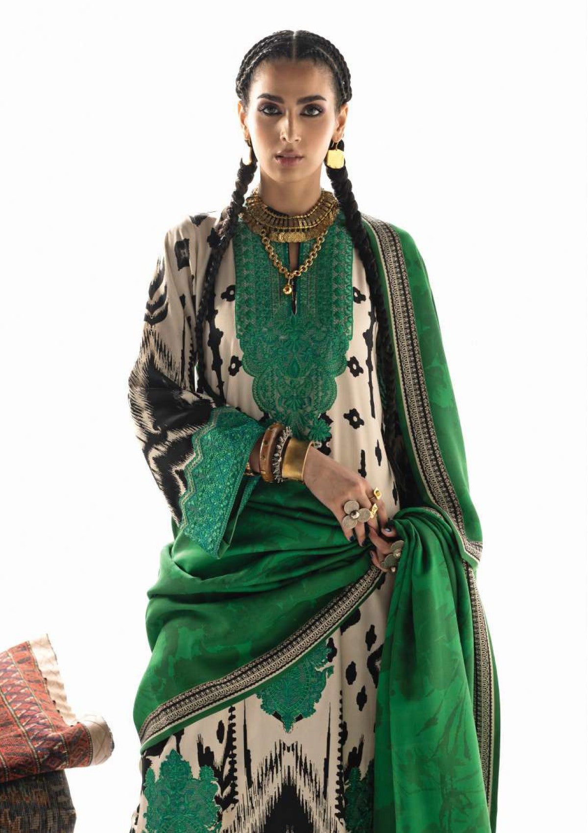 Novaya captures the essence of untamed beauty and modern artistry. This captivating ensemble features a Marina Twill suit adorned with a bold, Ikat-inspired pattern in striking black, creamy off-white, and vibrant teal a visual tapestry reminiscent of ancient weaving traditions. The look is dramatically completed by the rich, solid emerald green Lenzing Ecovero shawl, providing a luxurious depth of color that draws the eye.