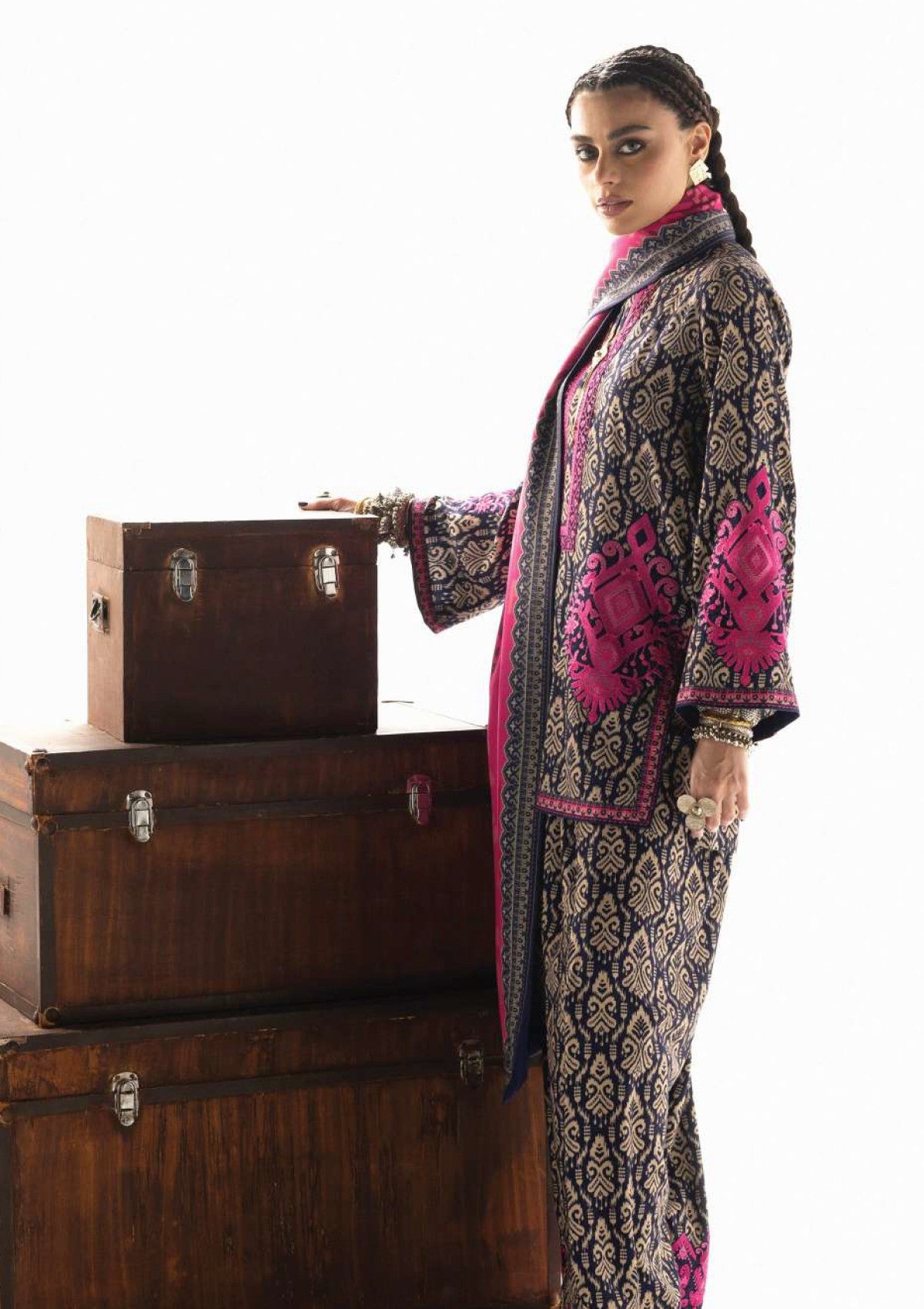 Kesia is a poetic ode to winter elegance, where bold color meets intricate artistry. The luxurious Lenzing Ecovero shawl, drenched in a captivating fuchsia, cascades over a sophisticated Marina Twill ensemble, creating a symphony of patterns in rich navy and soft beige. This design evokes the spirit of vibrant narratives and artistic expression, with the shawl's intense hue providing a striking counterpoint to the suit's detailed motifs. It’s an ensemble for those who wish to tell a story with their style.