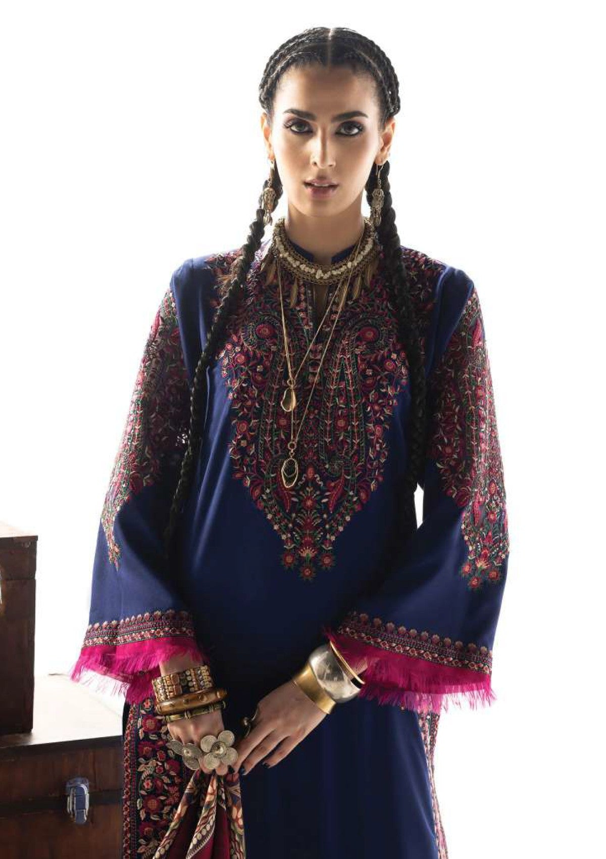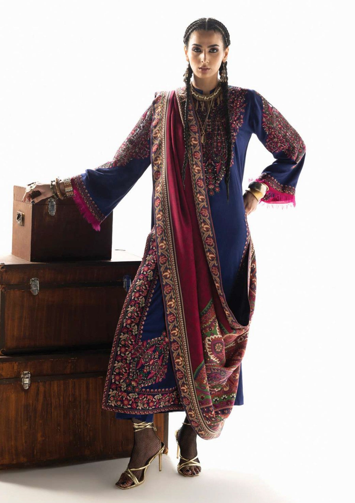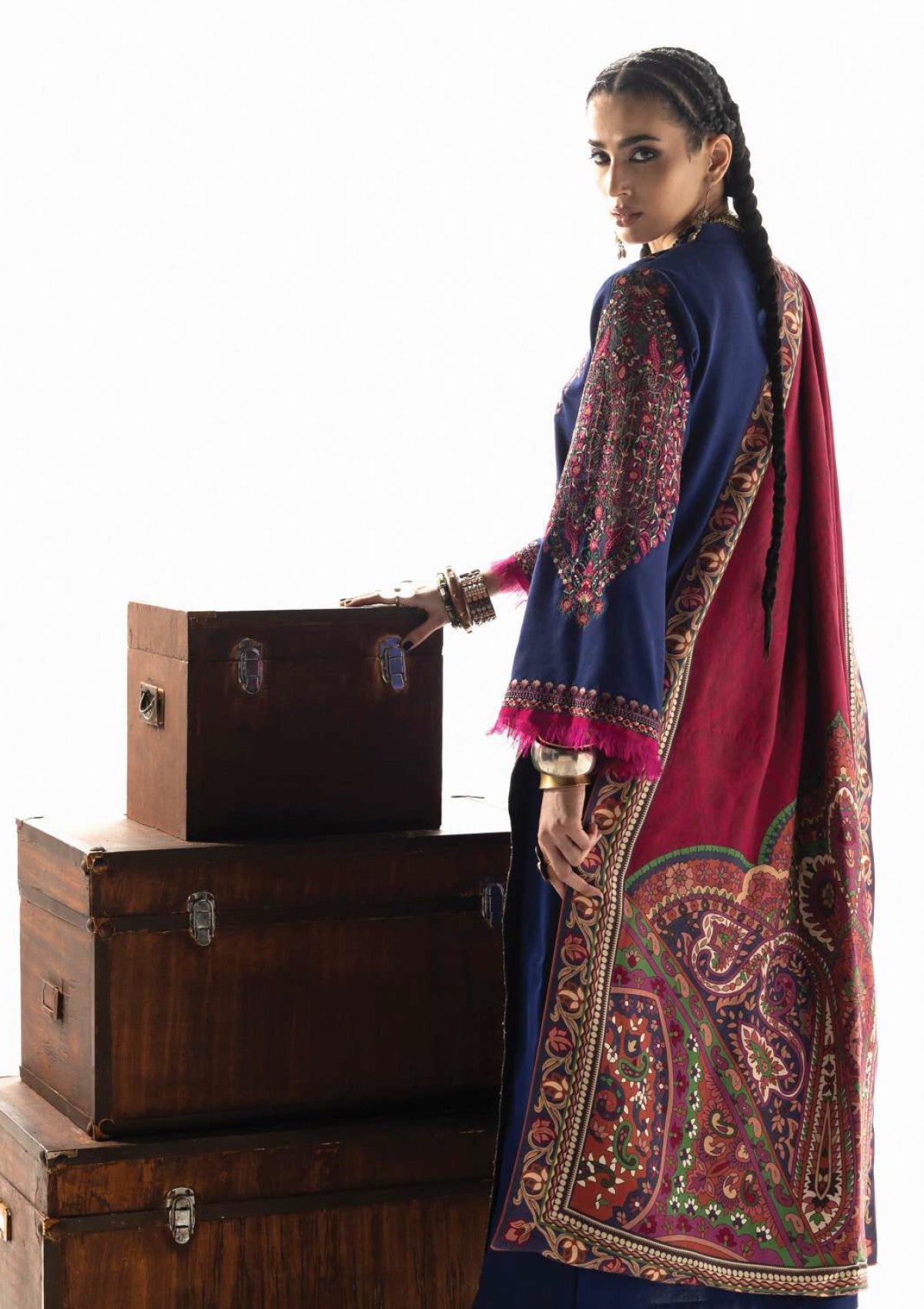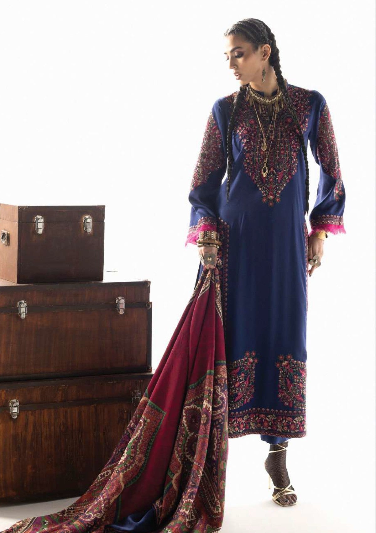 Vilana stands as the crowning jewel of the collection, a magnificent study in rich, contrasting heritage colors. The deep indigo-navy Marina Twill suit provides a sophisticated, midnight canvas, beautifully illuminated by the dramatic accents of fuchsia and elaborate embroidery. The focal point is the exquisite Lenzing Ecovero shawl, which is a tapestry of complex paisley patterns in tones of deep crimson, plum, and olive, providing unparalleled depth and luxury.