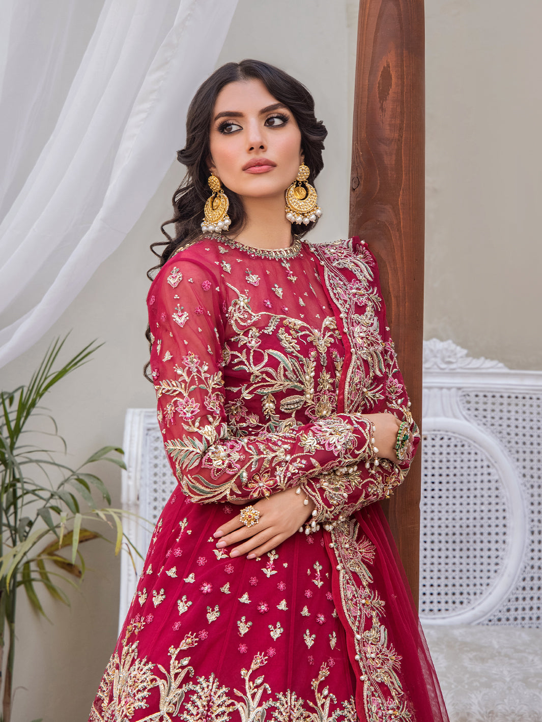 A splendid manifestation of enduring allure, behold this majestic creation unfurling upon delicate tulle, draped in a resplendent shade of deep crimson. In this timeless leghna choli ensemble, billowing yards of fabric cascade, each fold a testament to grace. Delicately adorned by the skilled hands of artisans, shimmering crystals and lustrous stones intertwine, meticulously etched to reveal a tapestry of enchantment fit for a celestial muse.