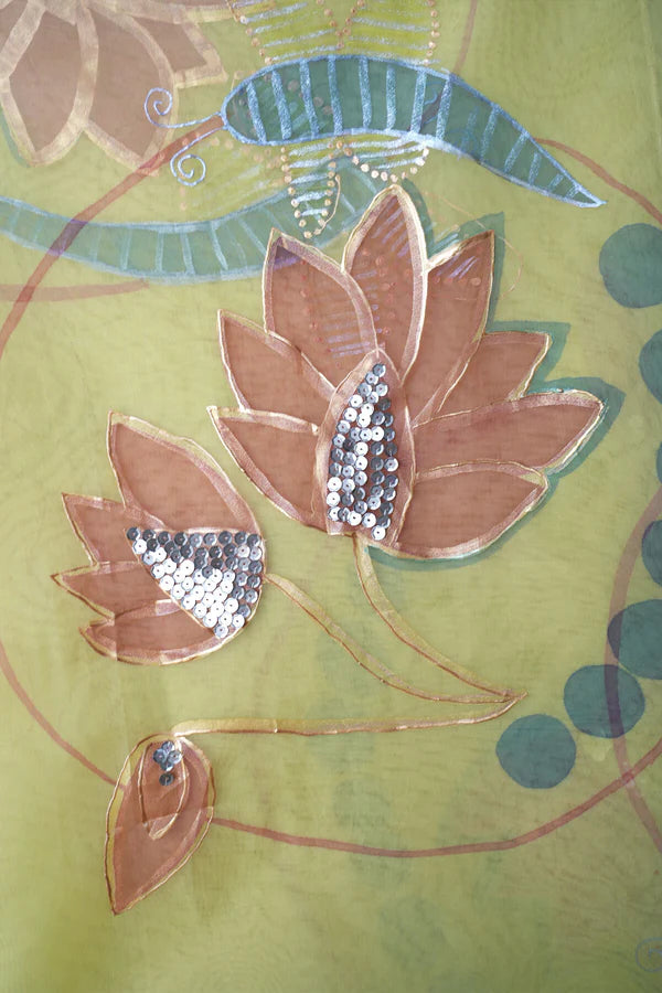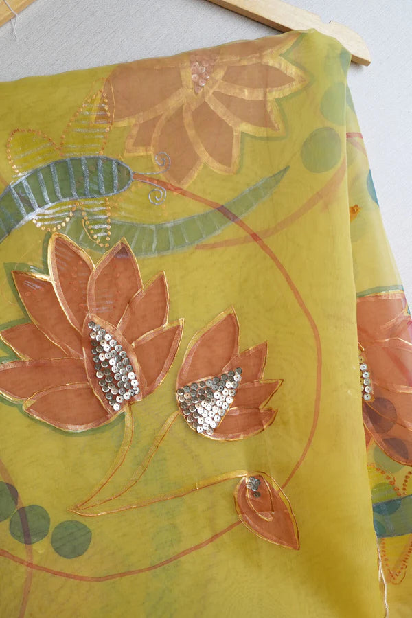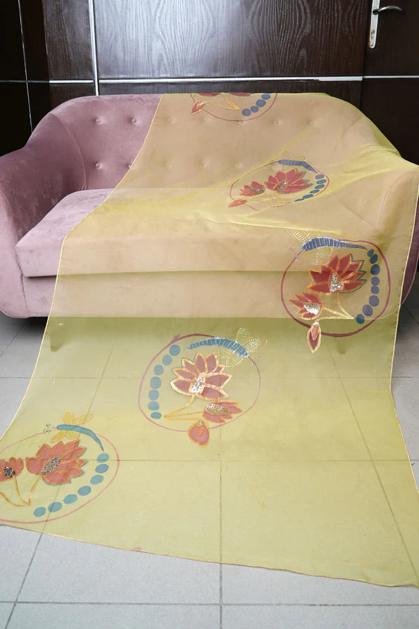 An amazing dupatta adorned with flowers and butterflies. The combination of hues creates a lively and awesome look, it’s a must-have addition to your wardrobe. Golden sequins and glitter work add to the shimmer, ensuring a captivating and unforgettable appearance. Make a style statement with the butterfly motif, unique blend of colors and mesmerizing embellishment.