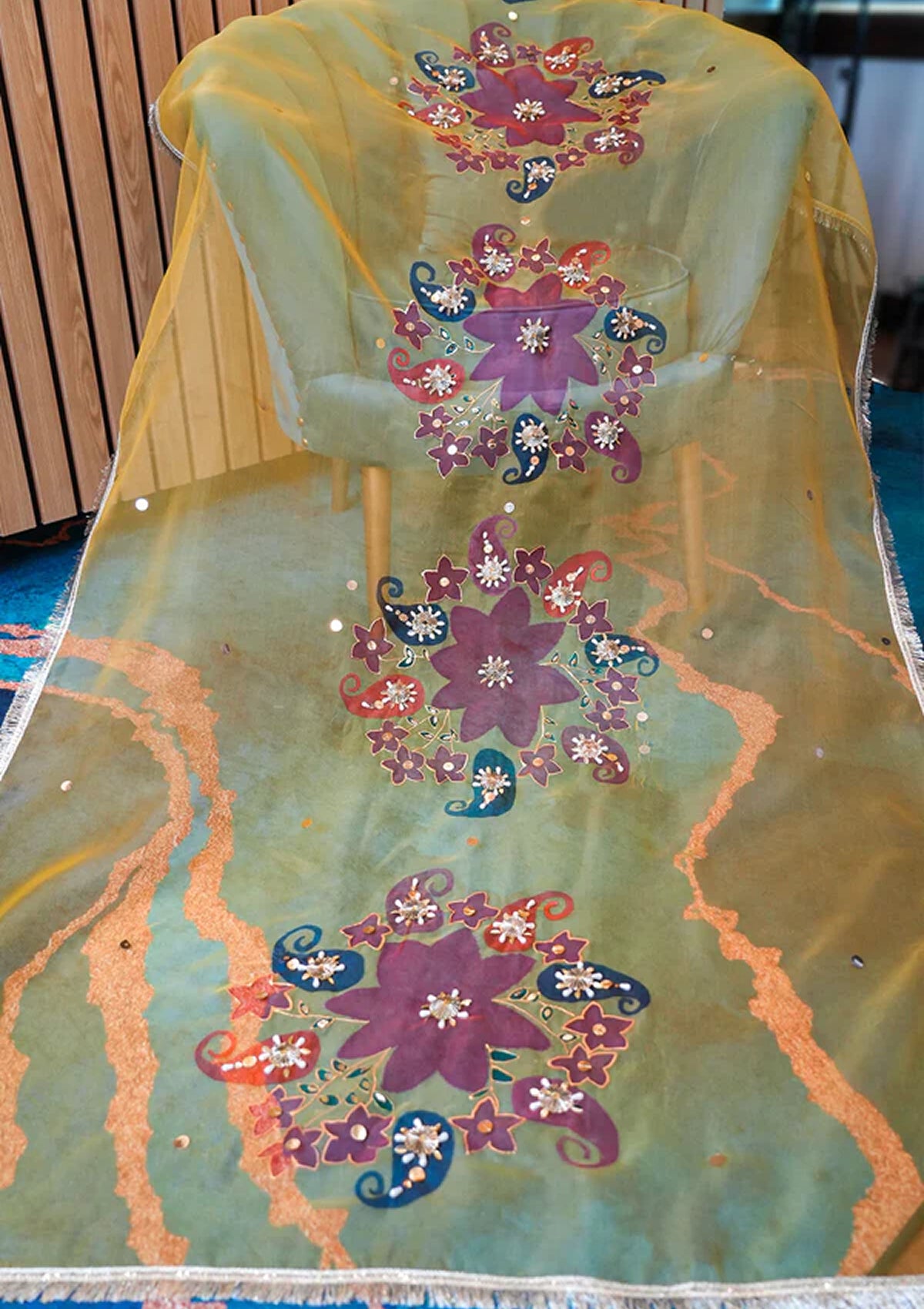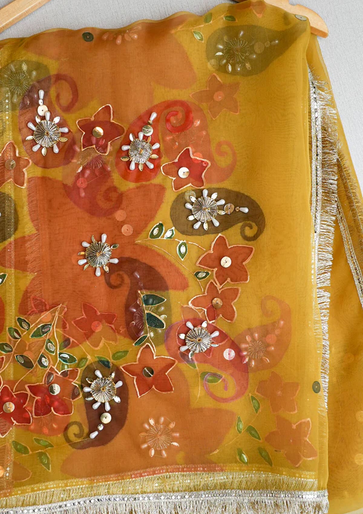 Enhance your attire with our stunning hand-painted designer dupatta in vibrant yellow. Featuring striking orange and black floral motifs, intricate green leaves, and a touch of golden detailing, this piece exudes elegance. Adorned with gotta work, shimmering golden sequins, pearls, and finished with golden kiran lace on the borders, it's a true statement of sophistication.