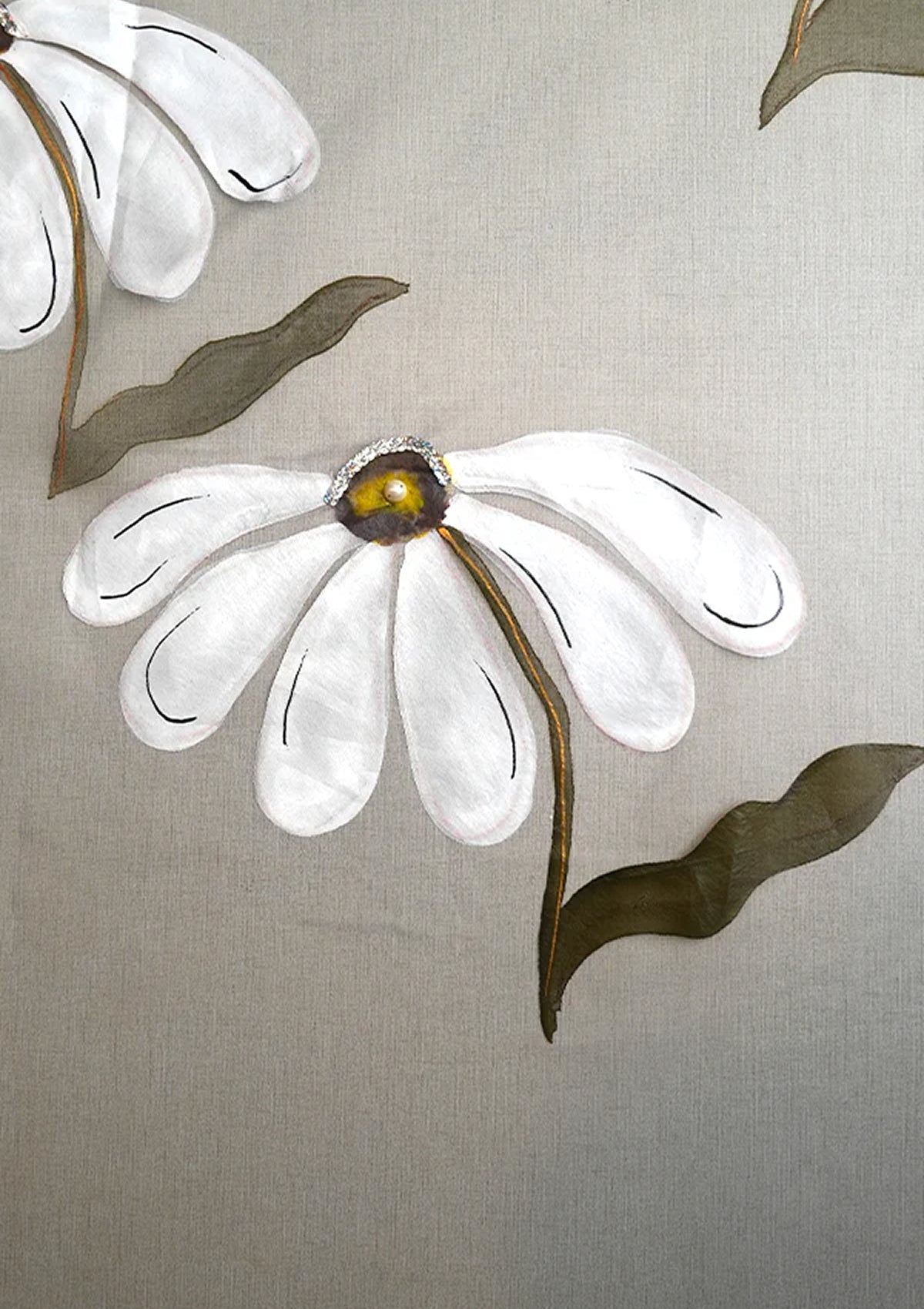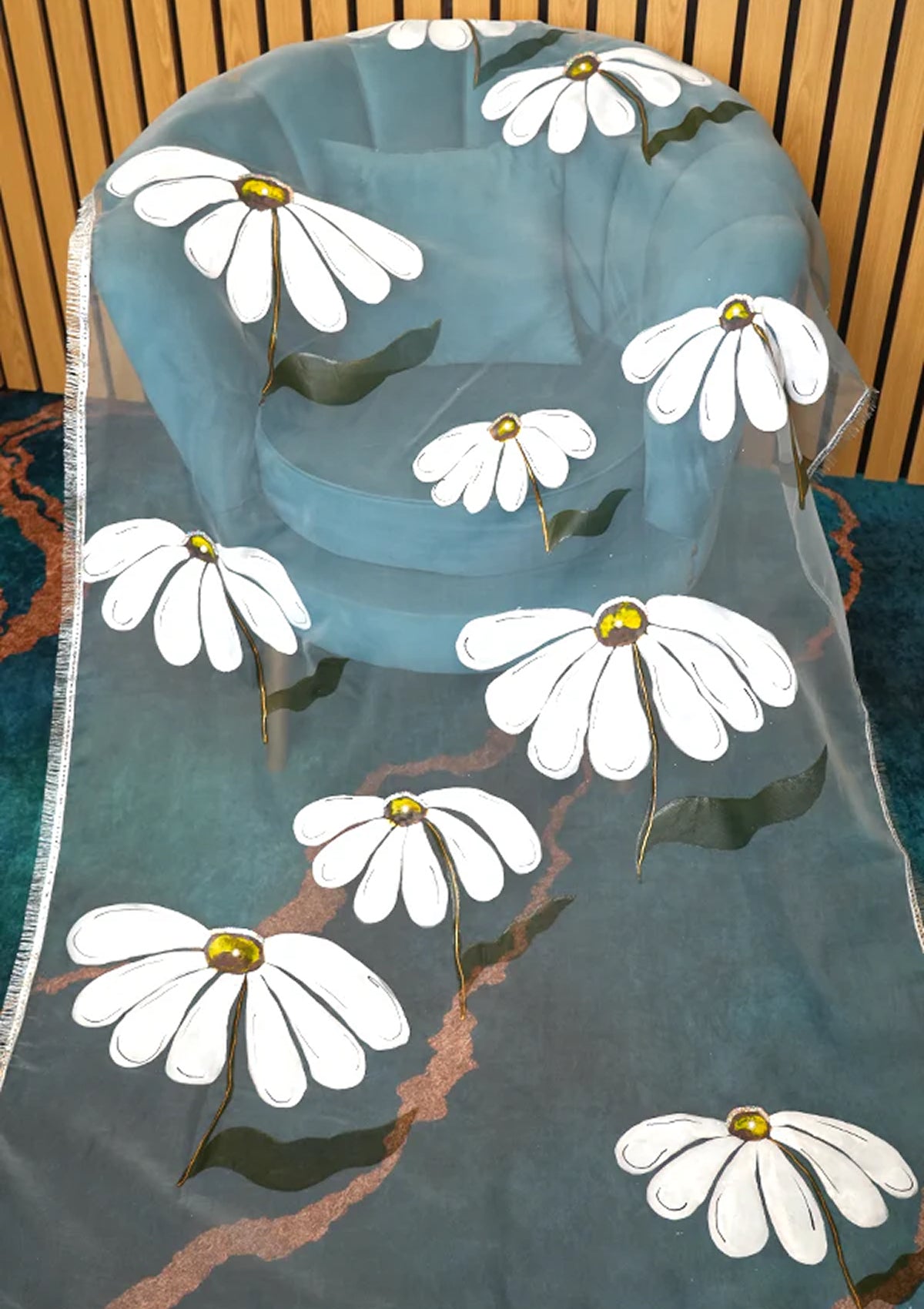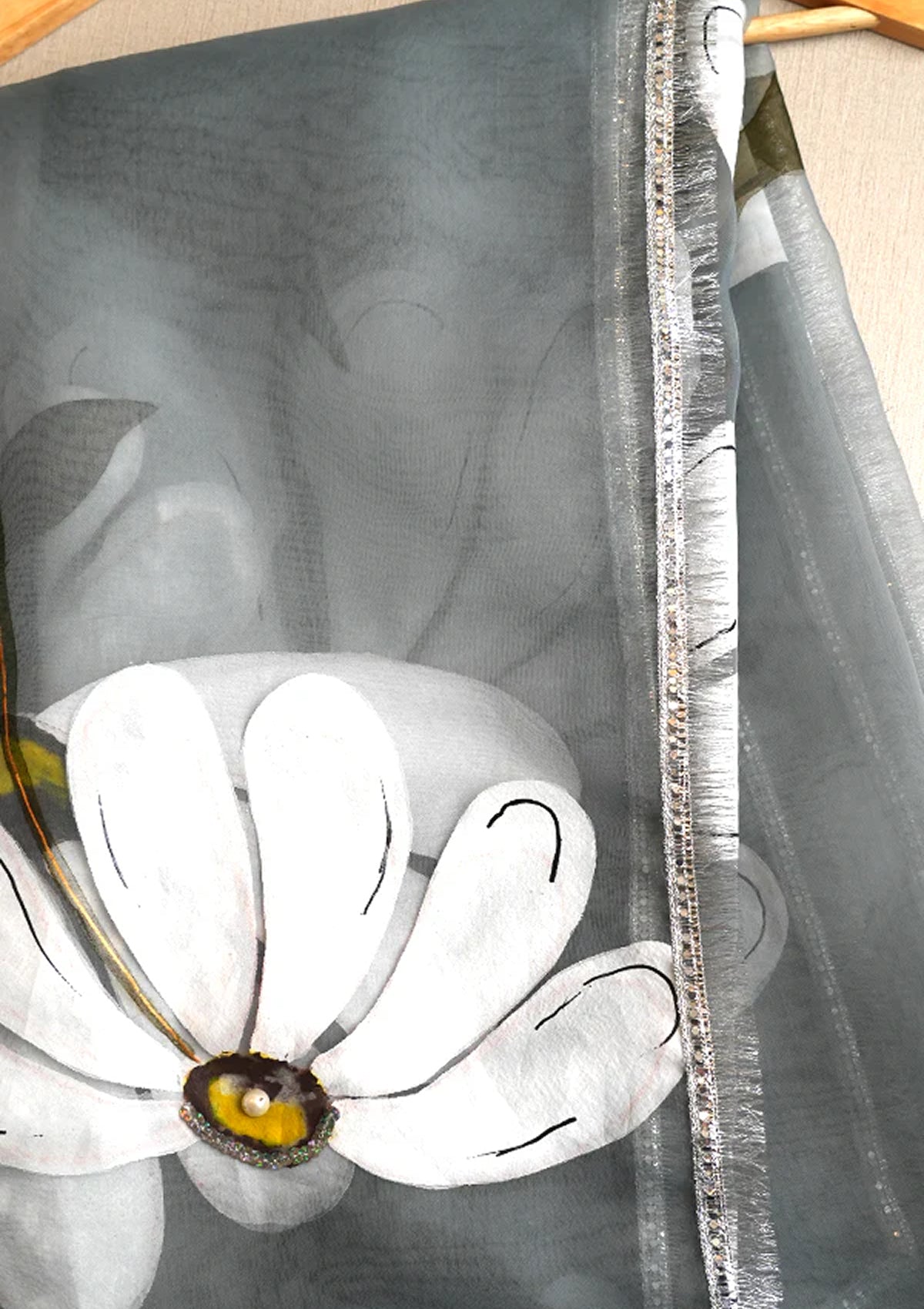 Look out of the world with our Bloom Leaf Designer Dupatta in a sophisticated light grey color with white flowers and a hint of yellow hue. The flowers are embellished with silver sequins & white pearls. The dupatta seamlessly combines the vibrancy of soft colors, sequins & silver kiran lace which adds glamour to the piece.
