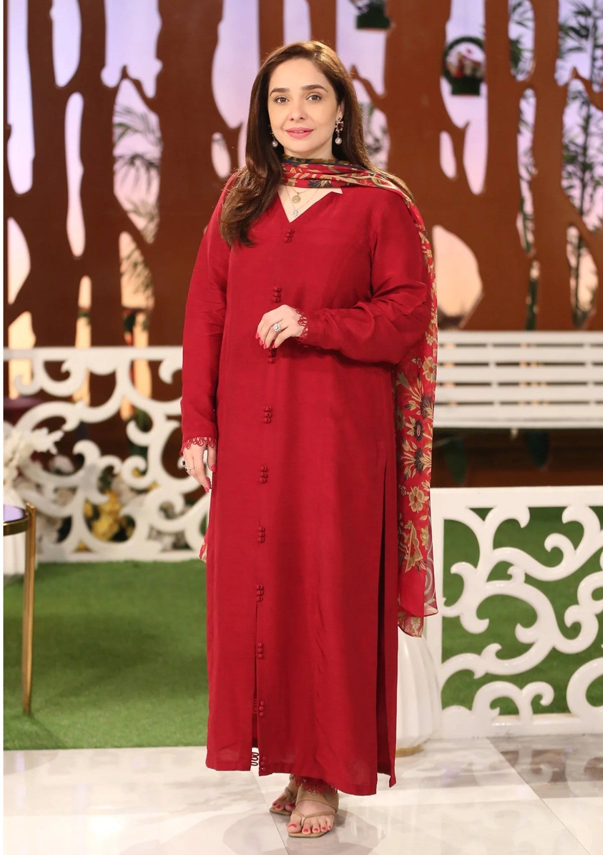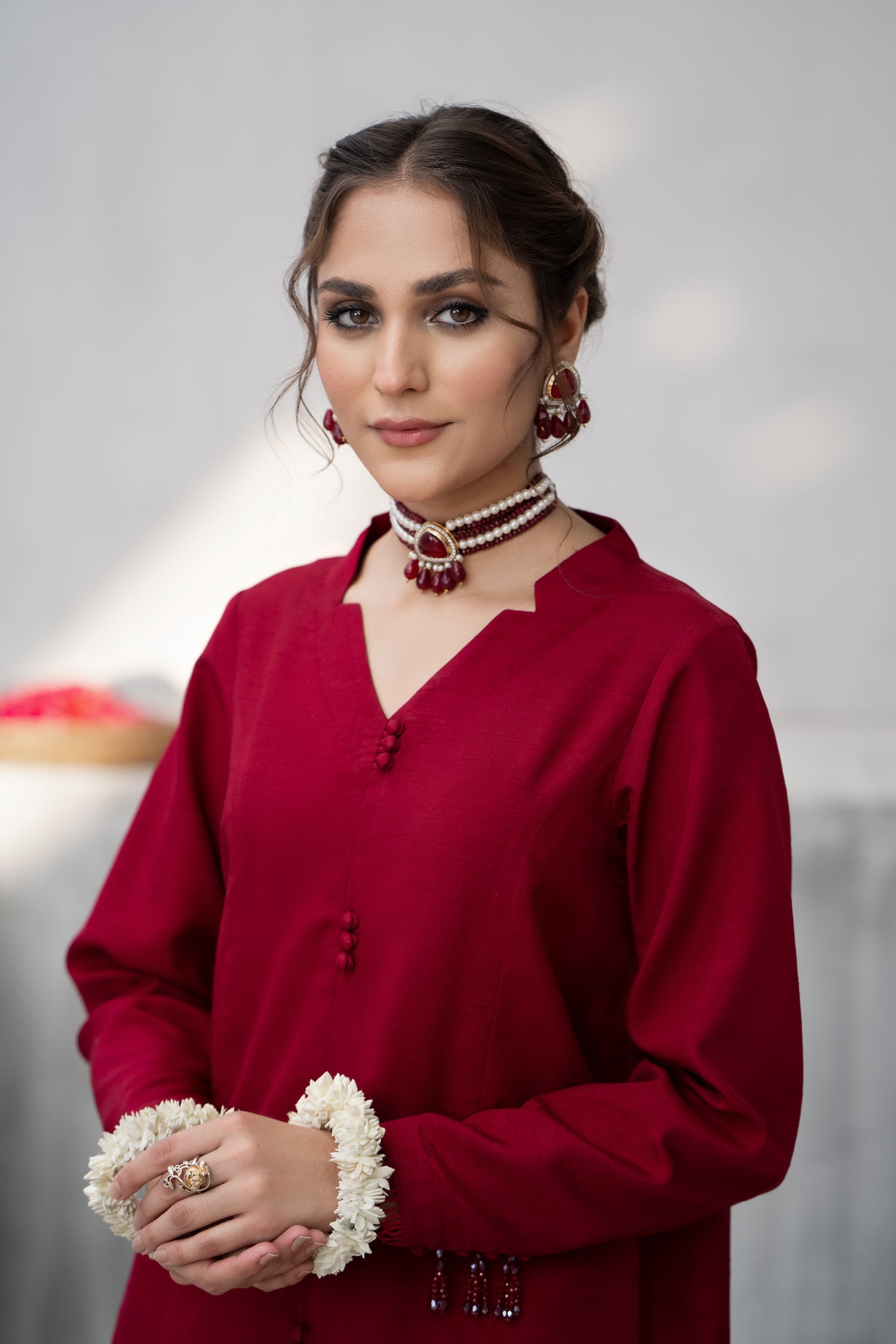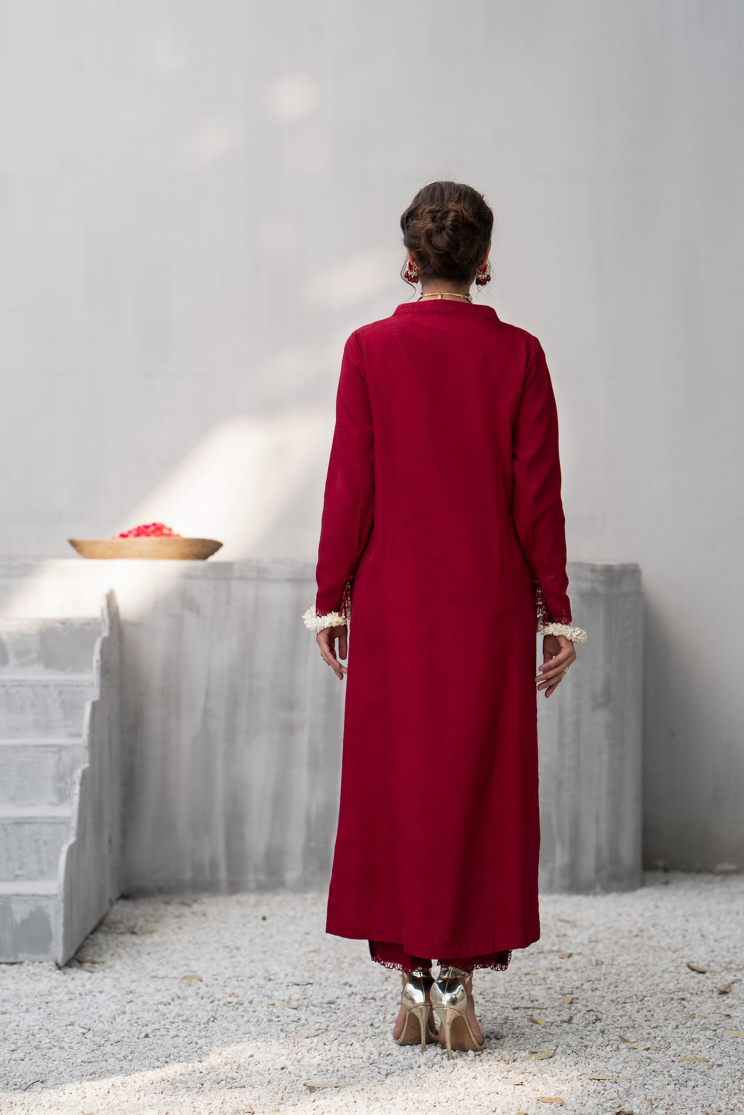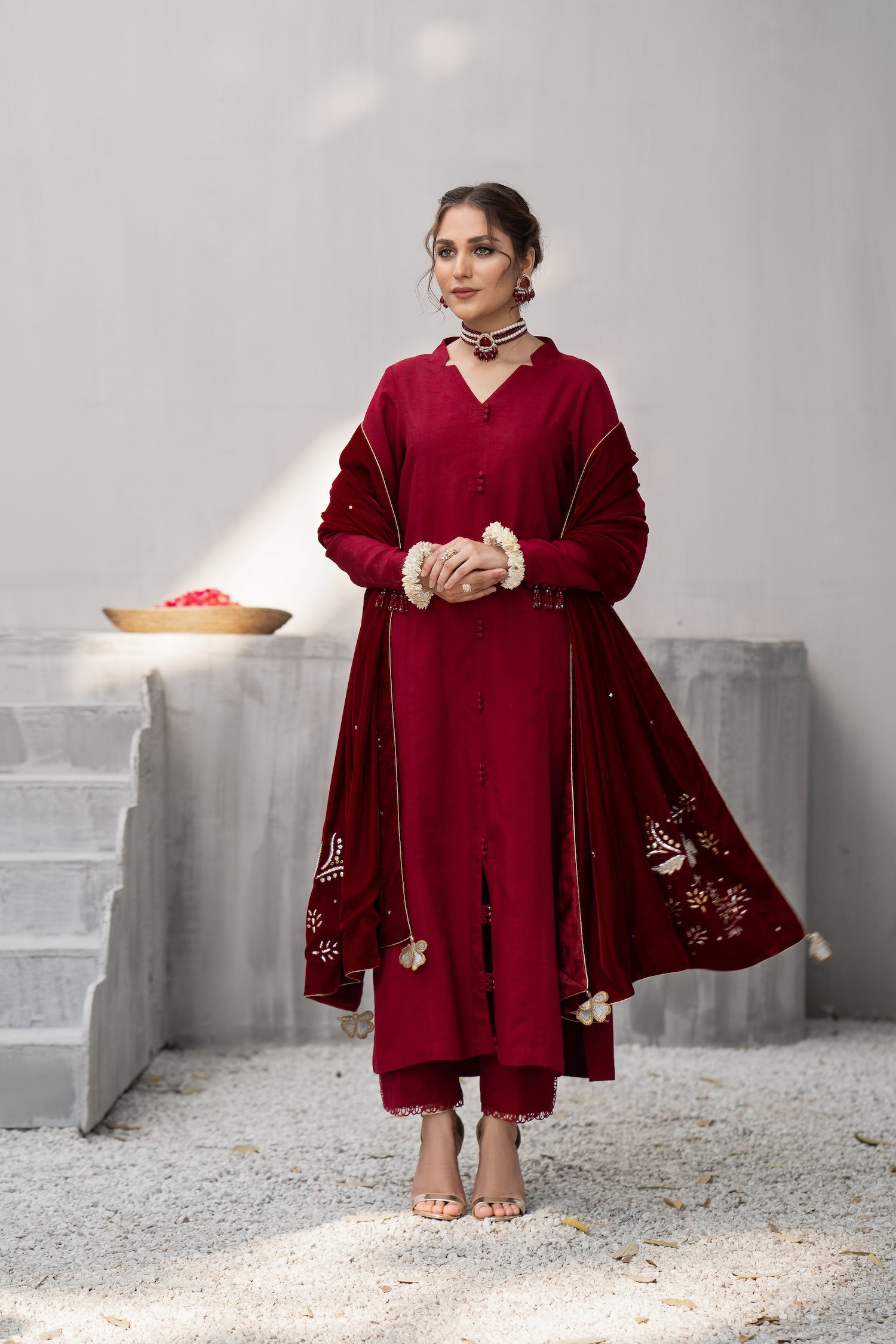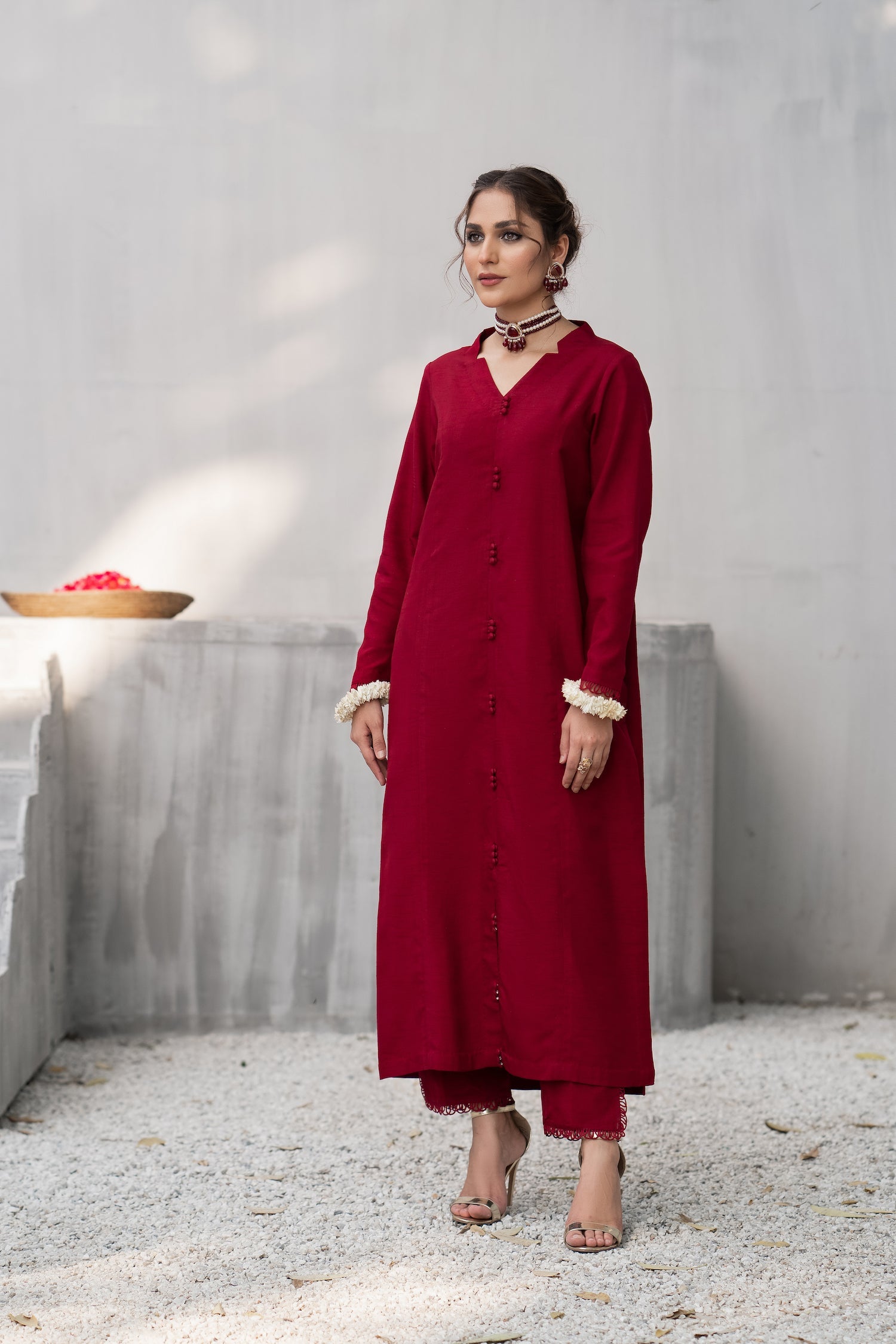 In a deep shade of red, this feminine and flattering silhouette top features a collared neckline forming a V-shape. The front open shirt features loops and buttons on the front. The fitted sleeves are adorned with lace and signature hand-made FK tassels made with crystals. Paired with straight pants having a side cut with a lace finish. This is a timelessly chic, must-have design for your wardrobe.