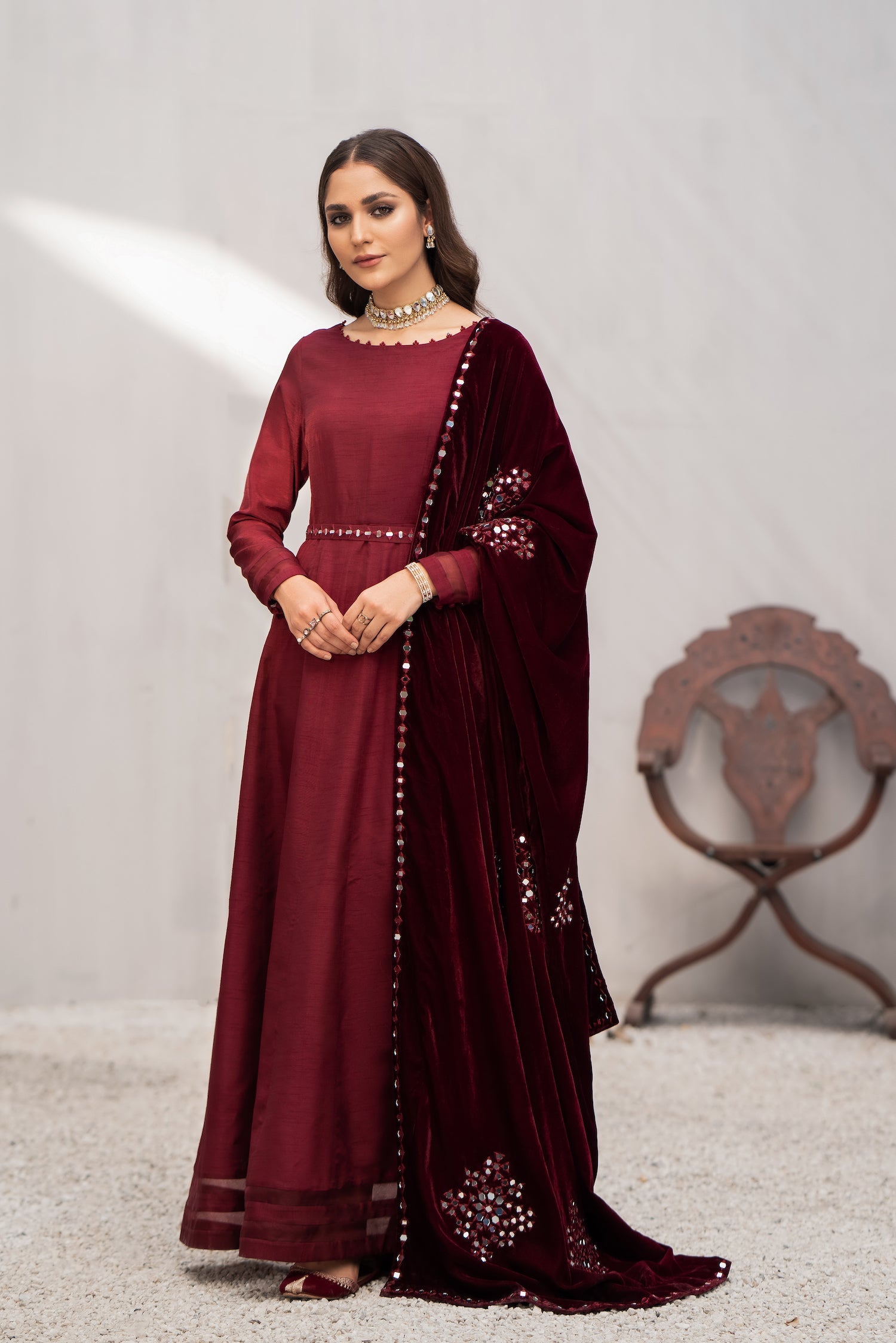 In an alluring shade of red, this pishwas features a round neckline adorned with crystals. The fitted sleeves and border feature organza detailing. Paired with a hand-made mirror work belt to complete the look. This outfit is truly a timeless piece. Paired with straight pants.