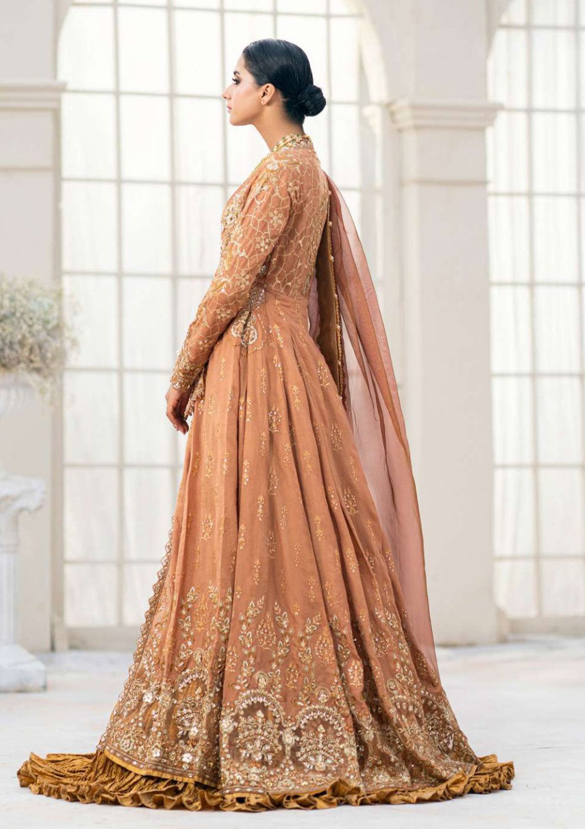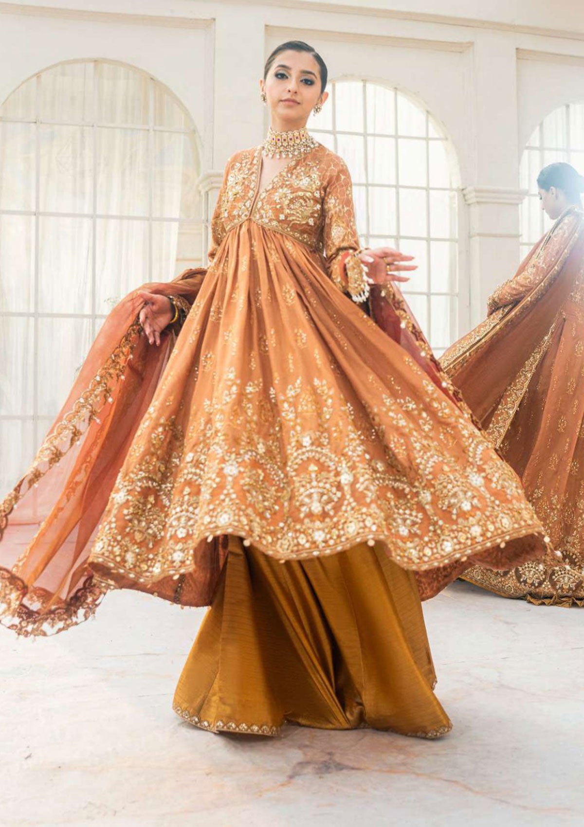 A warm embrace of burnt sienna khaadi net. The bodice is composed of an intricate gold jaal set against elaborate arrangements of flora and fauna, encrusted with glittering embellishments, while the hems feature ornate Rococo-inspired motifs. Gold lace accents the neckline adding an extra touch of regal charm to this exquisite Look.