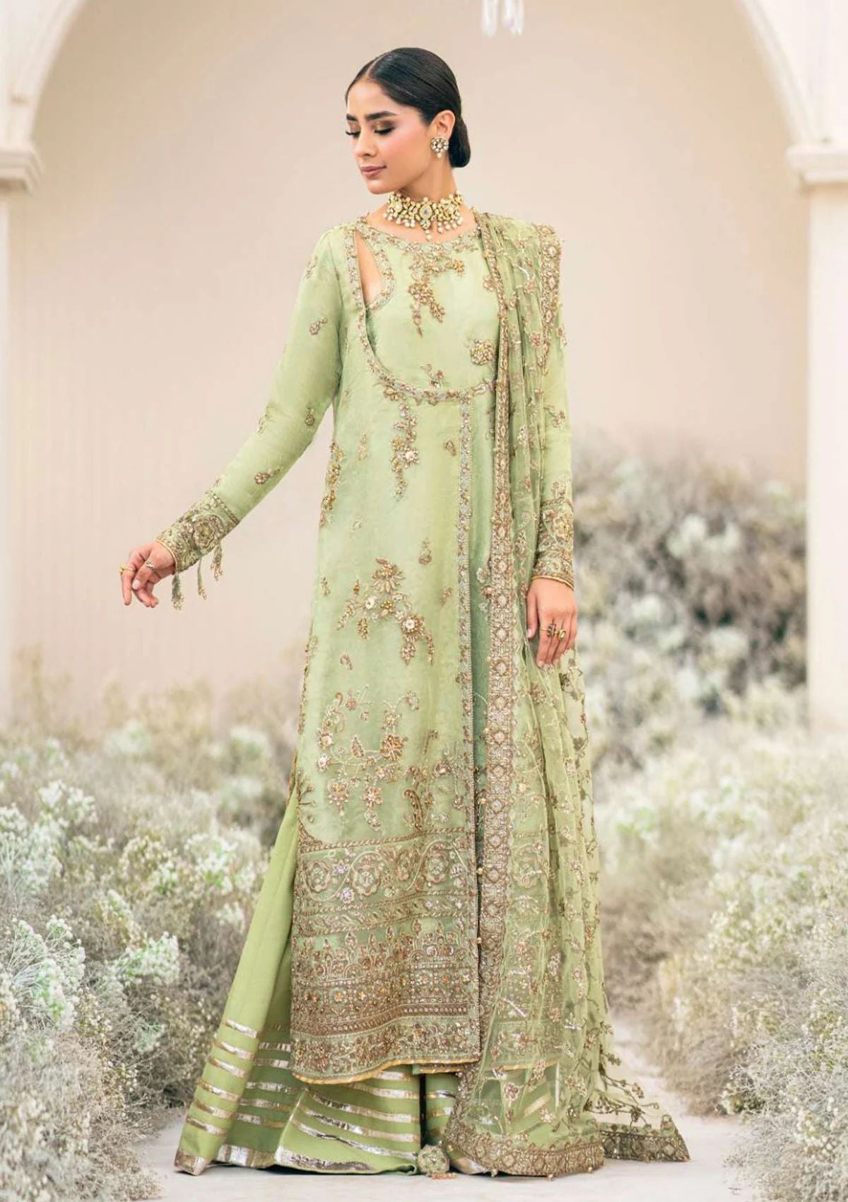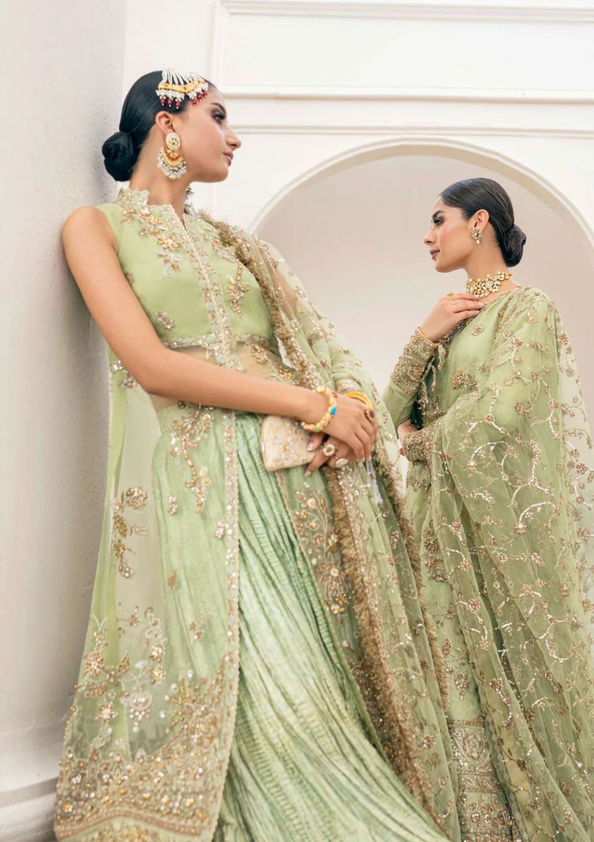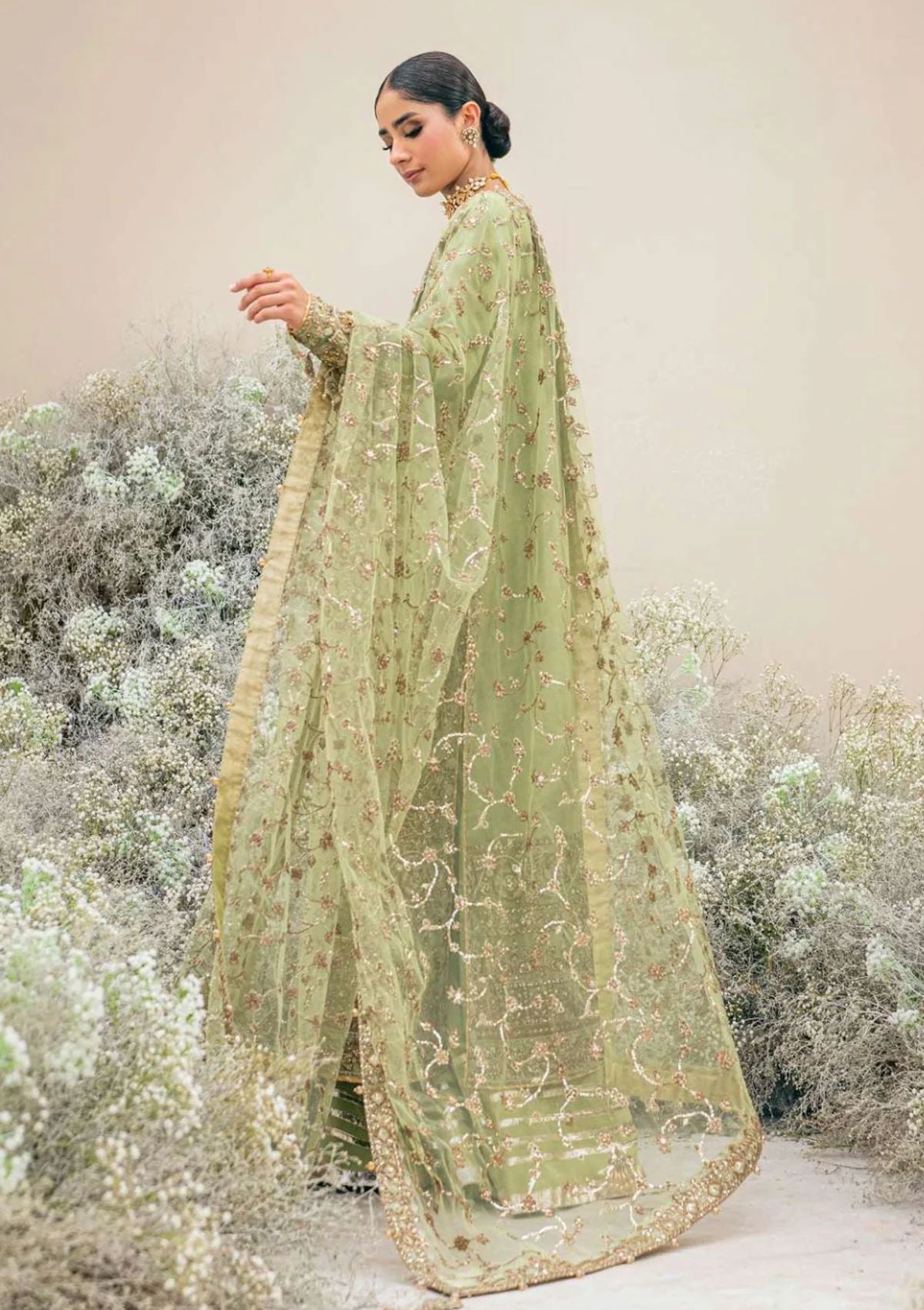An enchanting chartreuse organza base in a harmonious fusion of understated elegance. Free-flowing and organic adornments of gold-dipped embroideries are composed on the shirt, with bronzed beads and crystals used to hand embellish the motifs. The pièce de résistance lies in the border, laden with lavish embellishments, reminiscent of antique craftsmanship decorate the ensemble, crafting a striking contrast against the soothing green palette.