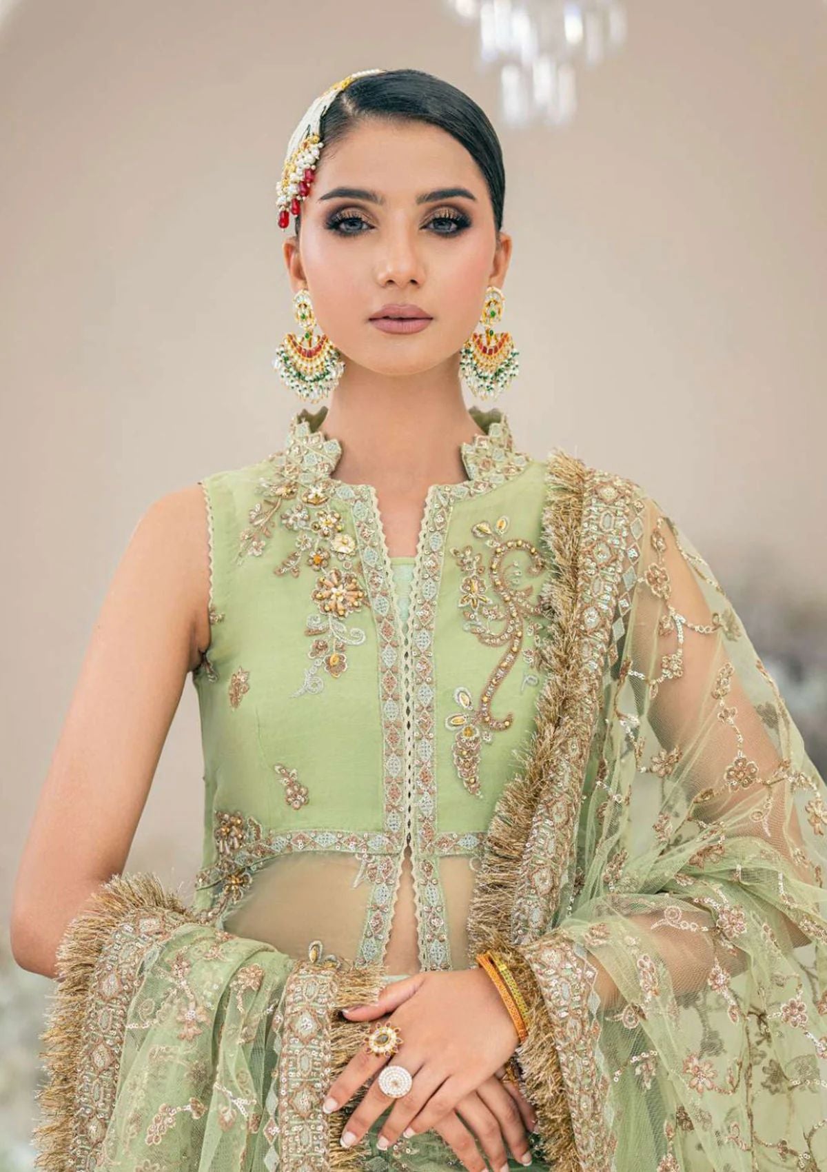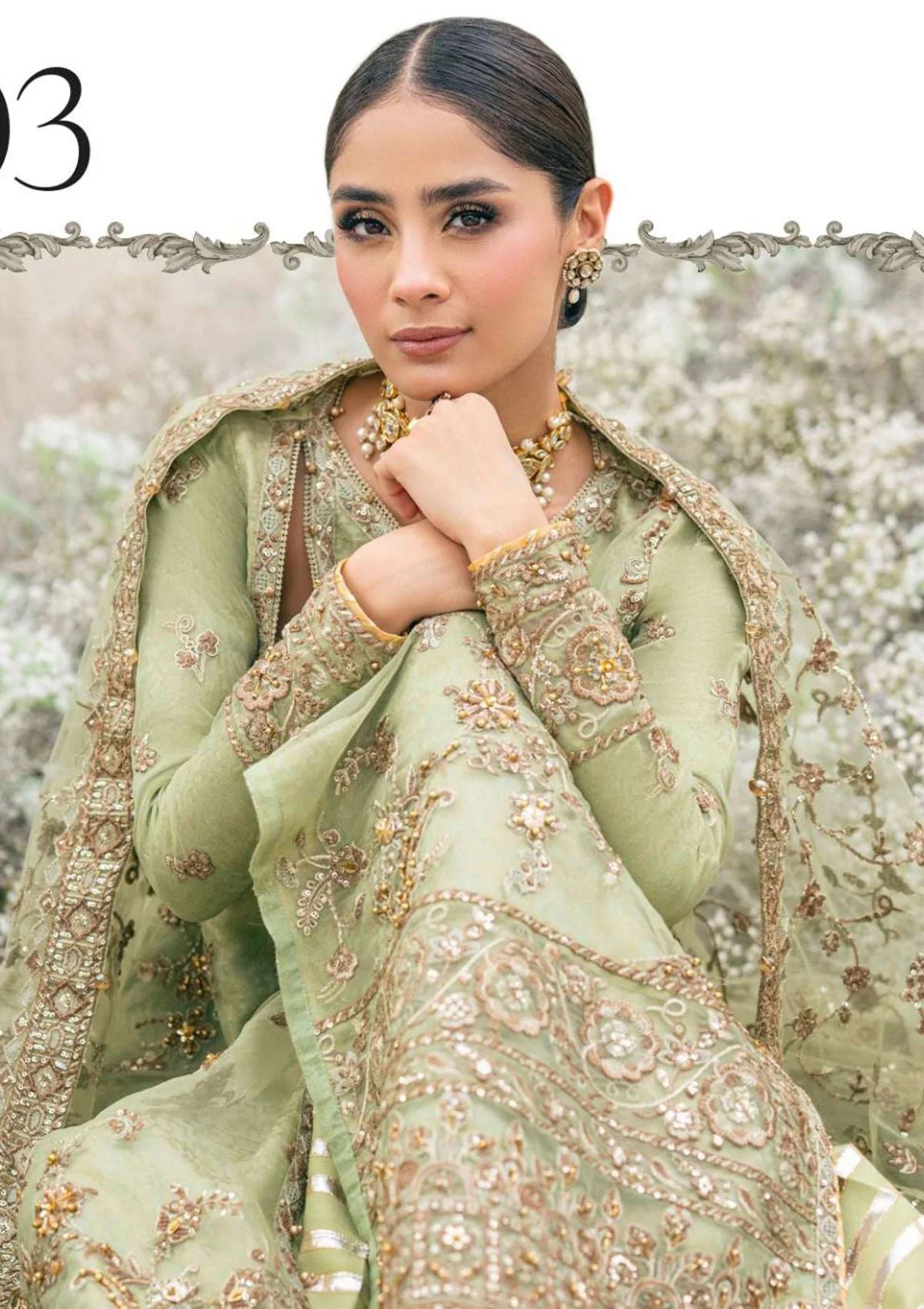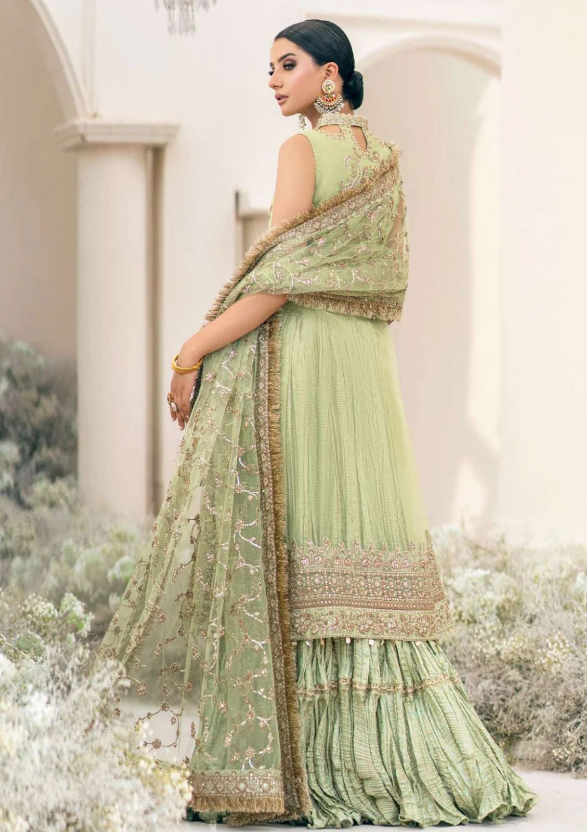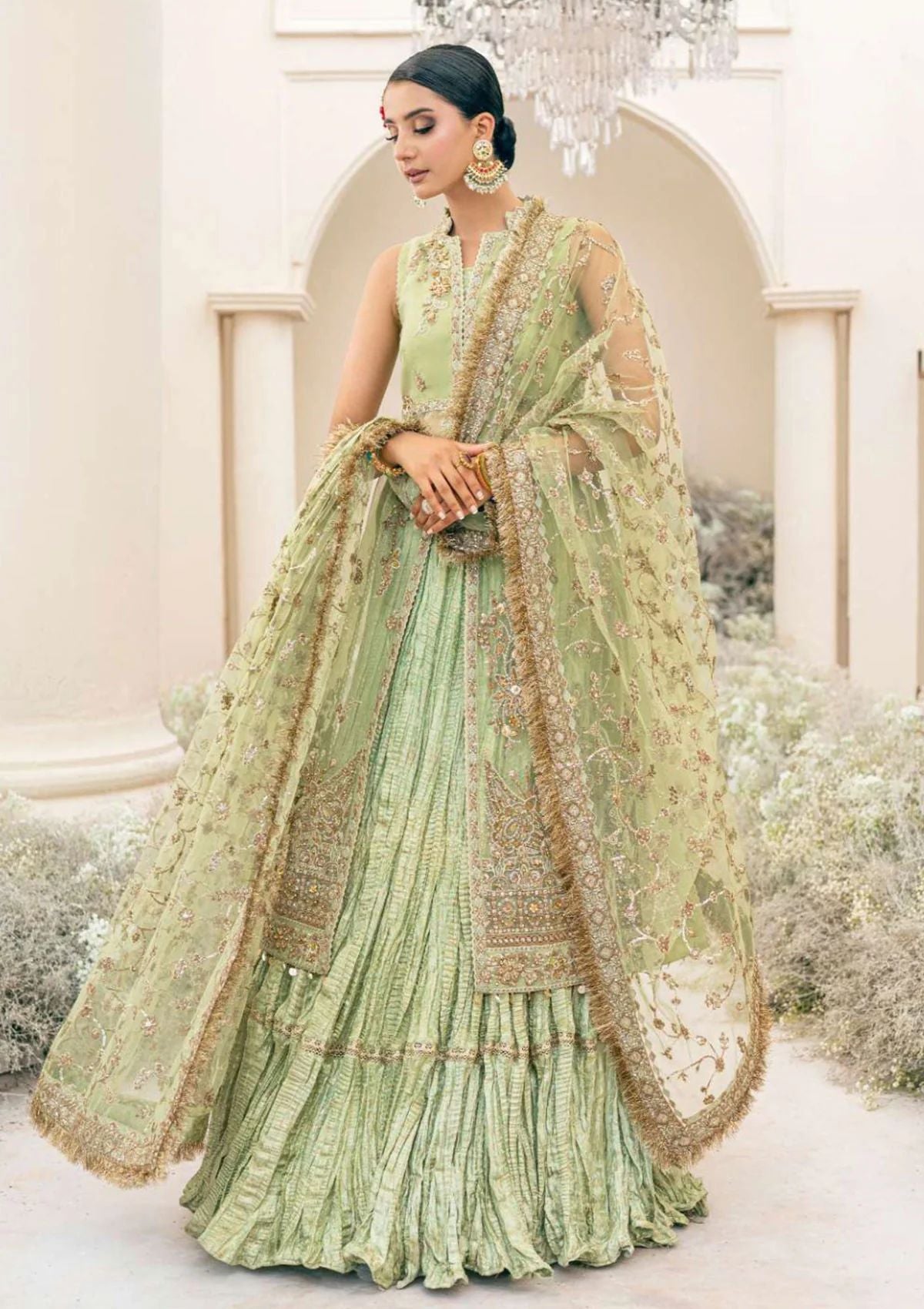 An enchanting chartreuse organza base in a harmonious fusion of understated elegance. Free-flowing and organic adornments of gold-dipped embroideries are composed on the shirt, with bronzed beads and crystals used to hand embellish the motifs. The pièce de résistance lies in the border, laden with lavish embellishments, reminiscent of antique craftsmanship decorate the ensemble, crafting a striking contrast against the soothing green palette.