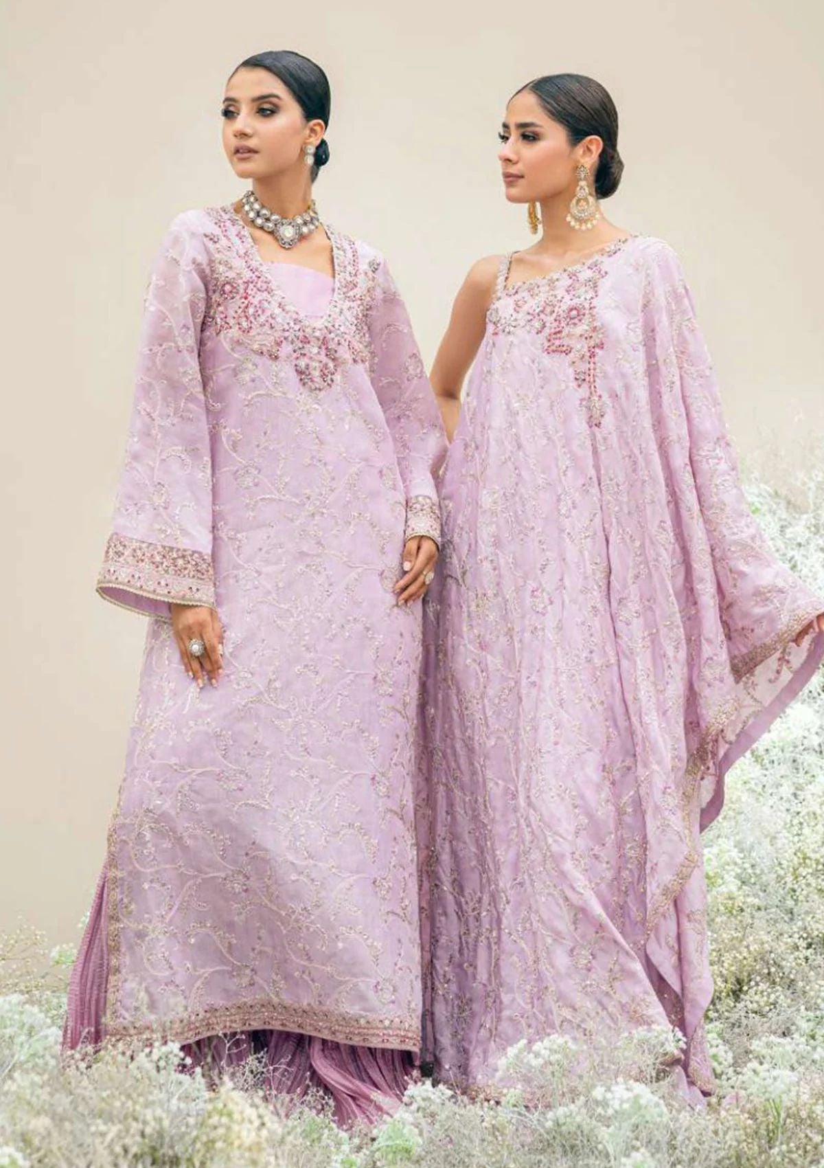 Periwinkle crystals sparkle in this delicate and feminine pastel Look imagined on a plush silk canvas. A running design of intricate embellishments and shimmering sequins graces the fabric, creating a captivating interplay of glimmer and texture. Lace-like embroideries delicately adorn the hem, adding an ethereal touch to the ensemble. Giving this subtle look the final oomph is silk masoori pants.