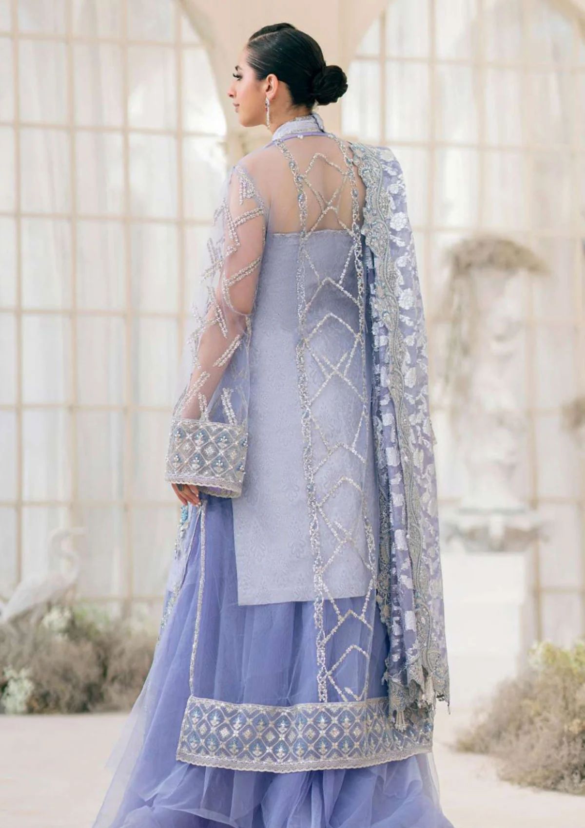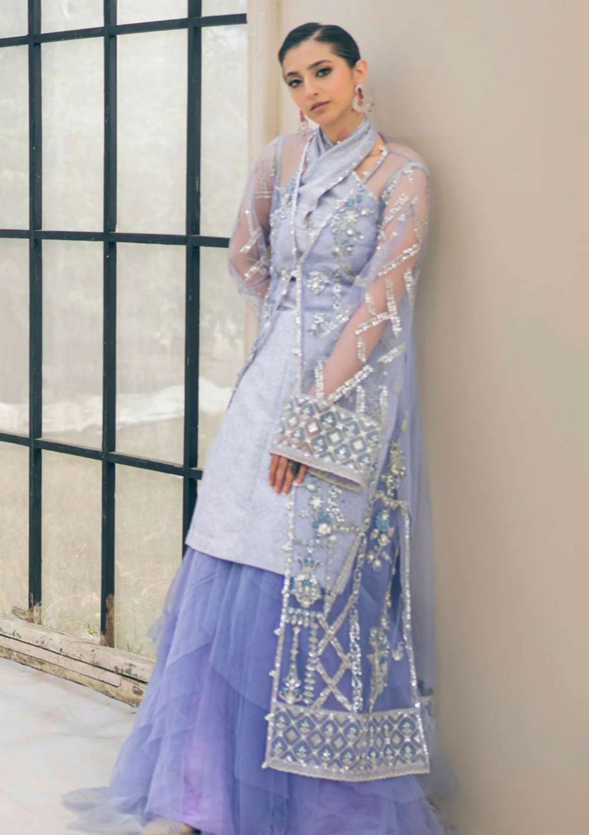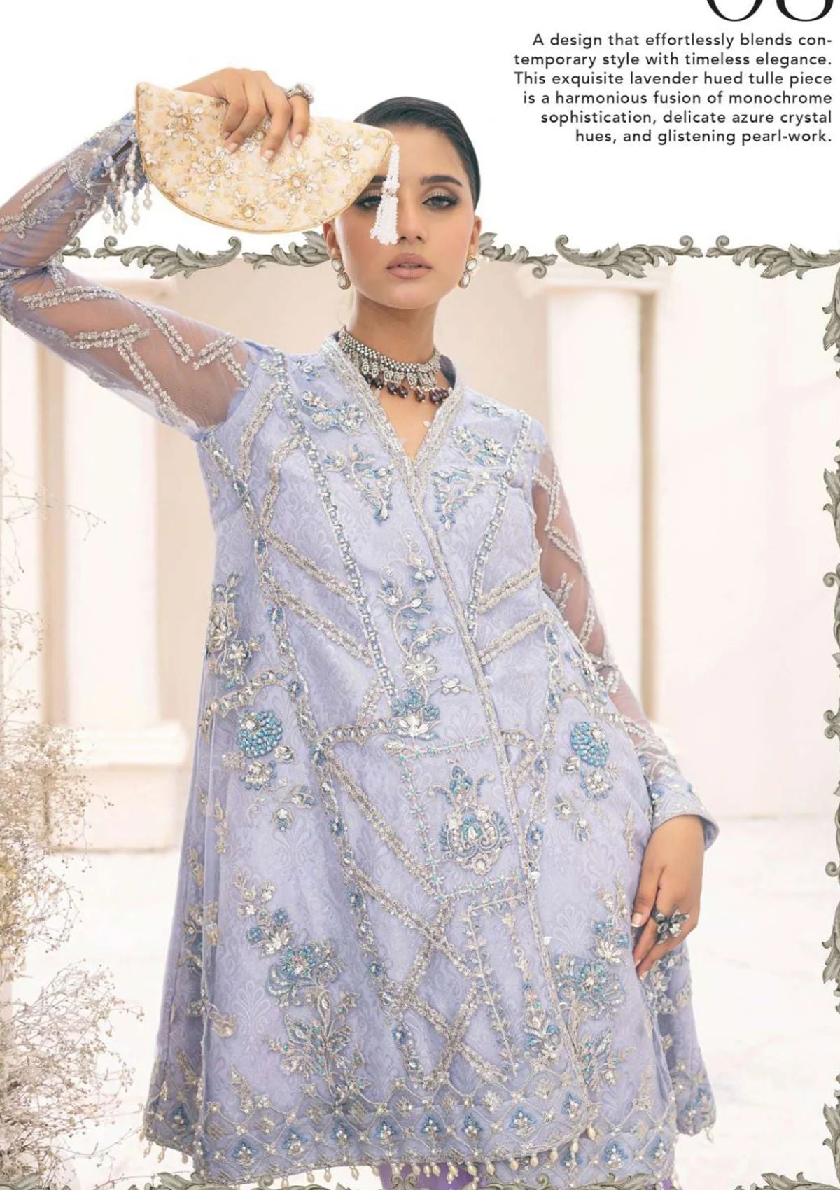A design that effortlessly blends contemporary style with timeless elegance. This exquisite lavender-hued tulle piece is a harmonious fusion of monochrome sophistication, delicate azure crystal hues, and glistening pearl-work. The shirt features a composition of elaborate ornaments suspended across an intricate framework of tilla-infused patterns, creating a mesmerizing interplay of colors. Details of blue and white beads and an array of sparkling sequins are scattered across the design.