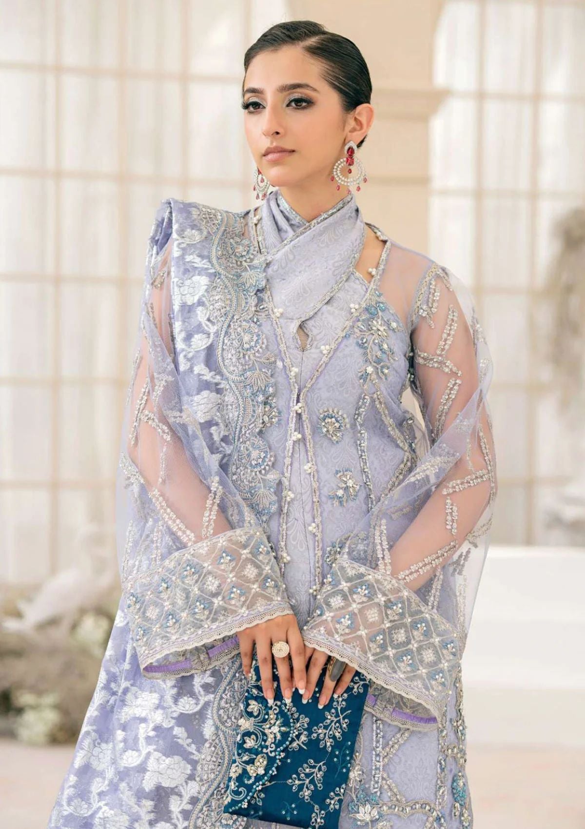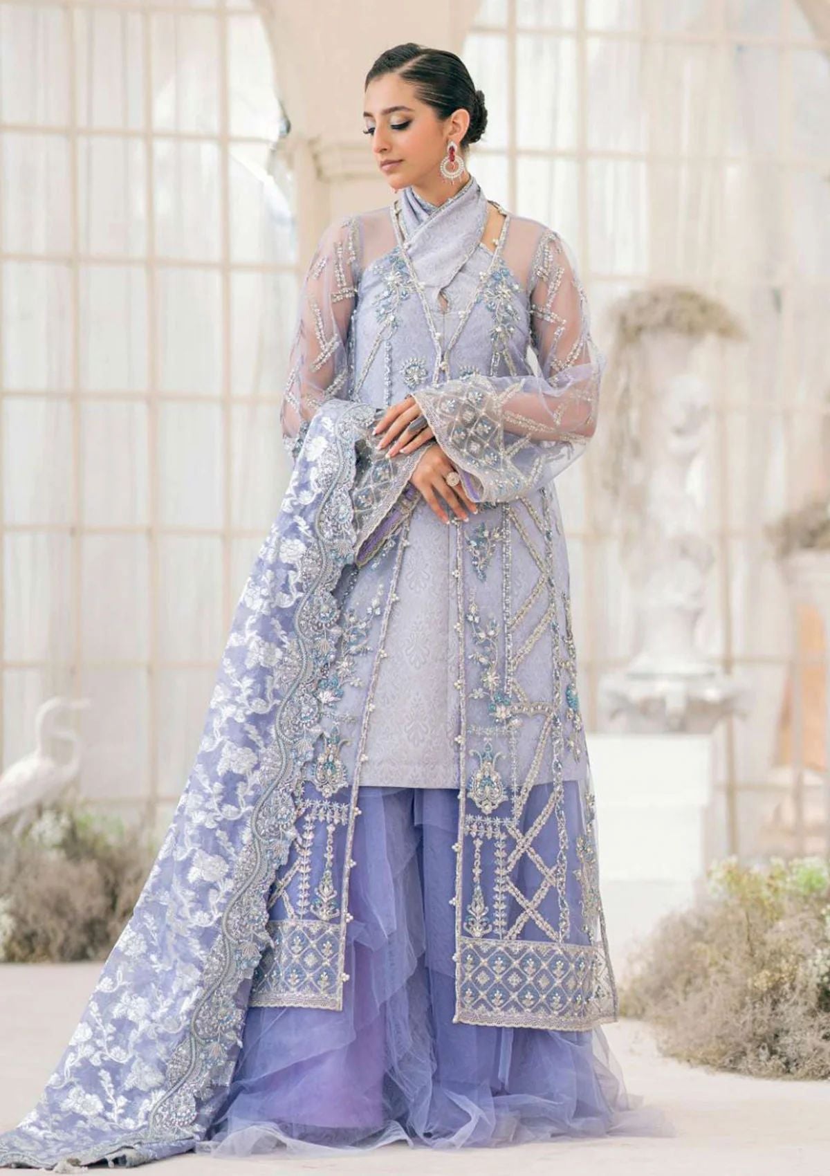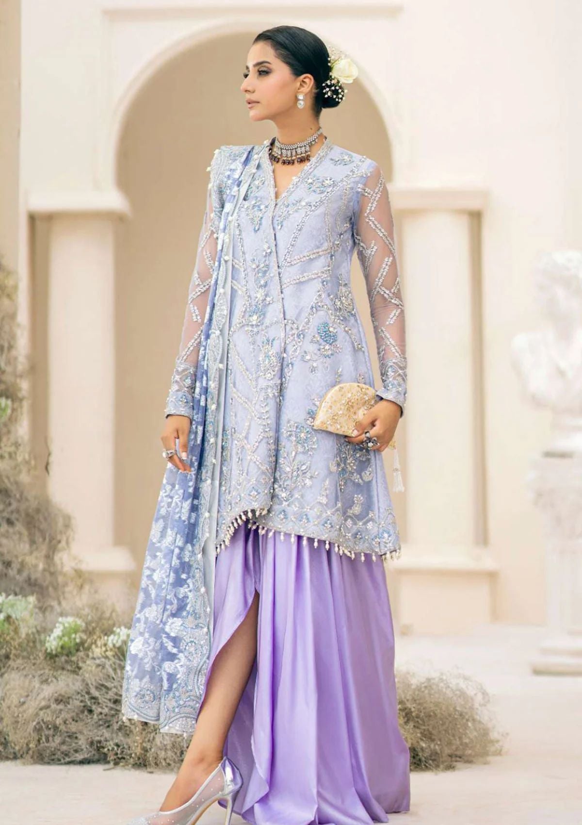 A design that effortlessly blends contemporary style with timeless elegance. This exquisite lavender-hued tulle piece is a harmonious fusion of monochrome sophistication, delicate azure crystal hues, and glistening pearl-work. The shirt features a composition of elaborate ornaments suspended across an intricate framework of tilla-infused patterns, creating a mesmerizing interplay of colors. Details of blue and white beads and an array of sparkling sequins are scattered across the design.