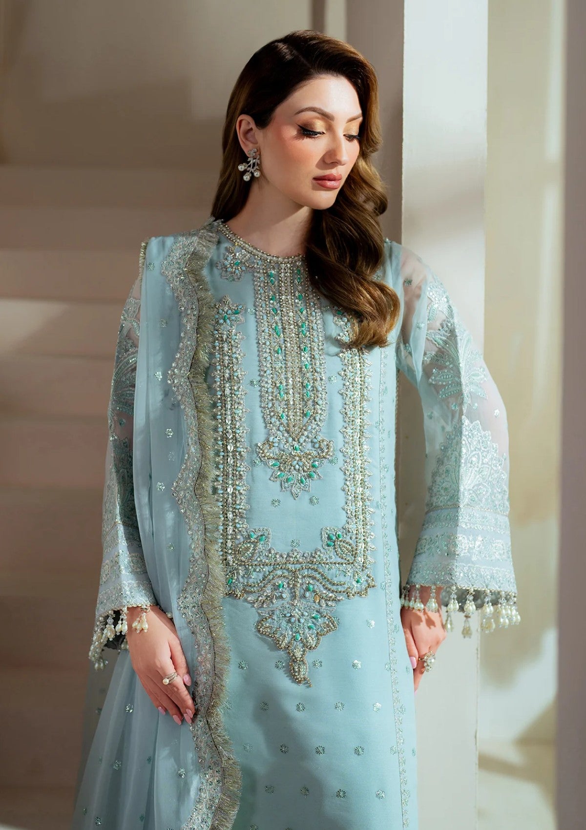 Make a statement in this ice blue “Orla” outfit, designed from luxurious bamber chiffon and adorned with intricate hand embellishments in contrasting hues, complemented by delicate sequins that add a subtle shimmer. The neckline features exquisite aqua blue handwork, while the embroidered sleeve borders elevate its captivating details. Paired with printed raw silk trousers and an embroidered chiffon dupatta with contrasting borders, this ensemble is the perfect choice for making lasting memories on special occasions.
