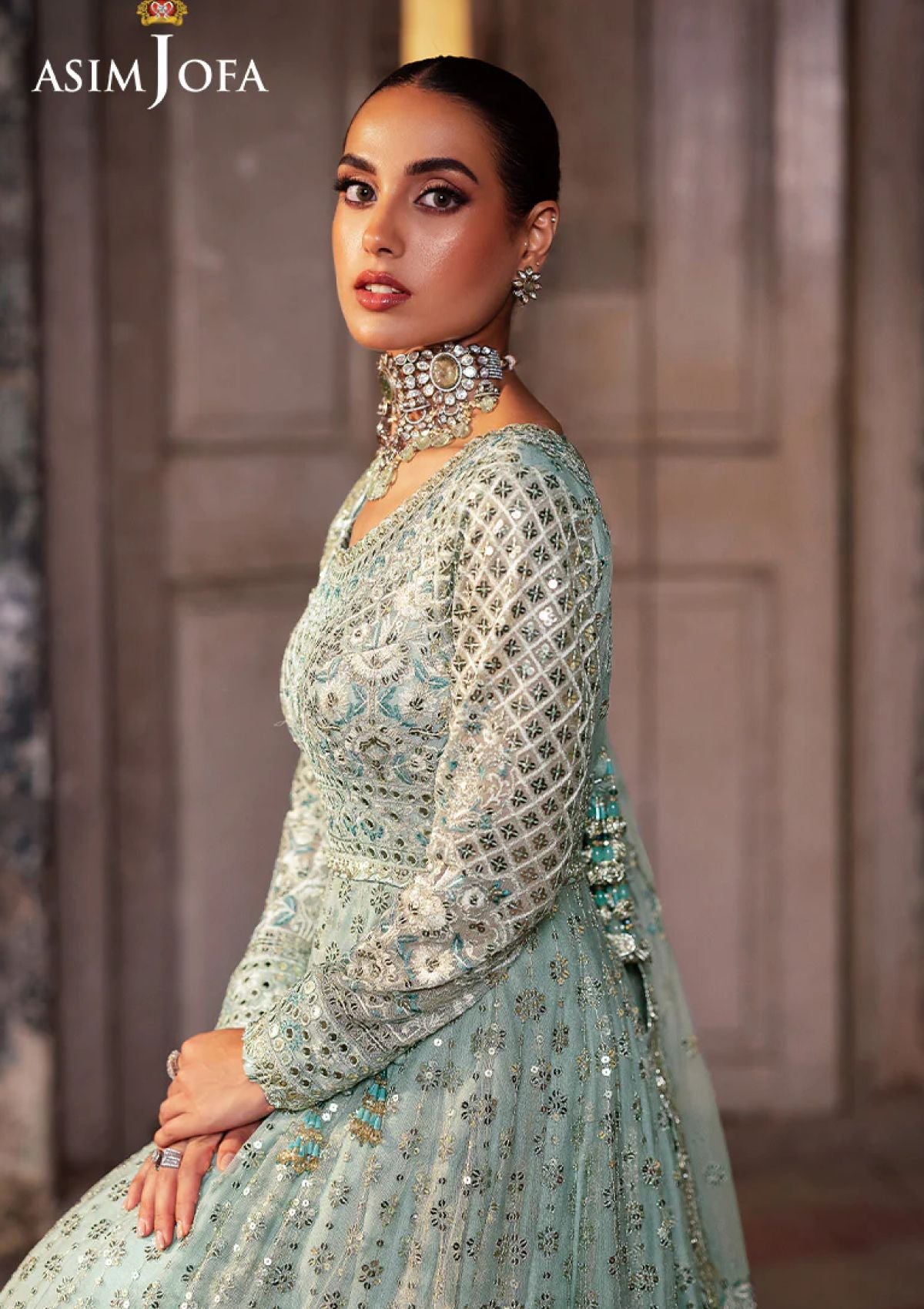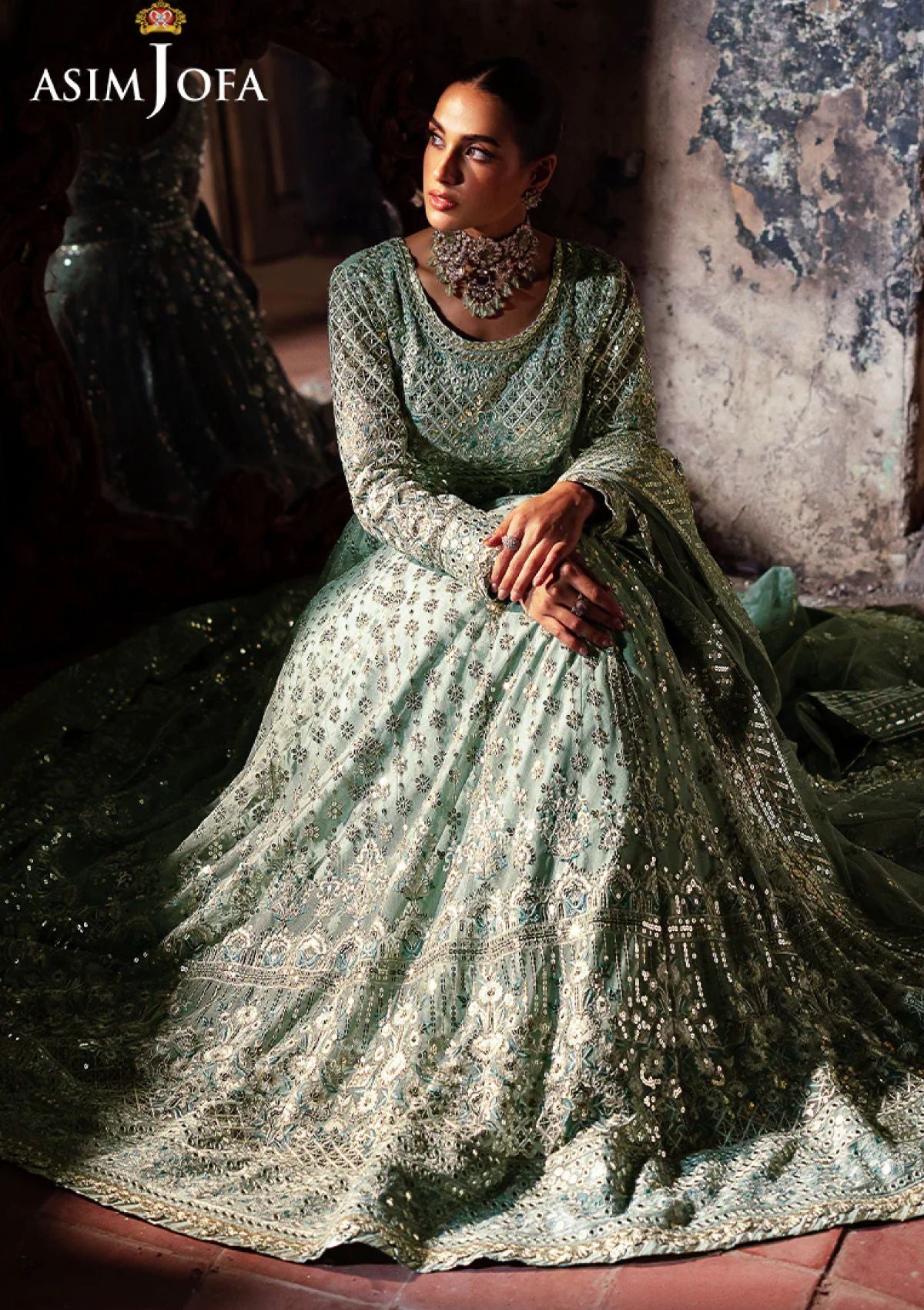 Bathed in the soft radiance of an ice blue sky, this ensemble is a waking dream. The exquisite Peshwas, a marvel of intricate embroidery, glows with gold zariwork that twinkles like starlight, interwoven with clusters of light gold sequins in 5mm and 9mm sizes. Shades of mint green, deep mint, and off-white threads blend seamlessly, creating a celestial vision. Draped in an embroidered dupatta like a gentle cloud of elegance, this ensemble is nothing short of picture-perfect.
