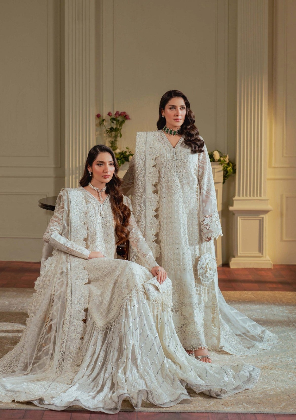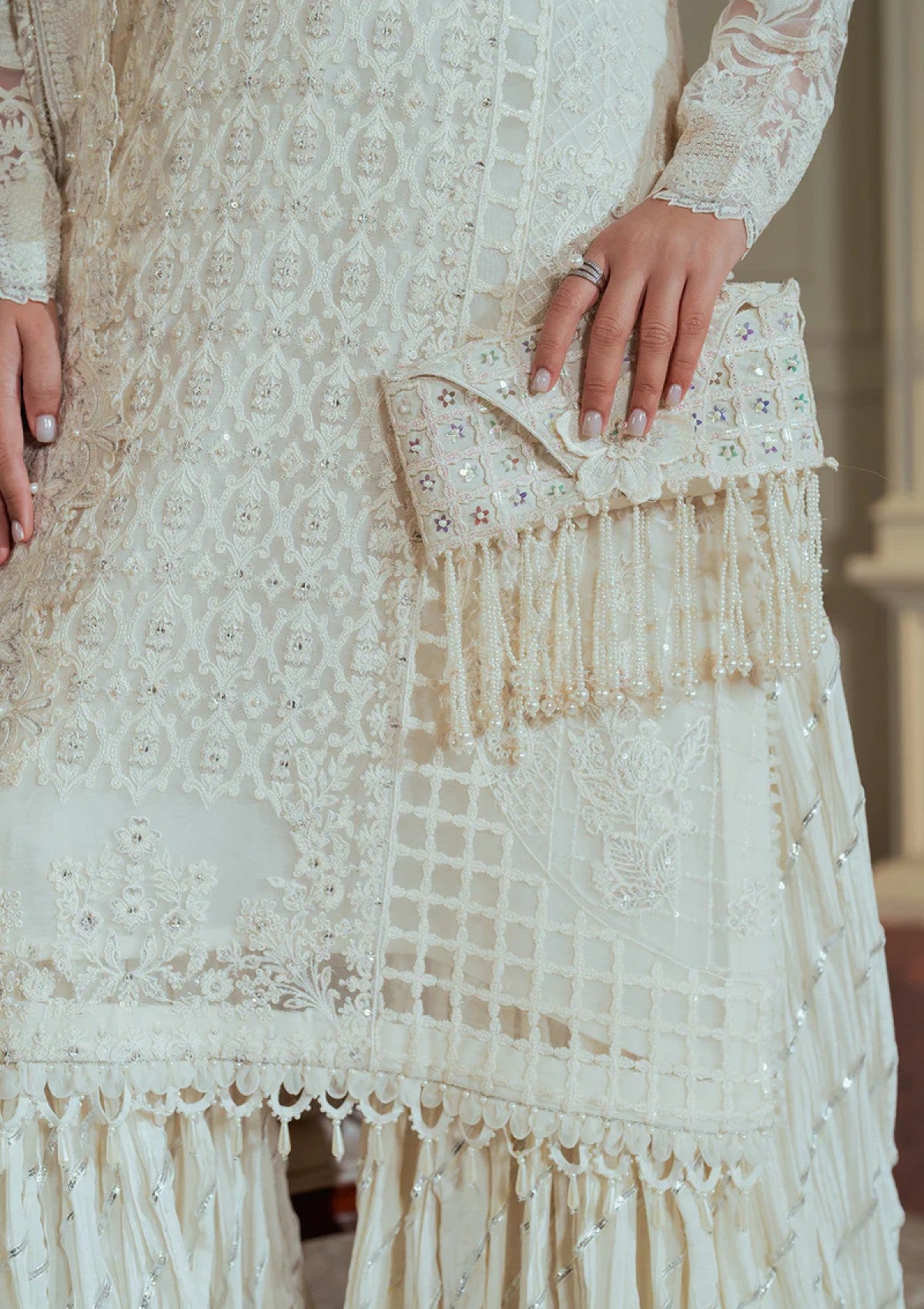 The outfit is completed with a luxurious net dupatta, bordered with white on white embroidery, which drapes beautifully, enhancing the outfit’s overall grace. The dupatta, adorned with intricate embroidery, perfectly balances the ensemble's richness and adds an ethereal quality.