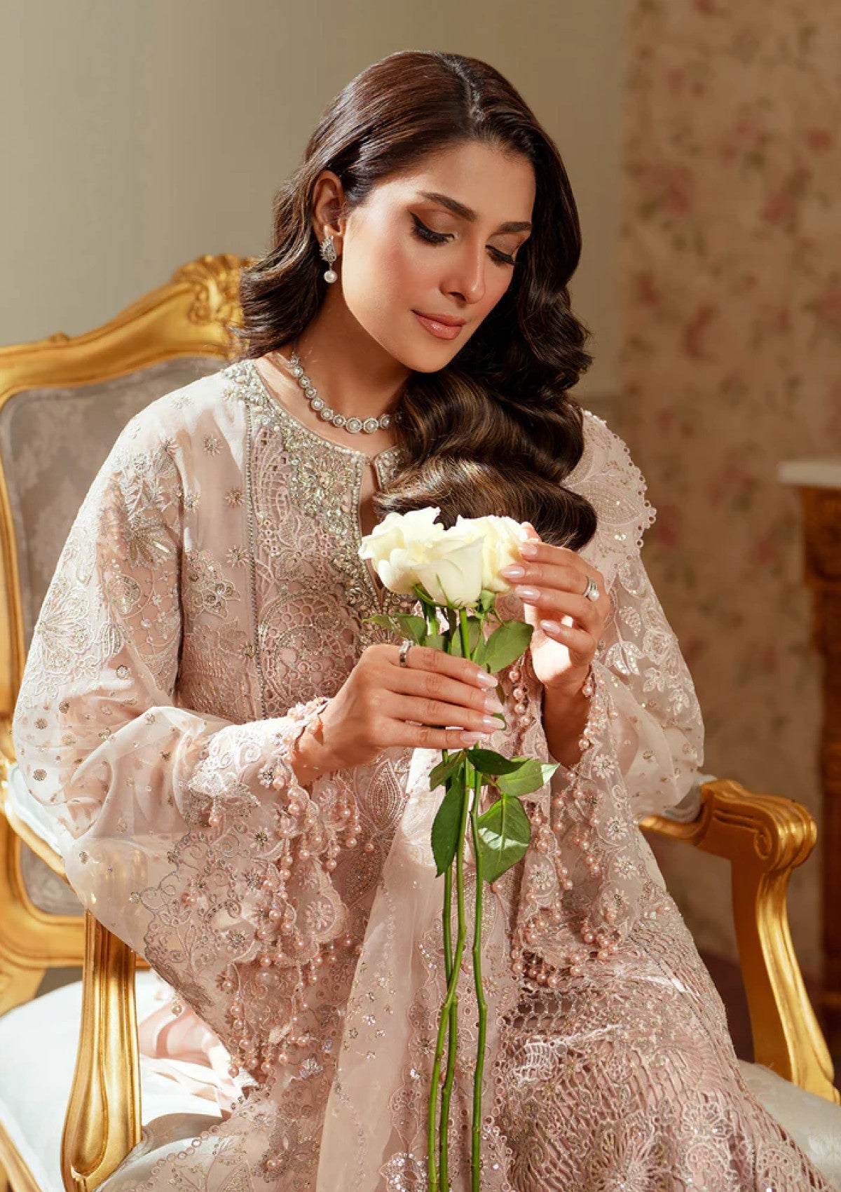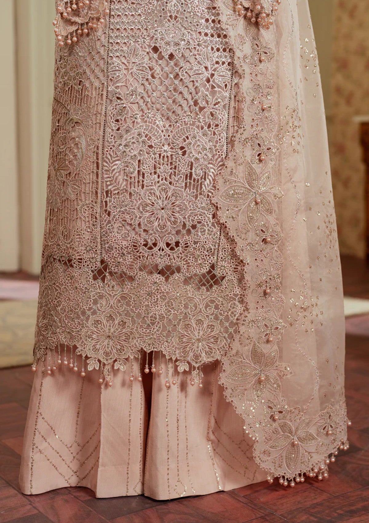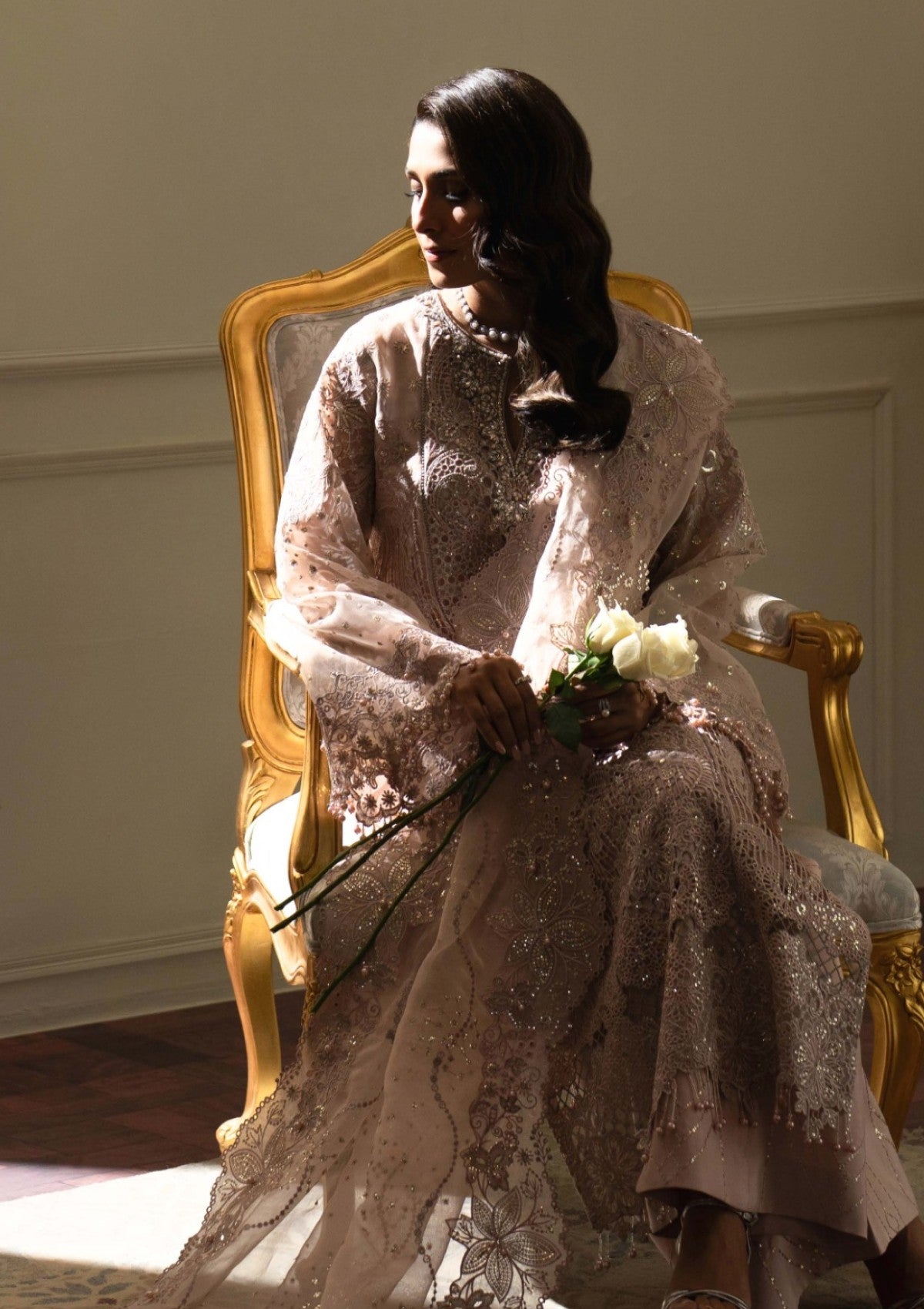 This outfit look is elevated by an organza dupatta, ripe for enhancement with pink-on-pink motifs, silver tilla, and sequins.