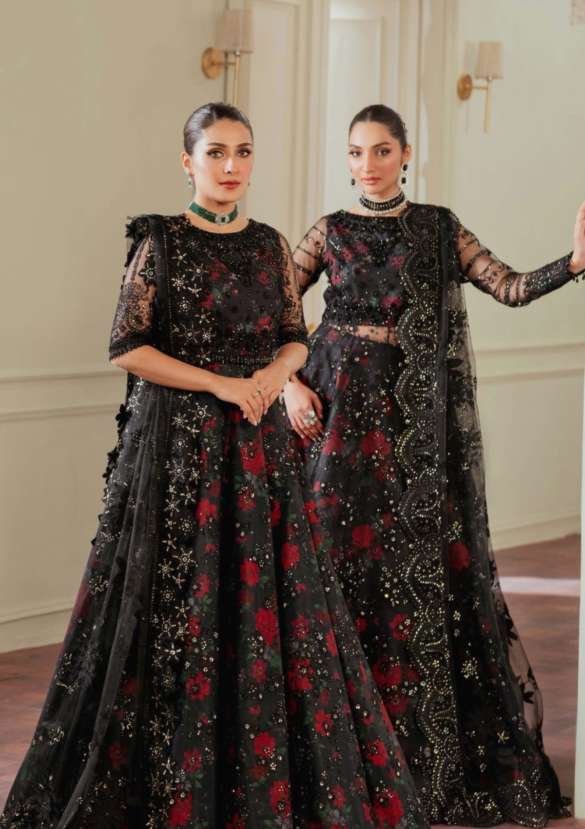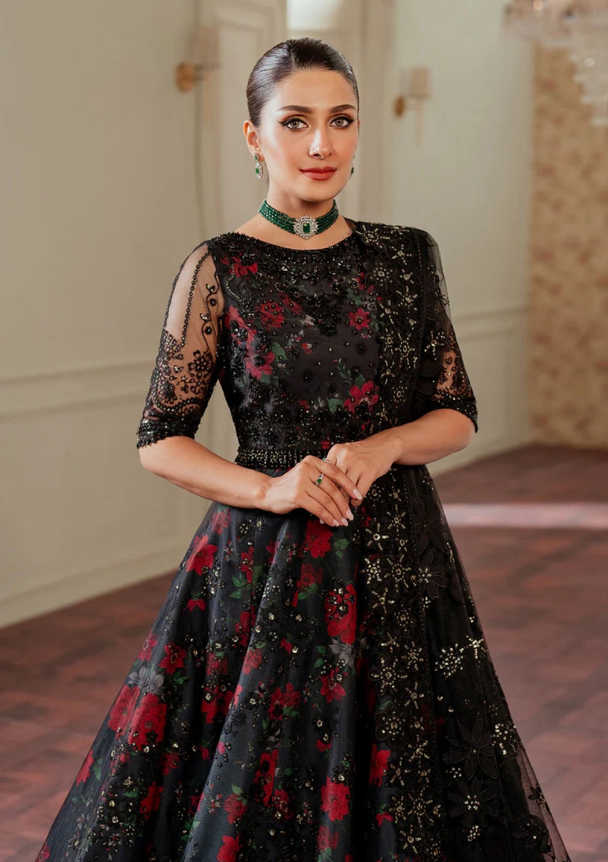 The net sleeves are embroidered with black threadwork enhanced by silver sequins. Moreover, the overall outfit has digital floral printed silk lining visible through the net creating a luxurious texture.