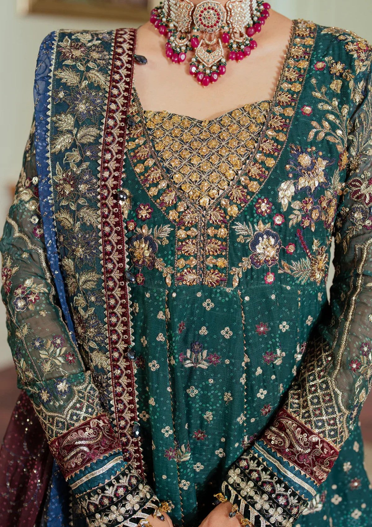 A printed chiffon dupatta adorned with sequins and threadwork include embroidered organza and velvet border to match the aesthetic of the ensemble, enhancing its luxury.