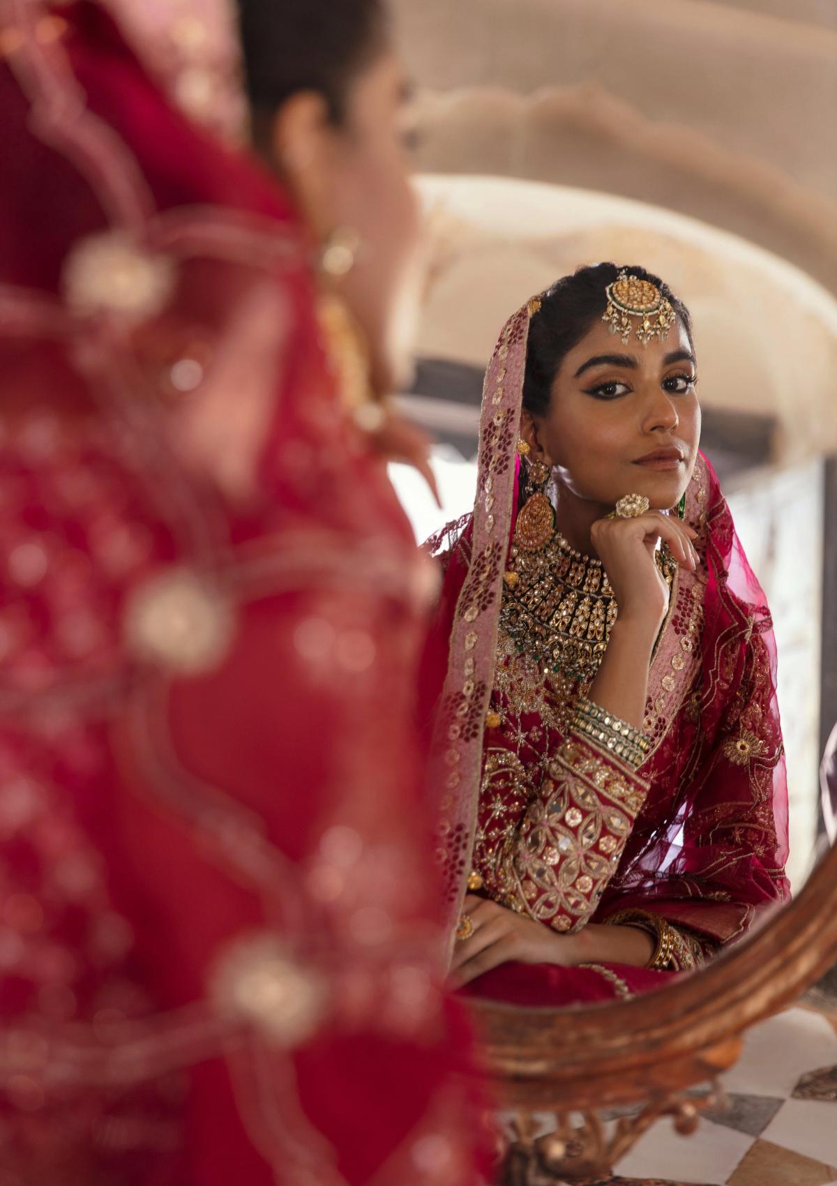 This dreamy red pure silk ensemble features intricate dabka and marori work, beautifully complemented by an organza dupatta adorned with gota, sheesha, naqshi, and pearl embellishments — an ode to artisanal traditional opulence.