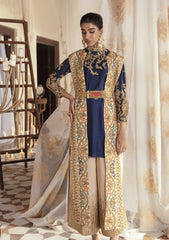 Leila features the traditional shirt and trousers look, but with an exquisite touch. The luxury formal exudes elegance in this melody of hues of mustard and vermillion on an off-white and prussian blue base. The unique design of the shirt, with a short front and a gown-like back appearance the dress, is the new trendsetter.