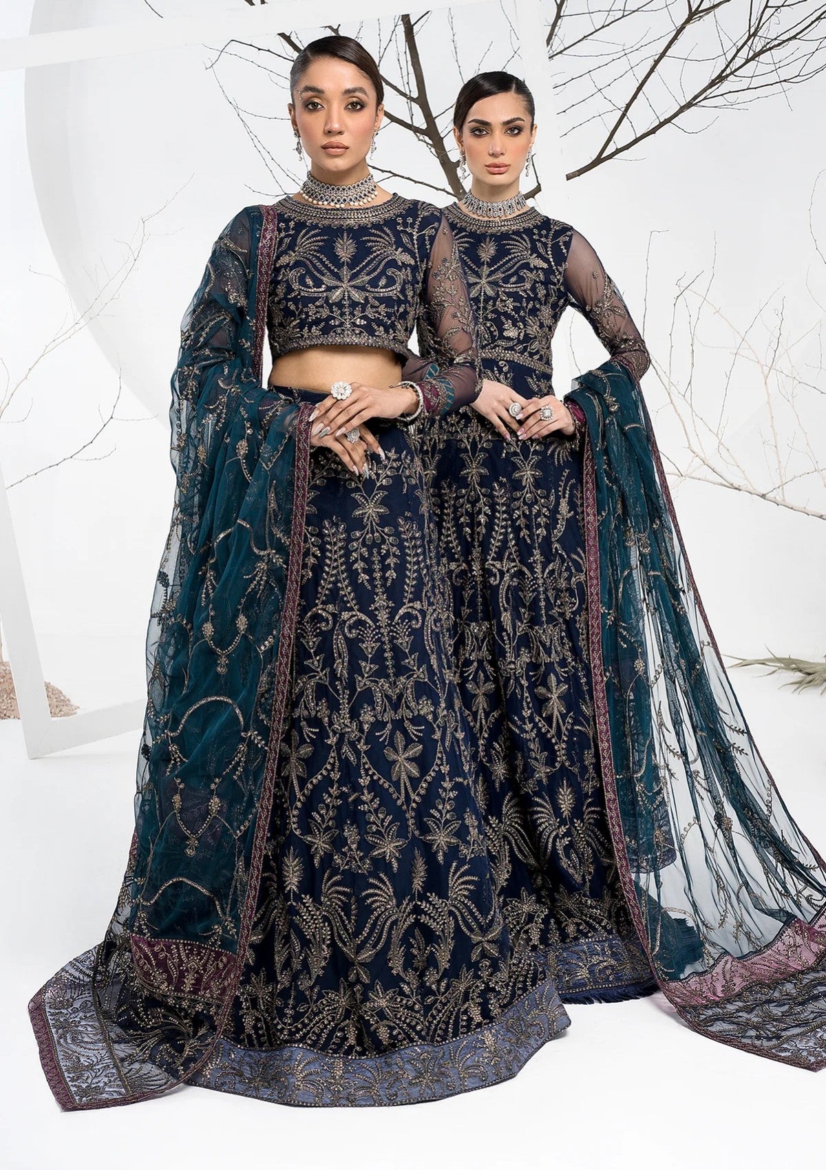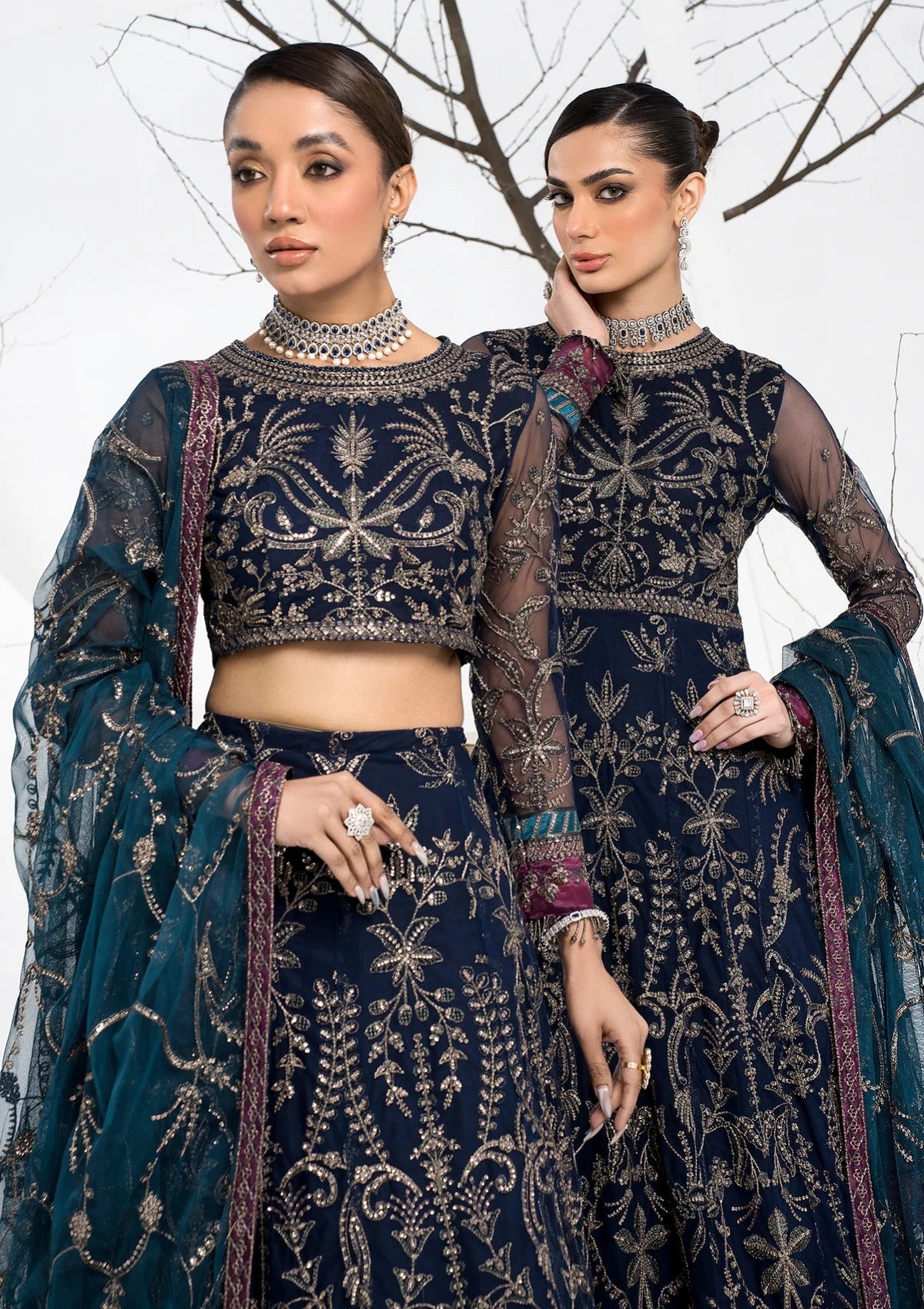 Exuding lushness at embroidery and crafted on a bold navy blue base, this artistic design is a beauty to adore. Paired with a dupatta with contrasting patches it is given an aura of royalty.