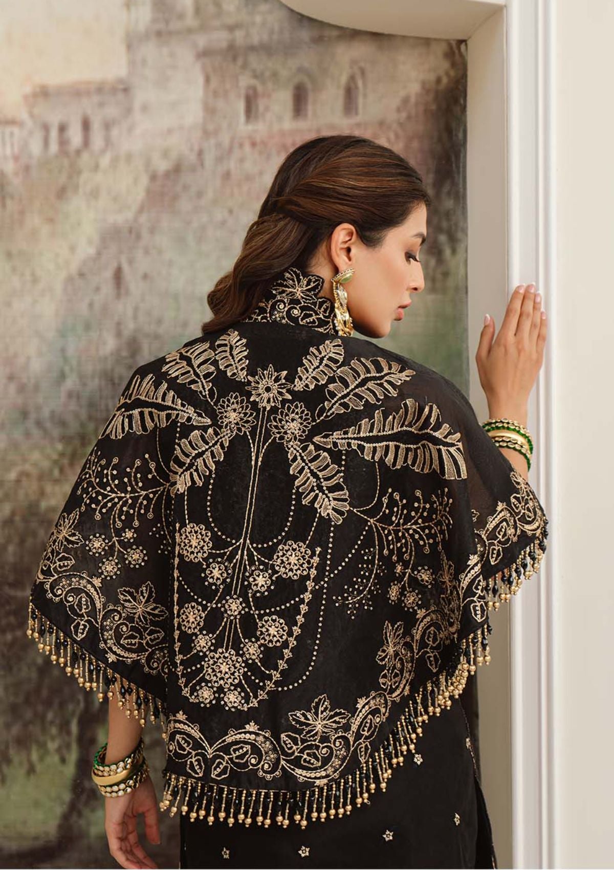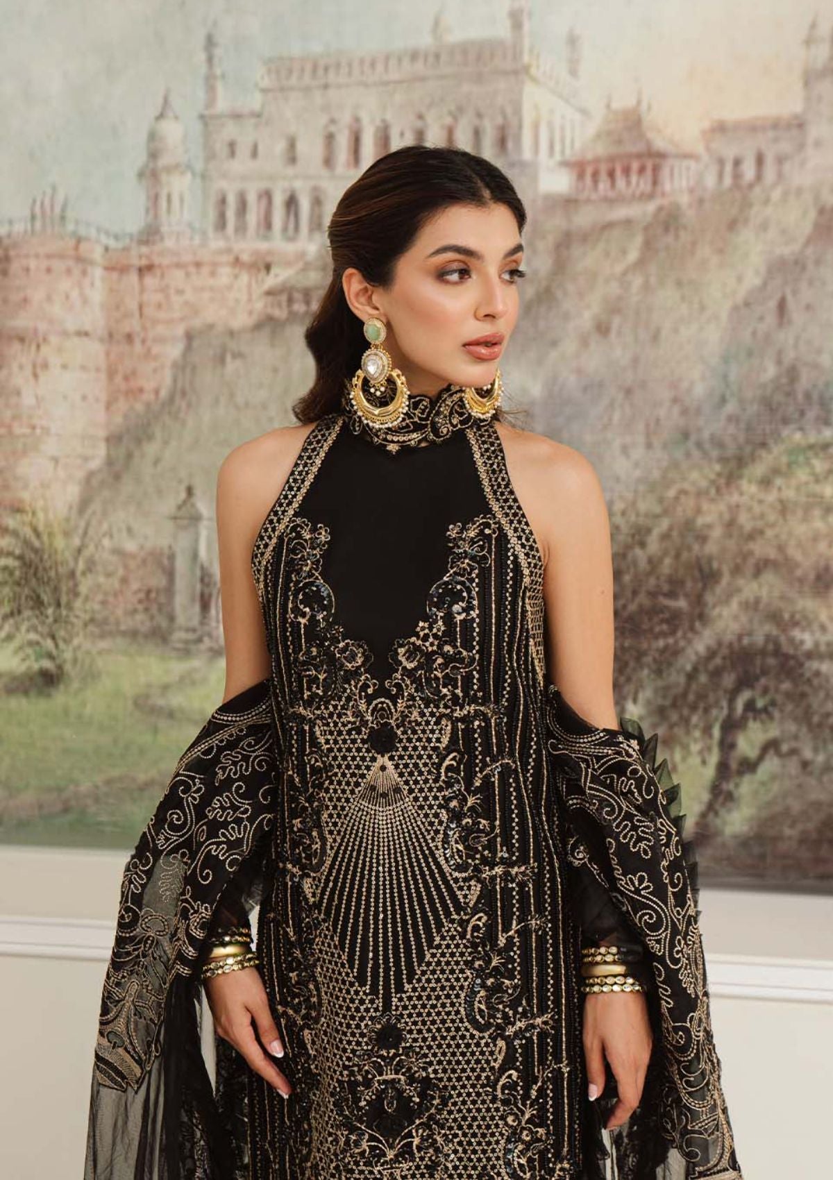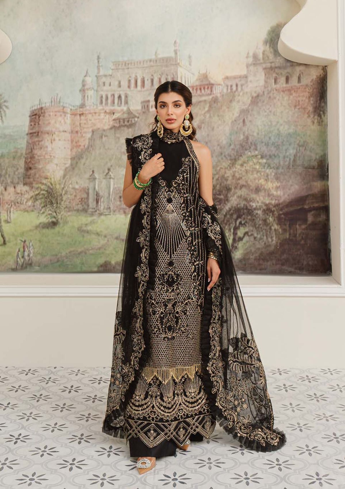 Float your way through the festive season clad in the meticulously crafted ‘LILA’. A classic silhouette in ebony features a fully embroidered shirt hand encrusted with obsidian crystals, pearls and sequins to form a scintillating, lattice composition. This richly embroidered design is paired with an exquisitely elaborate dupatta rendered with embroidered borders and oversized dreamy bouquets framing the pallus. This final design of our collection is a masterpiece that will stand out in every formal and festive gathering .