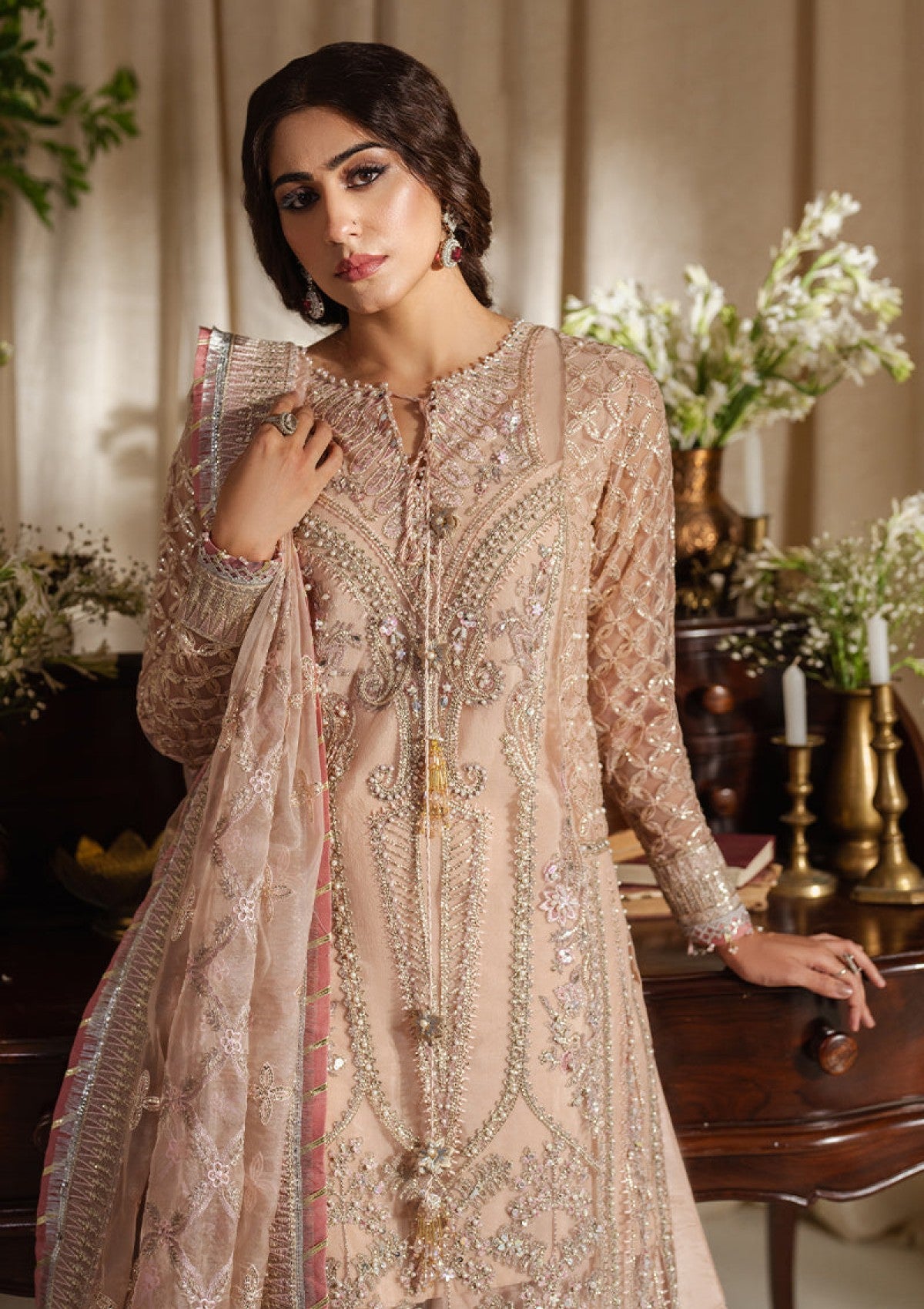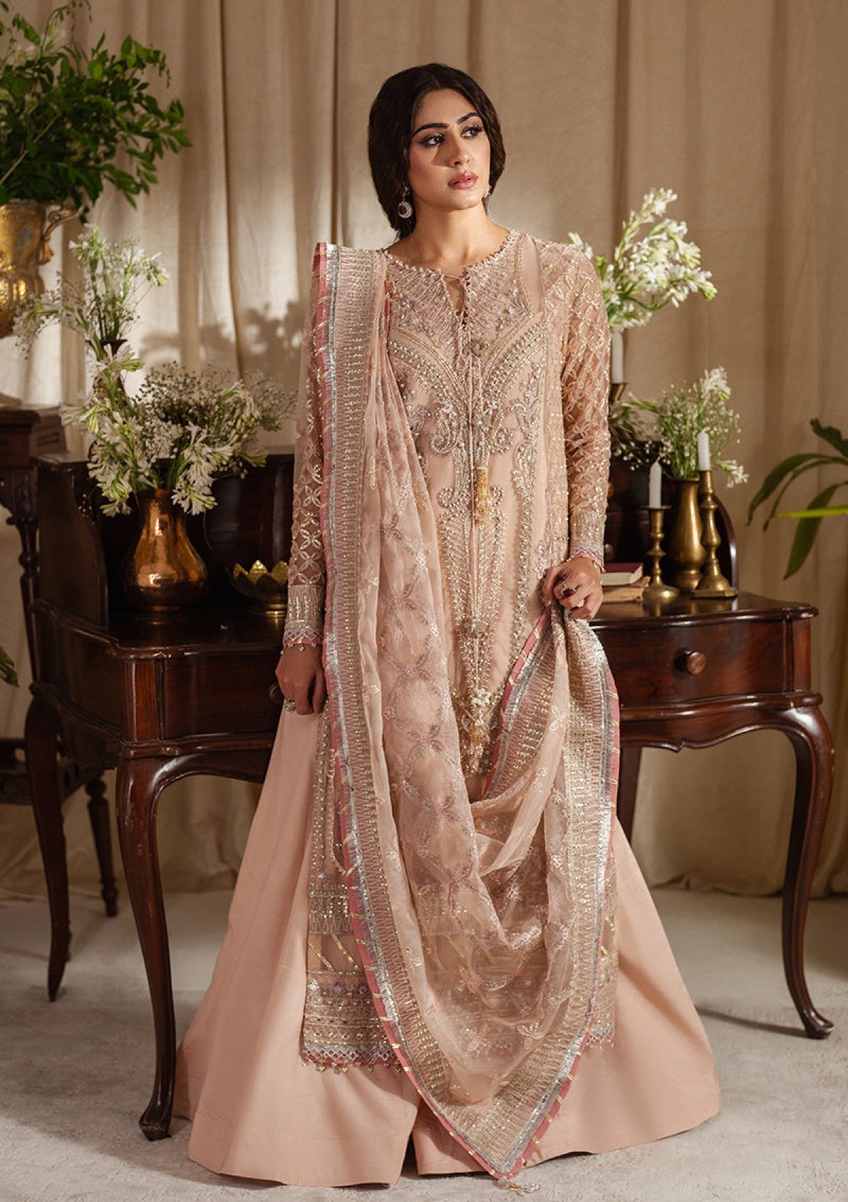Bisma is a pastel straight front hand worked shirt, featuring embroideries in pastel and same-tone shades depicting the floral patterns of ancient gardens. It is paired with a heavily embroidered dupatta, dyed raw silk slip and pants. Don’t miss out the most-awaited color of this season!