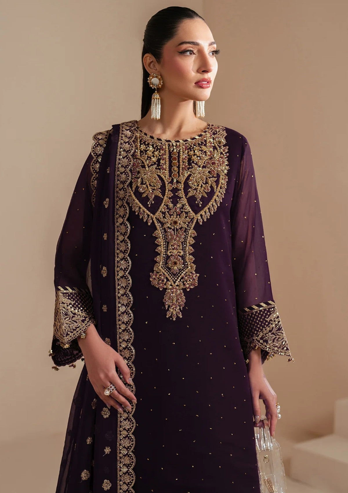 "Sirus" is a stunning ensemble made from rich deep purple chiffon, adorned with delicate hand embellishments, intricate embroidery, and shimmering light gold sequins. The look is complemented by Russian grip trousers featuring an embroidered border, perfectly balancing the opulence of the chiffon dupatta. This exquisite outfit is the perfect choice for Eid celebrations.