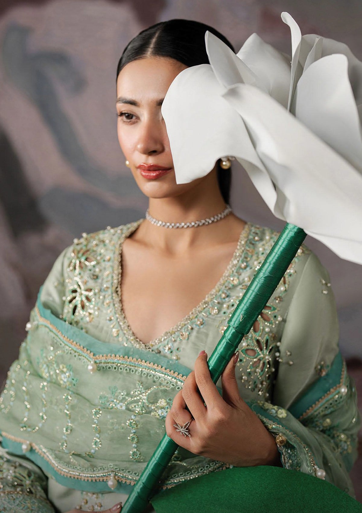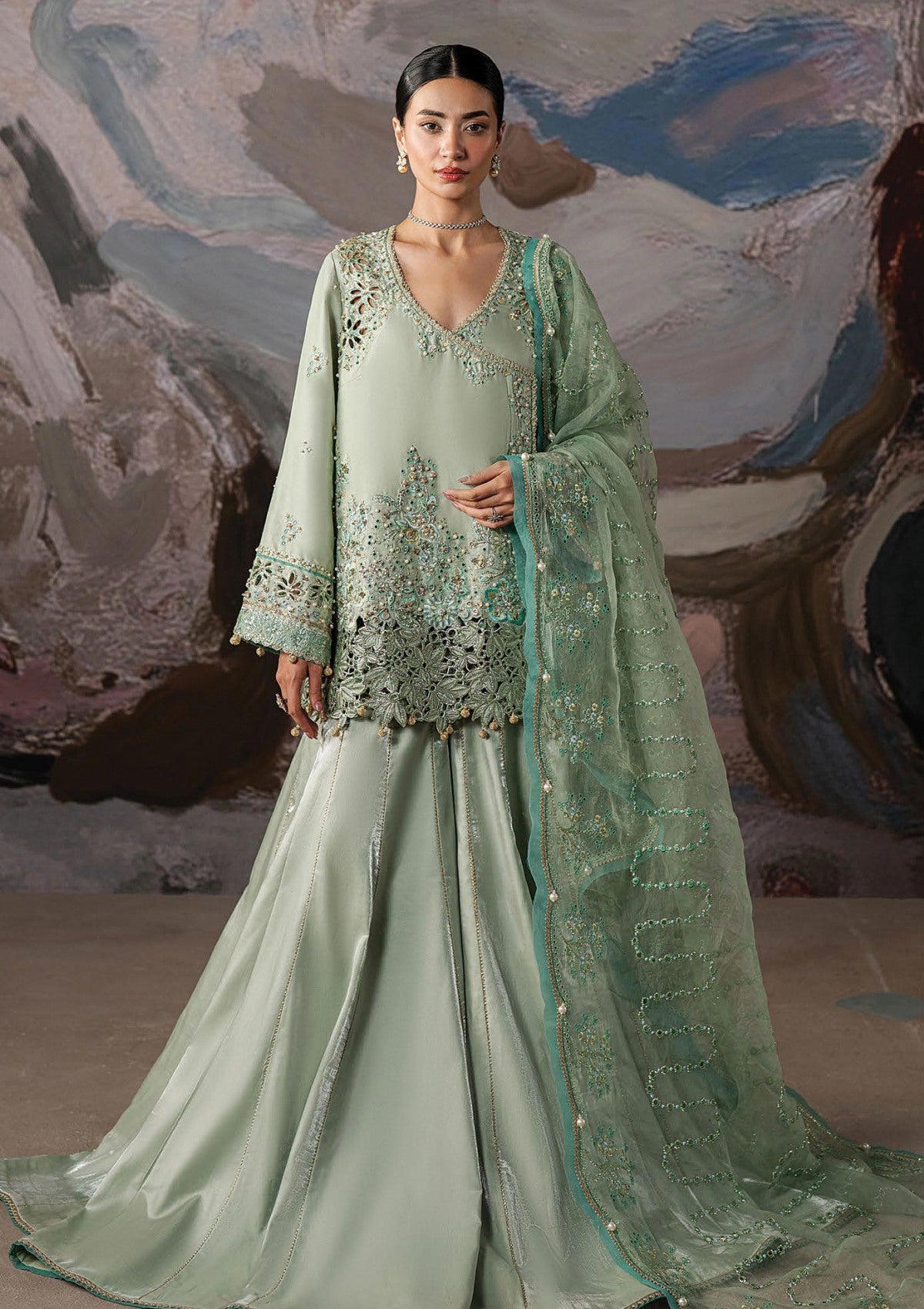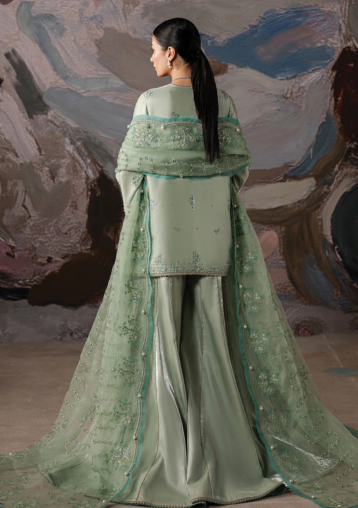 Rendered in a serene sage hue, this ensemble is a study in refined craftsmanship. The shirt features intricate cutwork embroidery along the neckline, hem, and sleeves — delicate floral motifs brought to life with shimmering sequins, threadwork, and mirror accents that catch the light in soft gleams. Its structured silhouette flows effortlessly into a flared sharara, crafted from lustrous silk that moves with liquid grace. A diaphanous organza dupatta completes the look, adorned with scalloped borders and sequined linear patterns that lend a sense of airy luminosity. Every element comes together in quiet harmony — modern, graceful, and artfully detailed.