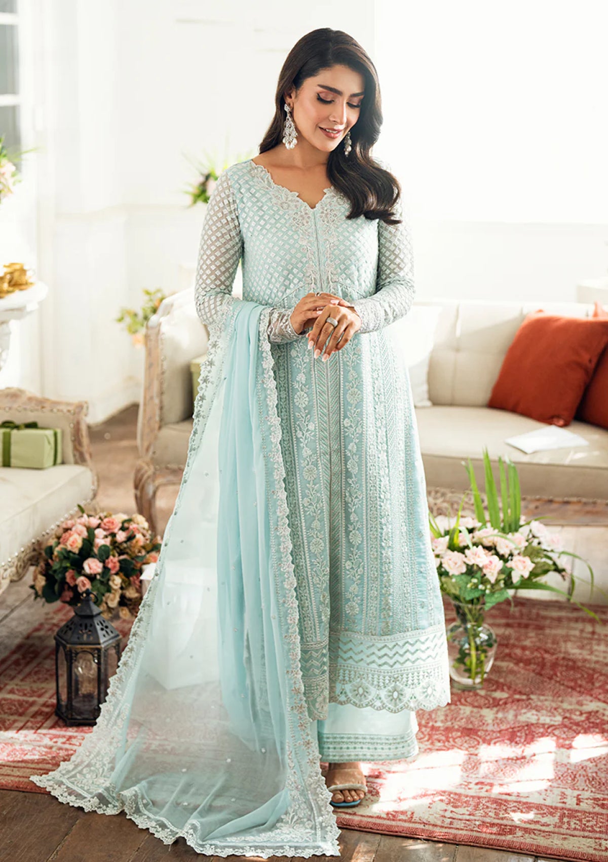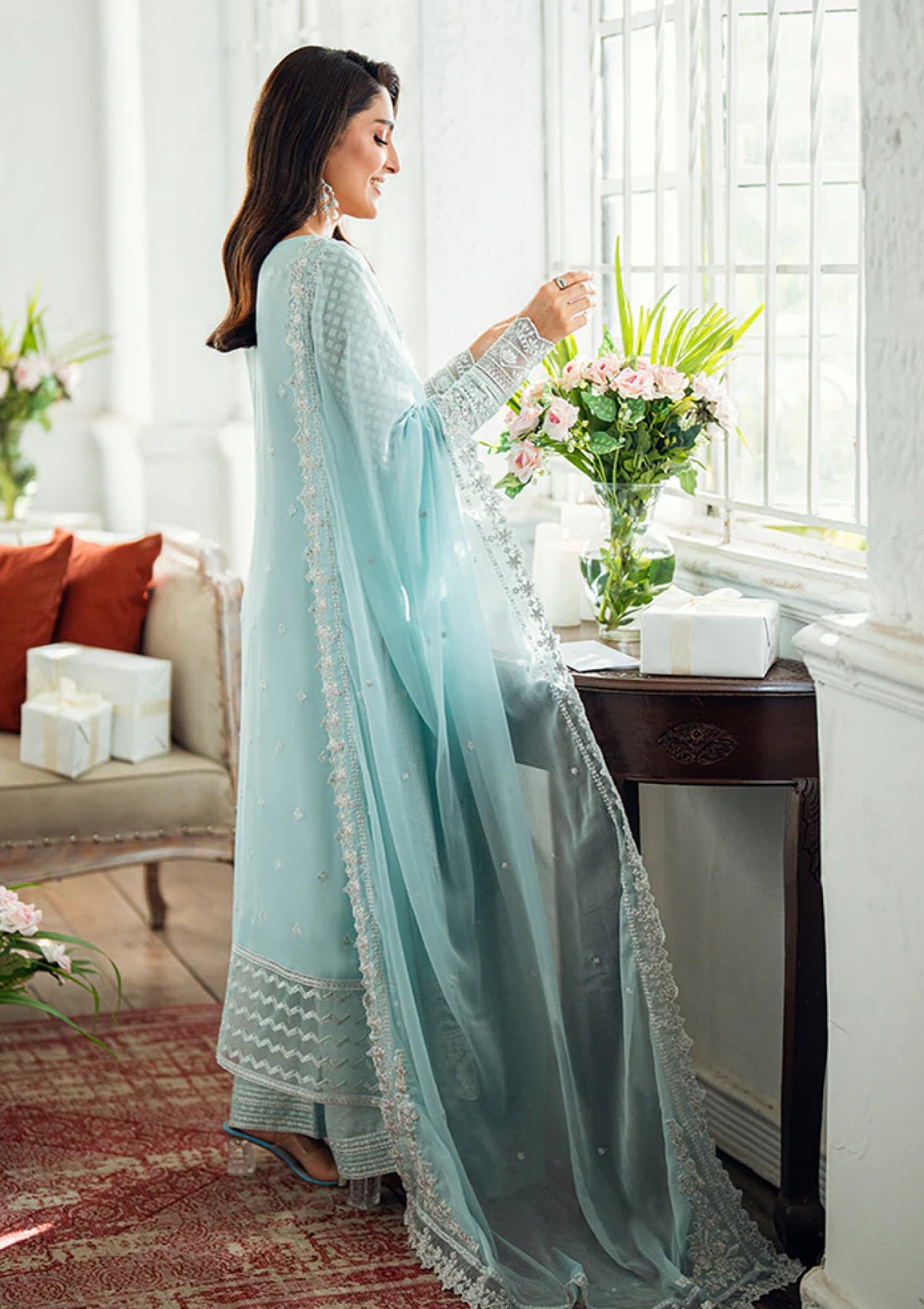 Grace meets sophistication in Azure Glow, a stunning ice blue ensemble crafted from premium chiffon. Paired with a sequins-embroidered chiffon dupatta, it adds the perfect touch of sparkle for a timeless festive look. A must-have for celebrations!