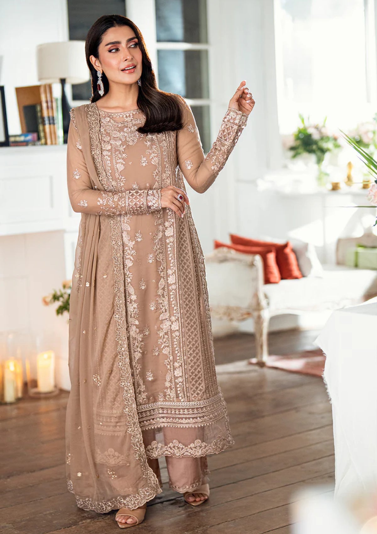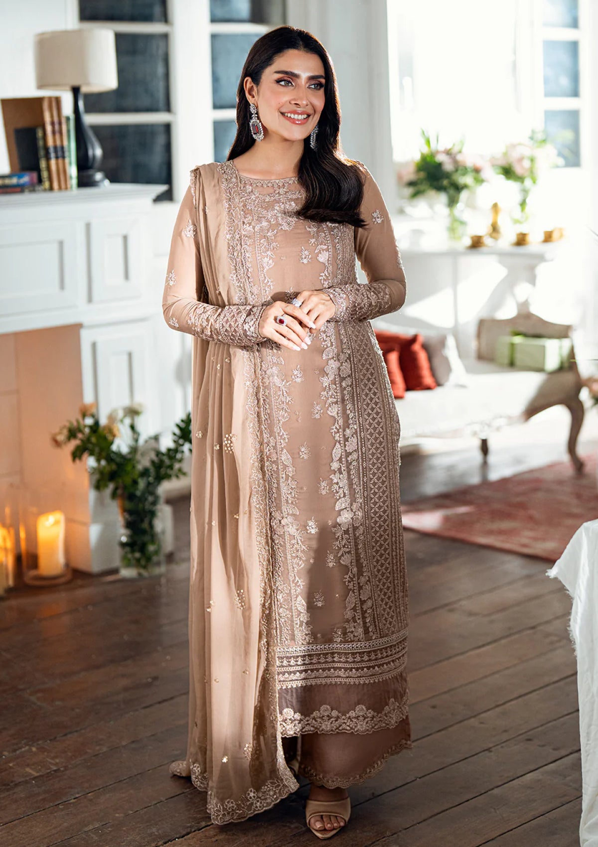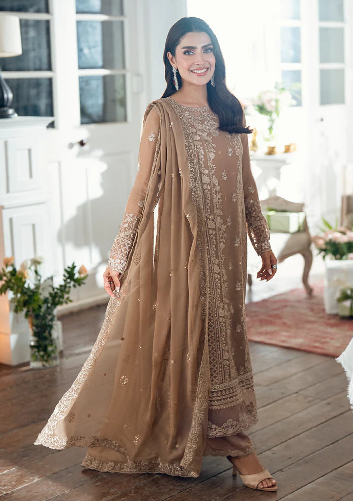 Draped in sophistication, Hazel Veil in a rich brown hue is the epitome of timeless grace. Crafted from luxurious chiffon, this ensemble is elevated with a twin sequins-embroidered chiffon dupatta, adding depth and sparkle to your festive look. Effortlessly chic and undeniably luxe.
