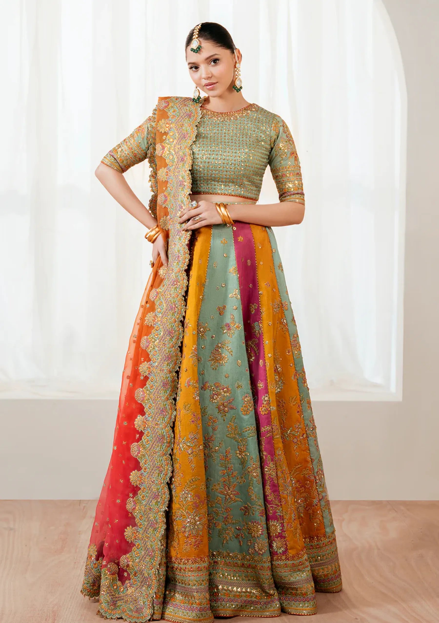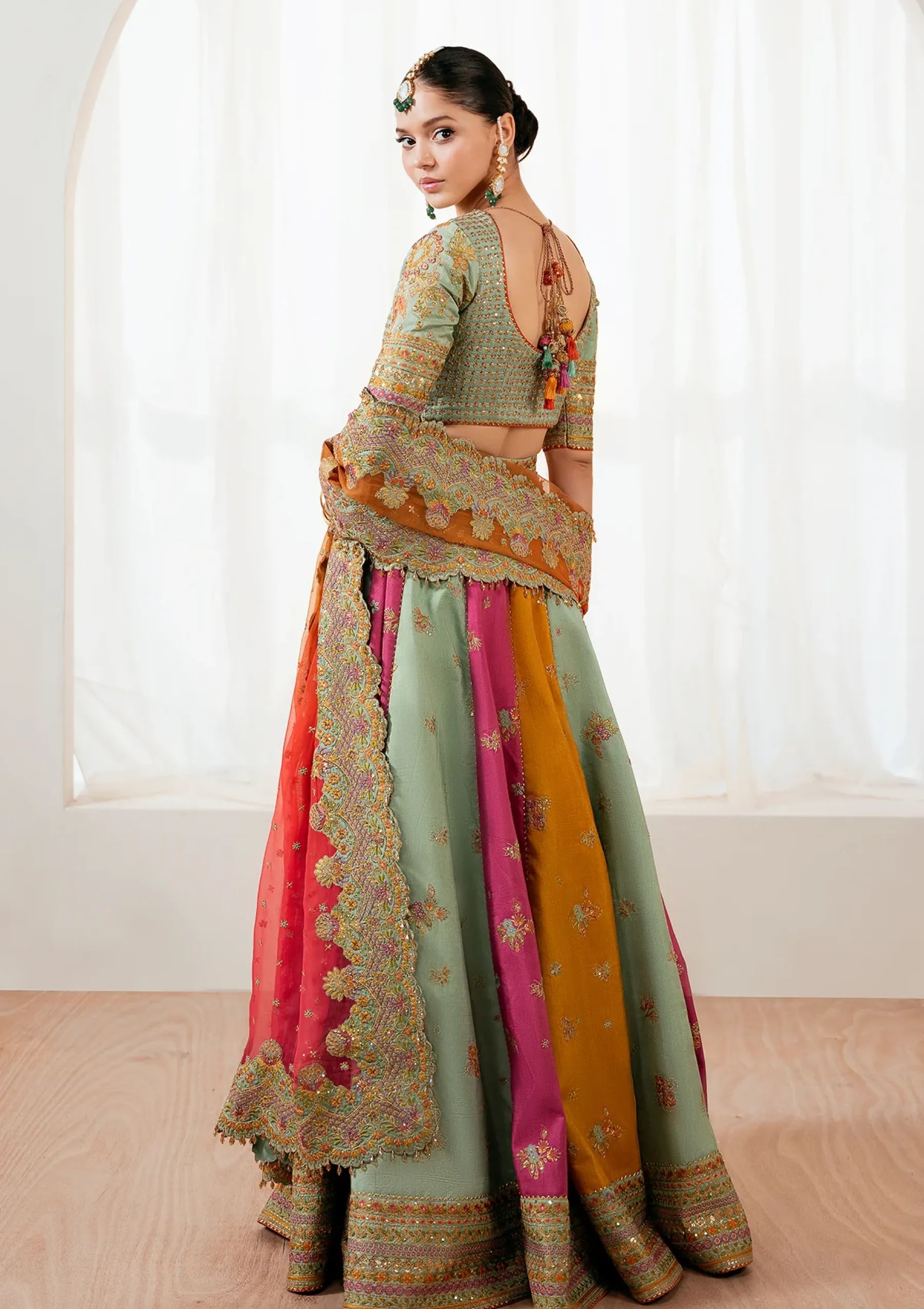 The scalloped dupatta completes the look and its edges are adorned with accessories.