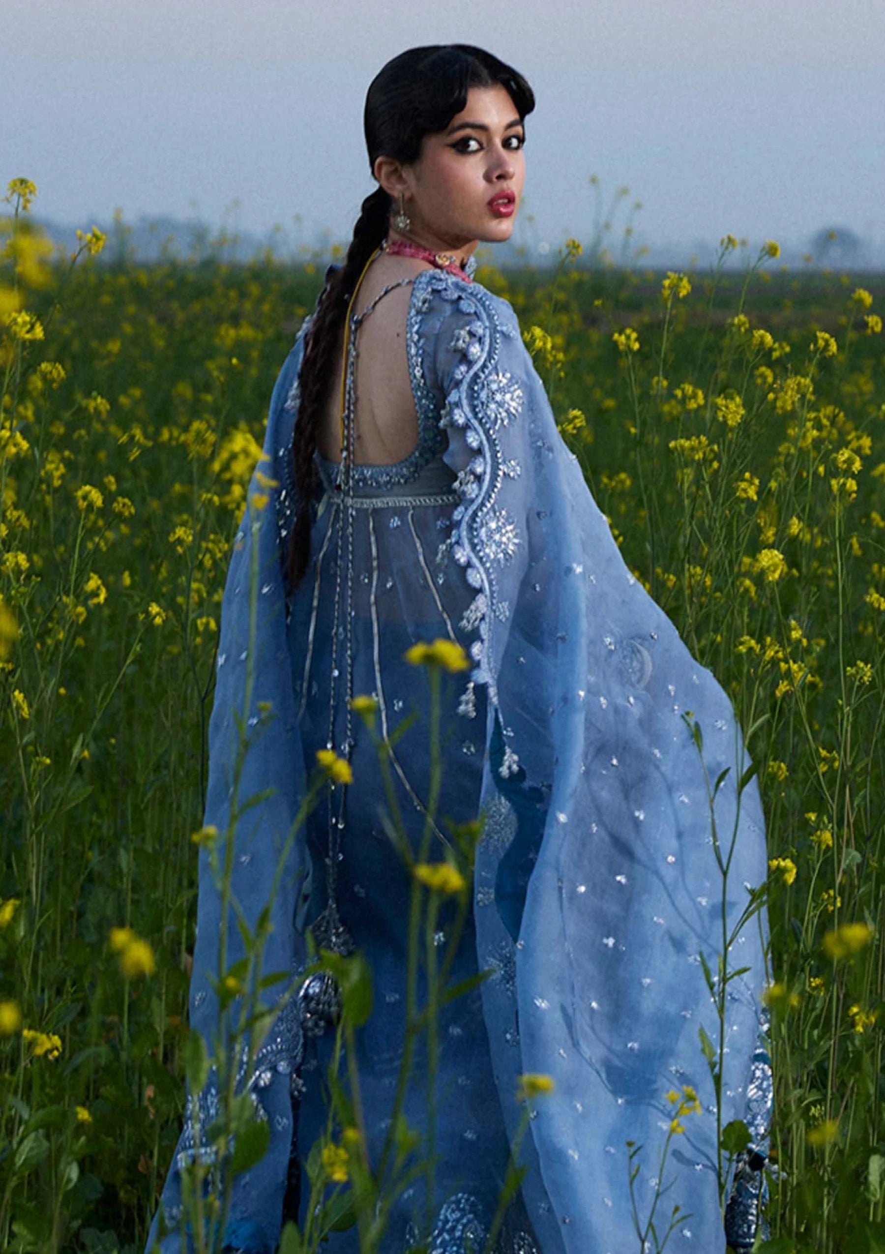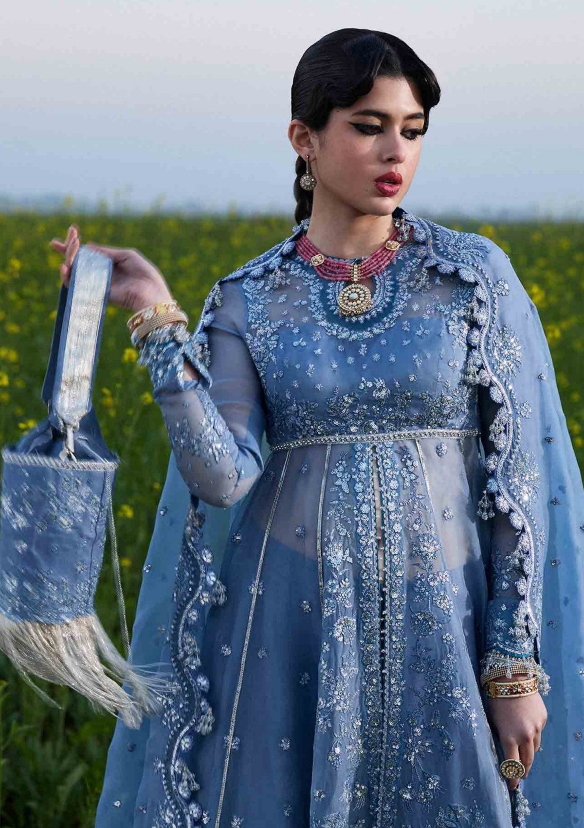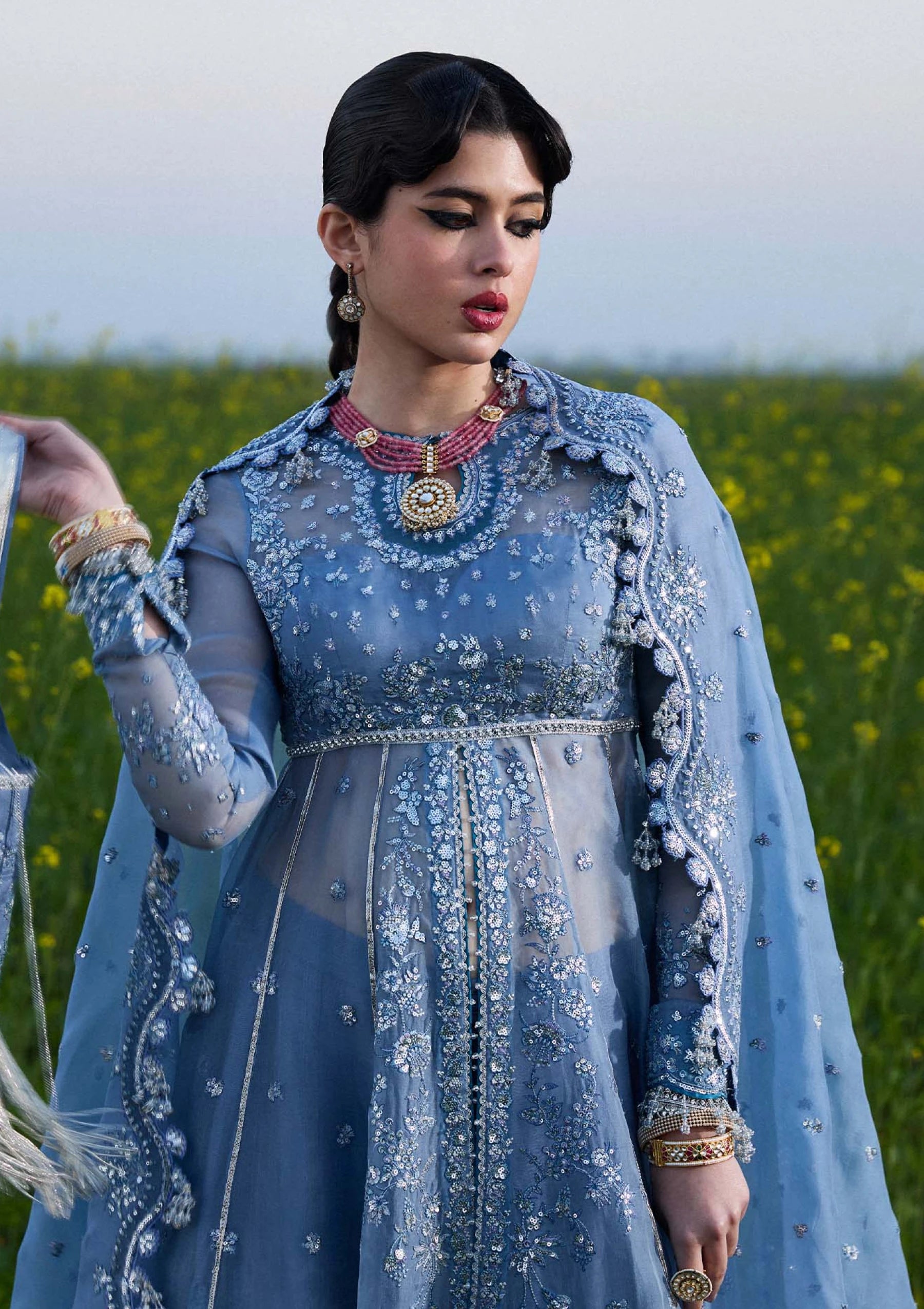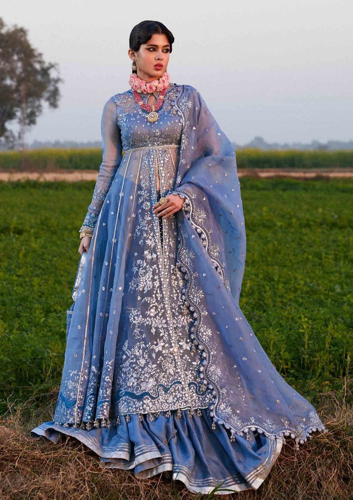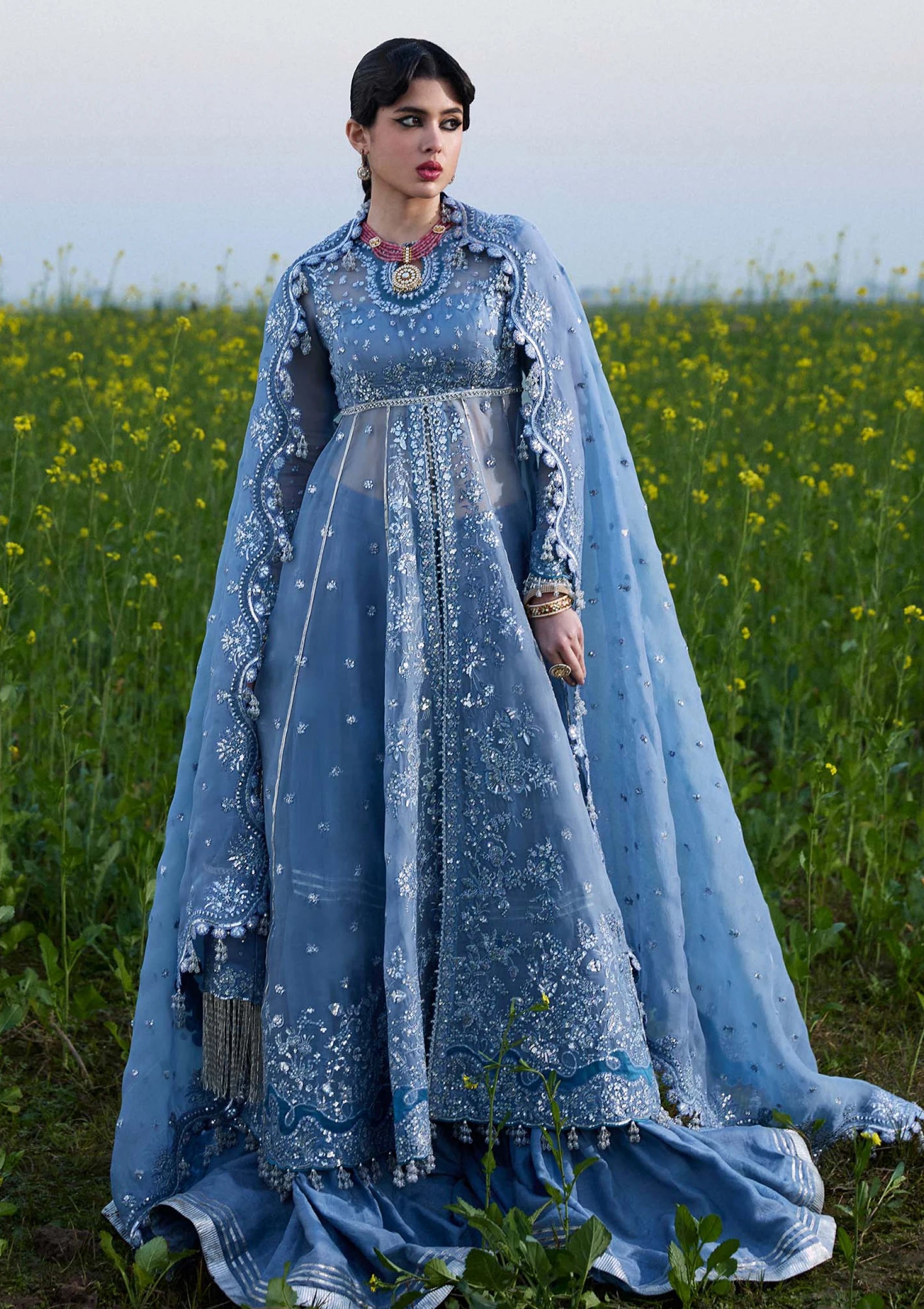 It's a front open organza peshwas. The choli and sleeves are embroidered, and attached with embroidered panels. This peshwas is paired with Korean Raw-silk sharara, which adds a traditional touch. And the dupatta is made of organza with embroidered four side borders, giving it sophistication. This outfit is definitely a head-turner and perfect for any special occasion or event.