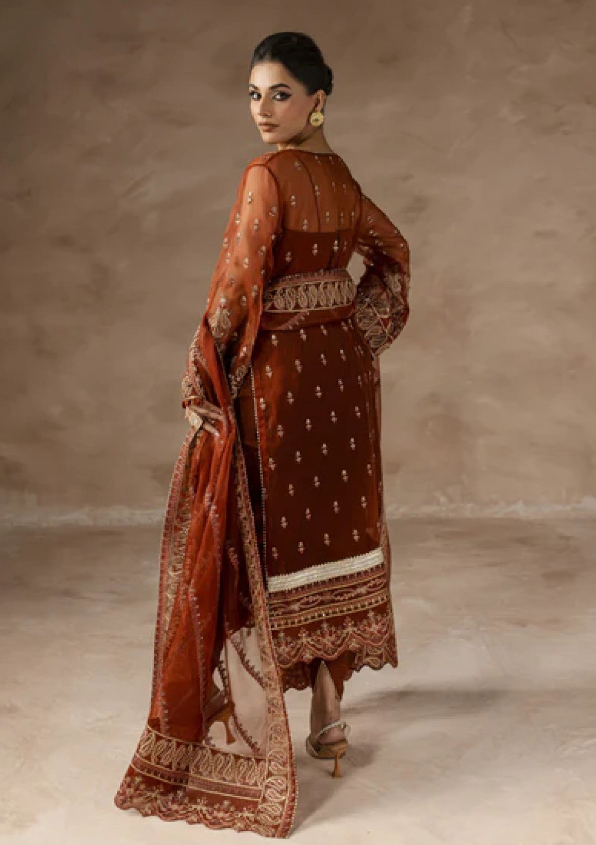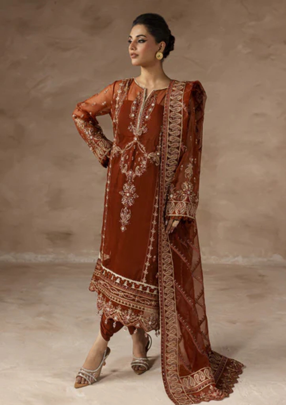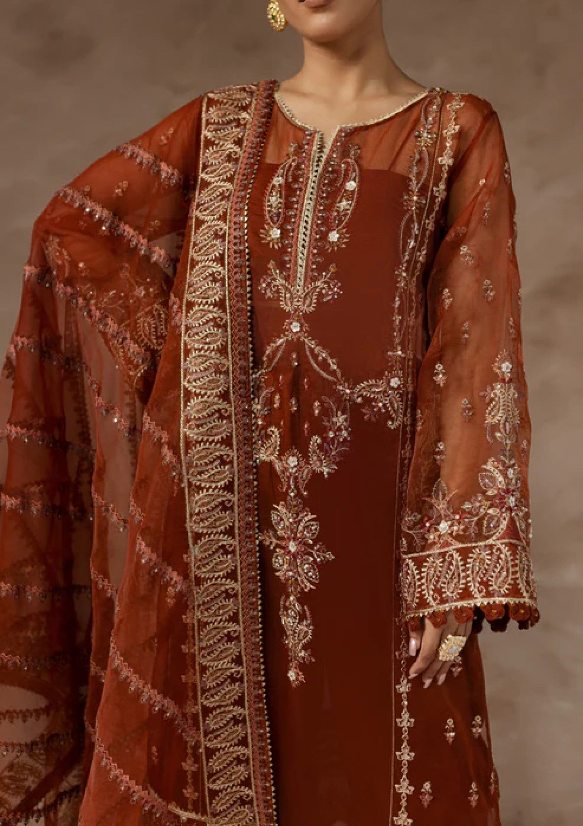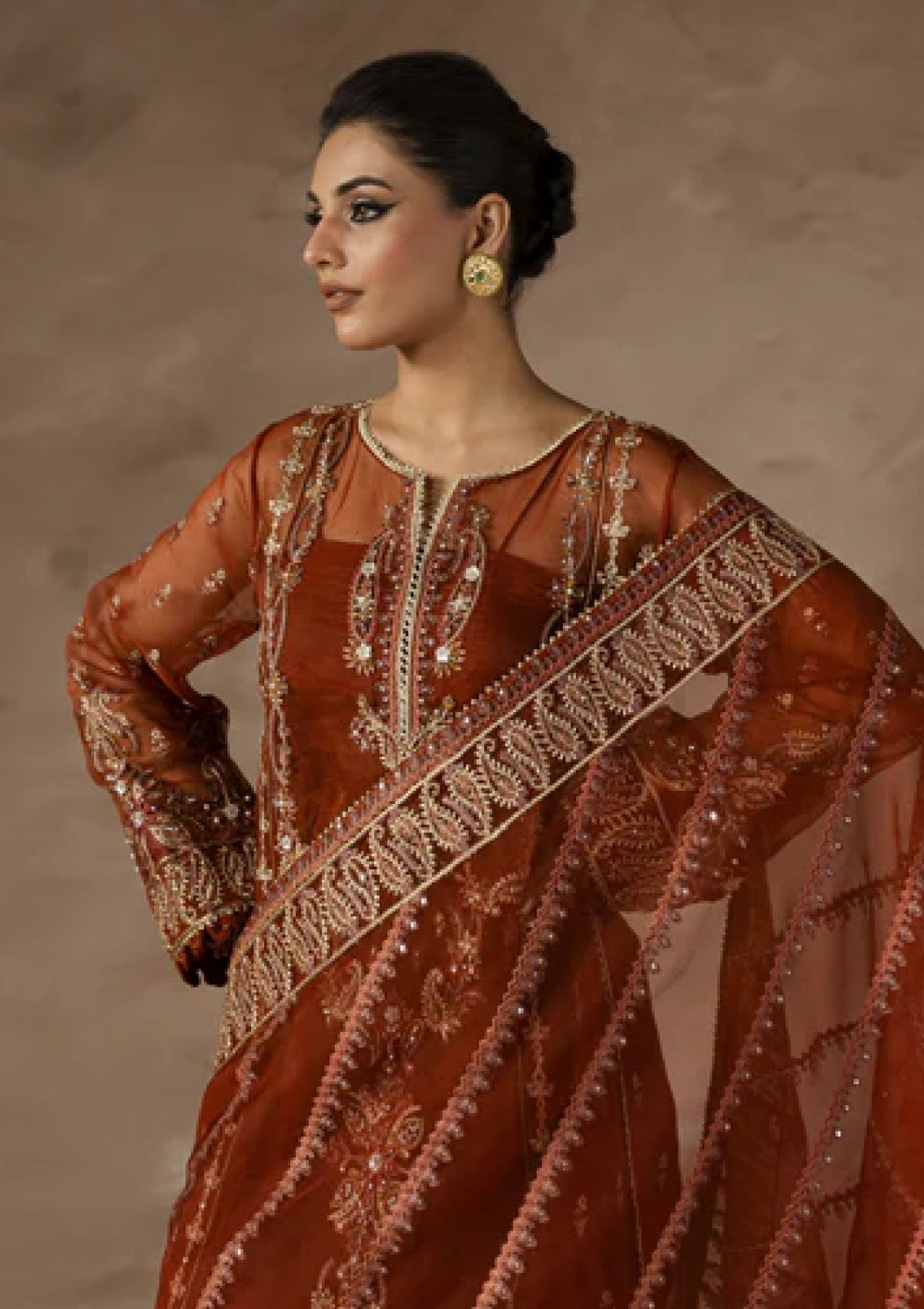 Radiating refined luxury, this rust-red ensemble features an ethereal organza shirt and dupatta, paired with elegantly tailored raw silk trousers. Intricately hand-embellished with Kulfi Drops, Pipe Work, Crystals, Pearls, Bethki, Japanese Cutt Dana, Telenor Sitara, and Cup Sitara, it exudes a mesmerizing shimmer and sophistication. A perfect choice for weddings and festive occasions, where tradition meets classic glamour.
