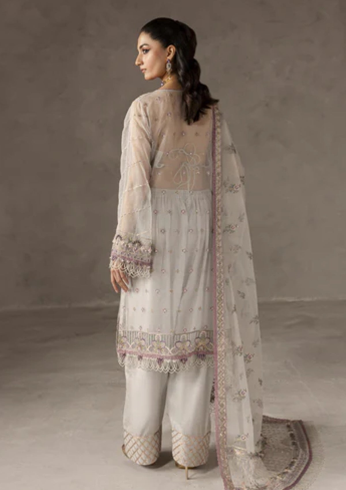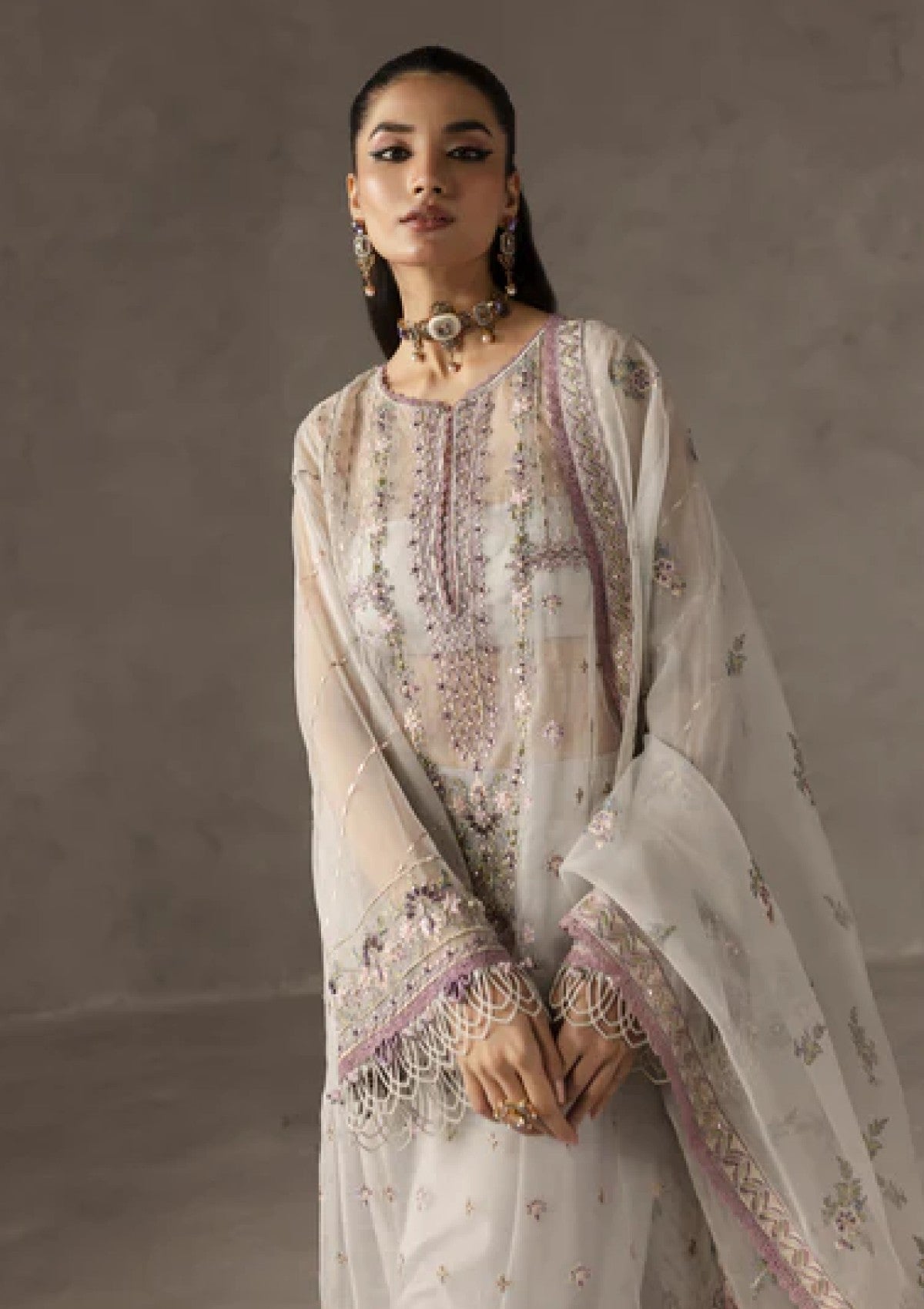 Delicate and sophisticated, this greyish white luxury dress features a graceful organza shirt and dupatta, paired with raw silk trousers. Adorned with intricate pink hand embroidery and embellishments, it showcases Kulfi Drops, Bethki, Japanese Cutt Dana, Pearls, Indian Joun Moti, Cup Sitara, and Surahi, adding a soft yet radiant charm. A perfect fusion of elegance and artistry, ideal for festive occasions and formal gatherings.