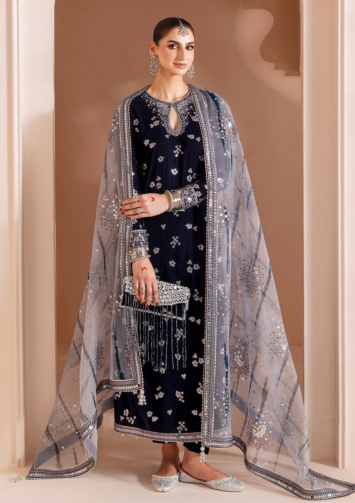 This formal ensemble features a richly embroidered pure velvet front and sleeves, highlighted by detailed velvet borders that extend to the back and sides for a polished silhouette. The pure velvet back adds luxurious depth, while the embroidered digital printed organza dupatta complements the look with delicate artistry. Finished with pure velvet borders on the dupatta and bottom, this outfit combines intricate craftsmanship with sumptuous textures, ideal for sophisticated occasions.