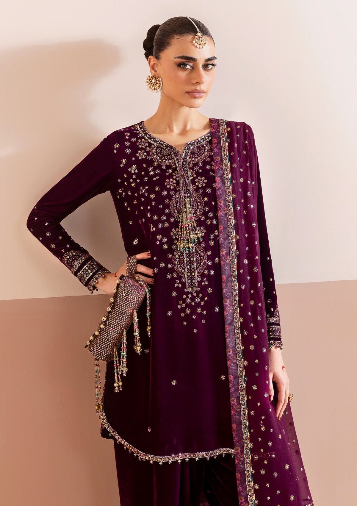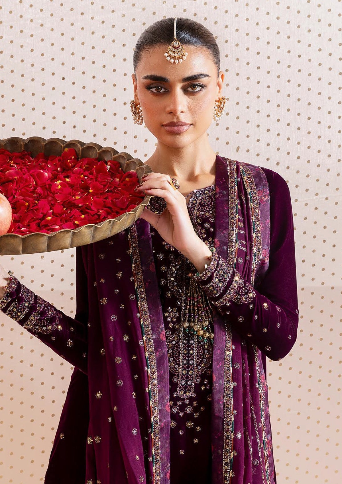 This sophisticated formal ensemble features richly embroidered pure velvet panels on the front and front sides, complemented by similarly embroidered velvet sleeves and borders on the front, back, and sleeves for a cohesive, luxurious appearance. The pure velvet back enhances durability and elegance, while the embroidered pure velvet bottom adds refined detail. Completing the look, the dupatta is crafted from organza with intricate embroidered applique and matching borders, combining texture and delicacy to elevate your formal wardrobe with expert craftsmanship and timeless style.