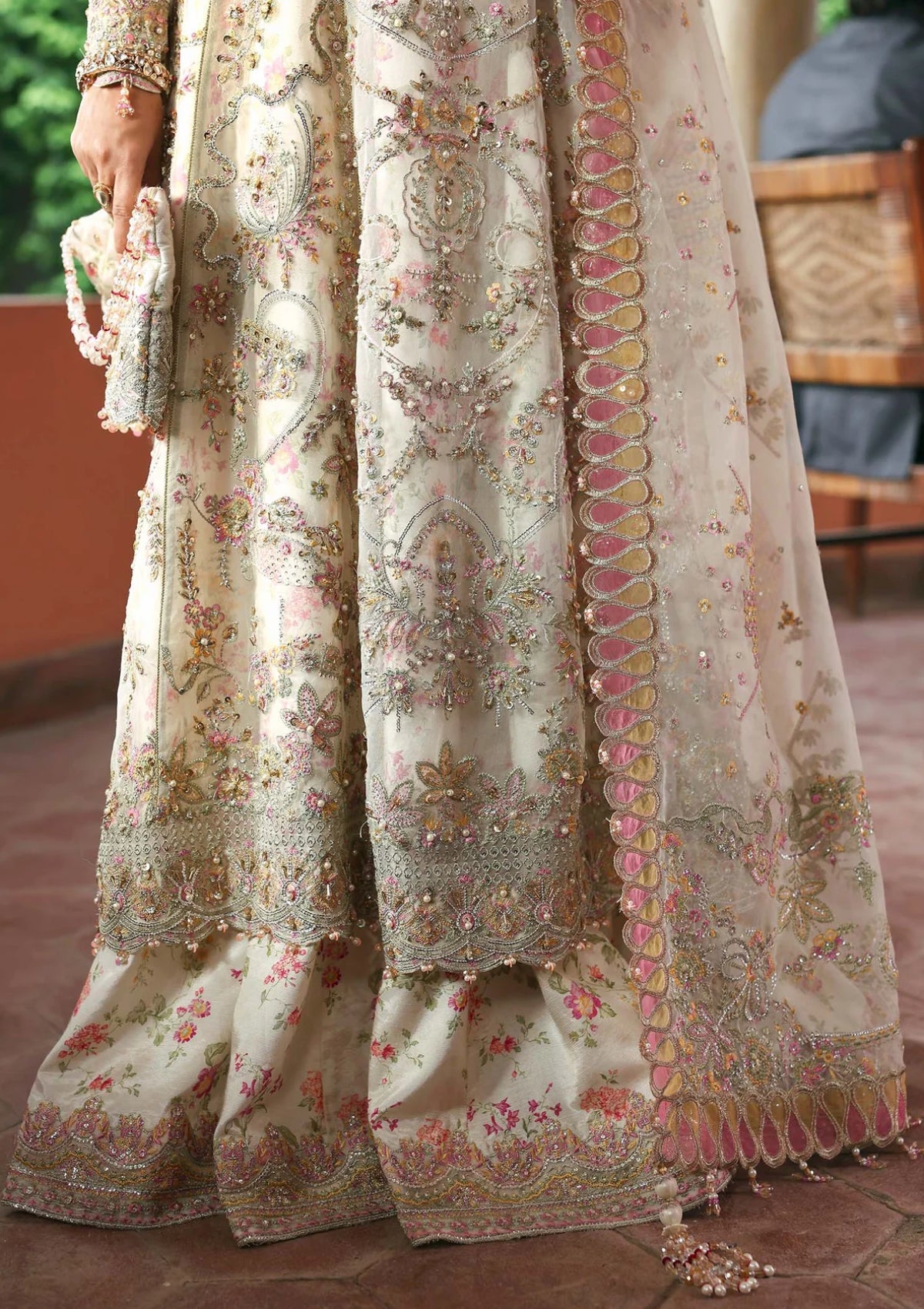 Radiating purity and sophistication, this ethereal ivory frost ensemble is a masterpiece of timeless grace. The shirt is designed with exaggerated hand-embellished organza panels and a cutwork neckline, elevated by intricate embroidery and ornate borders that speak of refined artistry. A delicately embroidered dupatta, adorned with laser-cut details and pallu accents, flows with understated elegance. Paired with a digitally printed trouser and inner, the ensemble combines modern precision with traditional craftsmanship. Finishing touches of colli sequin spray and intricate adda work add subtle radiance, making this look a true celebration of elegance and charm.