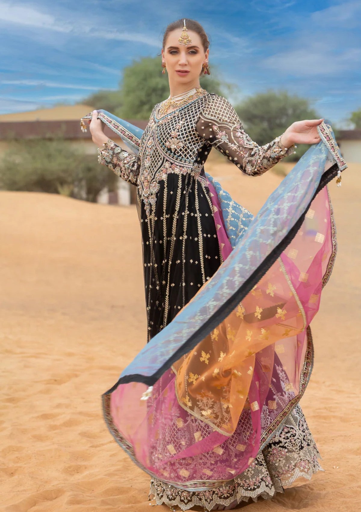 Unveil sophistication with the Midnight Noir Maxi Dress in black, featuring a striking hexagonal fish net shirt and a foil-printed organza dupatta. This LUXE II Collection piece dazzles with intricate embroidery and luxurious Swarovski embellishments.