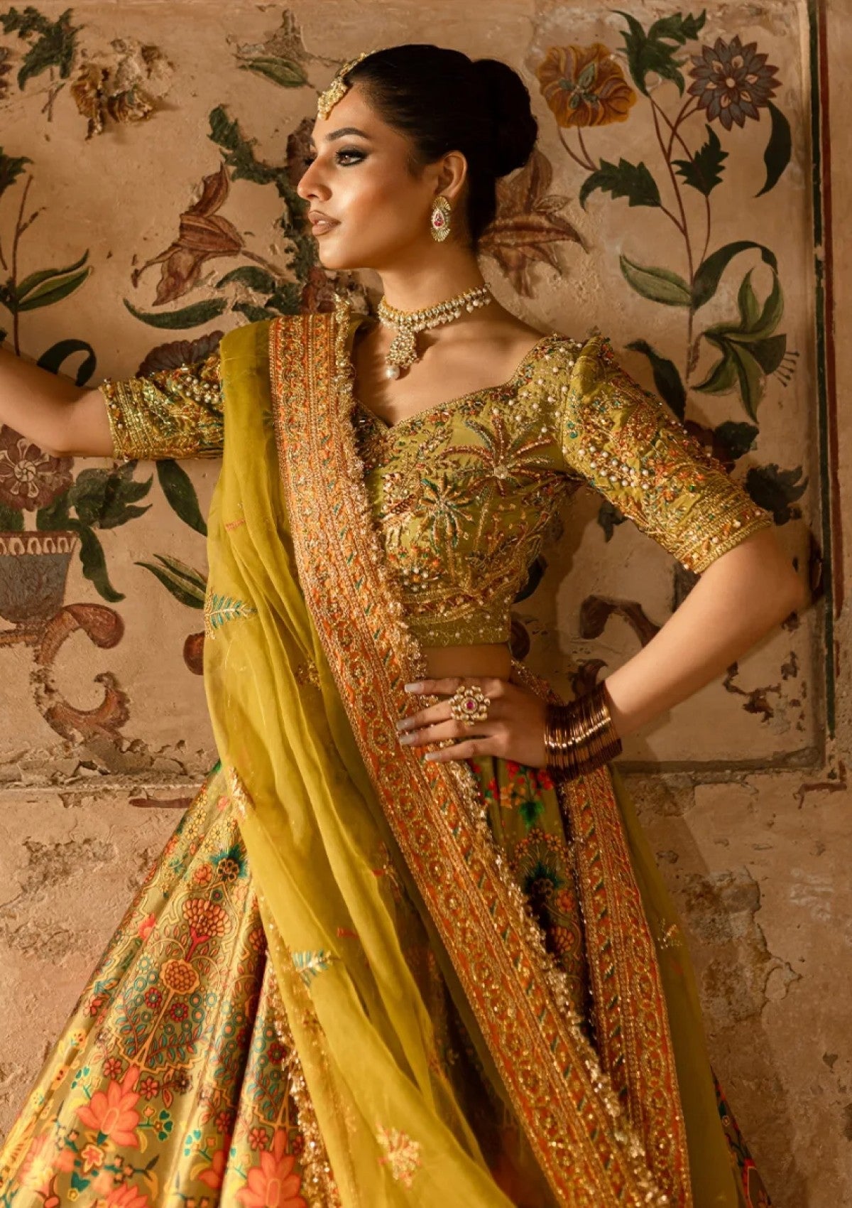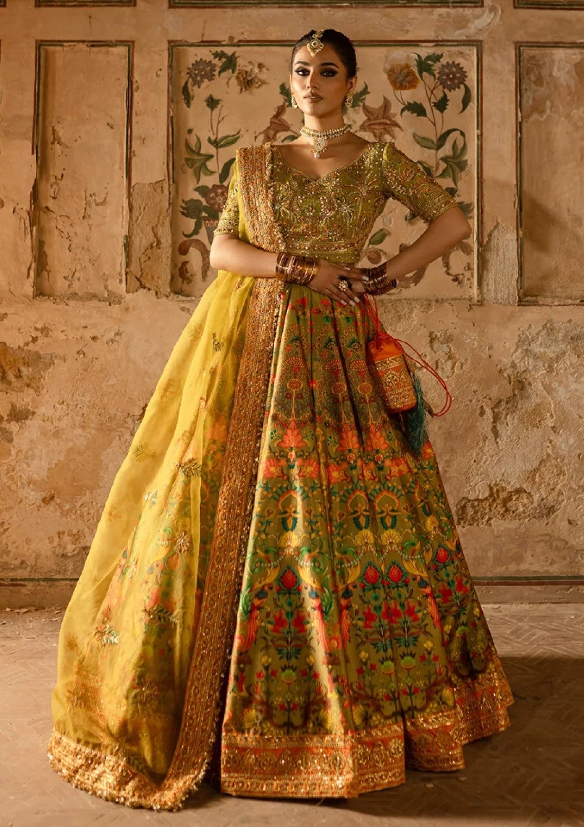 Embroidered & Hand Embellished, choli with intricate neckline detailing adorned with gota work ,cut beads, dabka, and pearl work. The choli is further enhanced with delicate sequins creating a luxurious, textured effect Paired with a stunning High Waisted printed lehnga, showcasing a beautifully embroidered sequins border . The outfit is complemented by a fully embroidered organza dupatta, adorned with sequins and elegant thread work, adding a graceful finishing touch to this Luxurious bridal outfit.