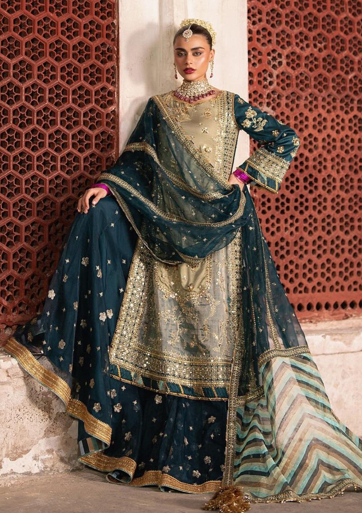 A graceful ensemble crafted from luxurious Rameen silk and delicate tissue, this long shirt is adorned with intricate tilla embroidery that radiates understated opulence. It is paired with an ethereal organza dupatta, beautifully enhanced with chan detailing and a pani-embellished border, exuding timeless charm. The look is exquisitely completed with a chata patti organza finish, adding a refined touch of sophistication to this regal creation.