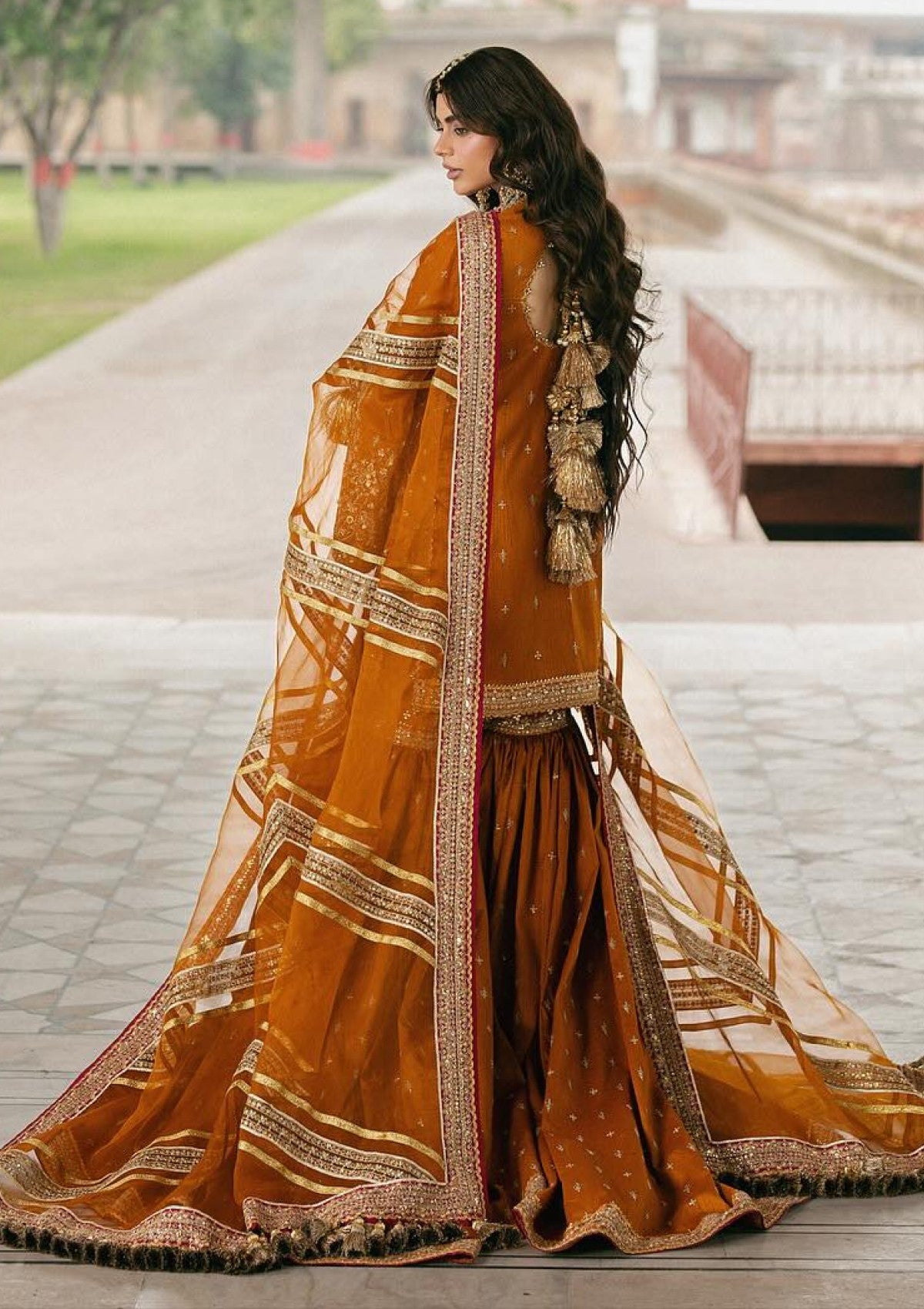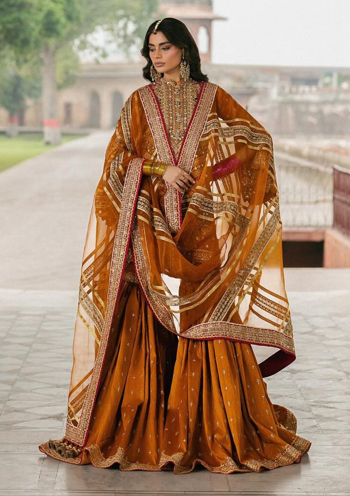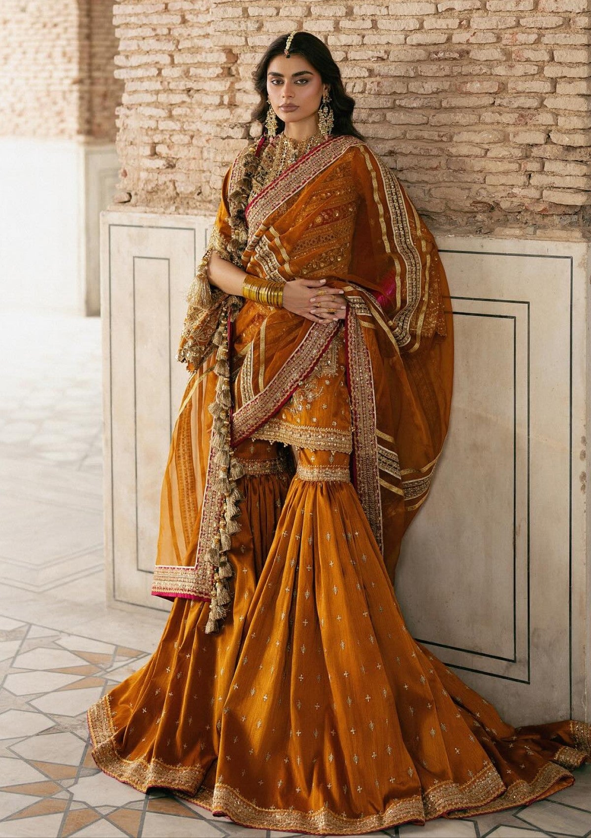 An elegant orange Indian silk shirt and gharara ensemble, adorned with a refined samosa border, contrasting accents, and intricate laser-cut detailing. Subtle 3D adda work adds depth and texture to the design, while an ethereal organza dupatta, delicately finished with a graceful border, completes the look. A timeless expression of traditional beauty with a touch of contemporary sophistication.