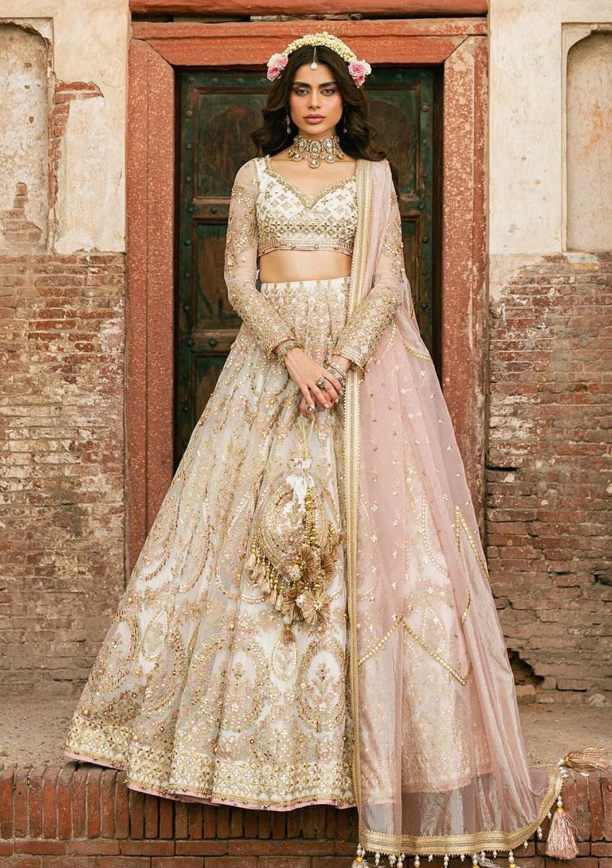 A graceful white lehnga adorned with delicate pani embroidery and subtle adda work, exuding understated elegance. It is paired with an ethereal organza dupatta, beautifully detailed with chan, tilla, and organza patches, and finished with an elegant border that enhances its timeless allure. A perfect harmony of sophistication and tradition.