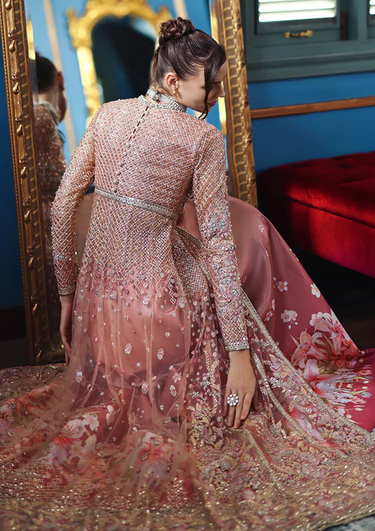 • Embroidered, sequined & hand embellished front yoke (net)