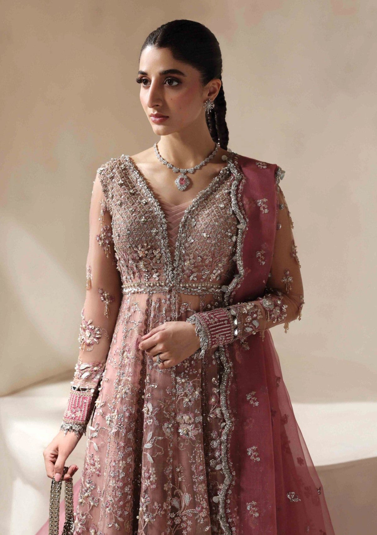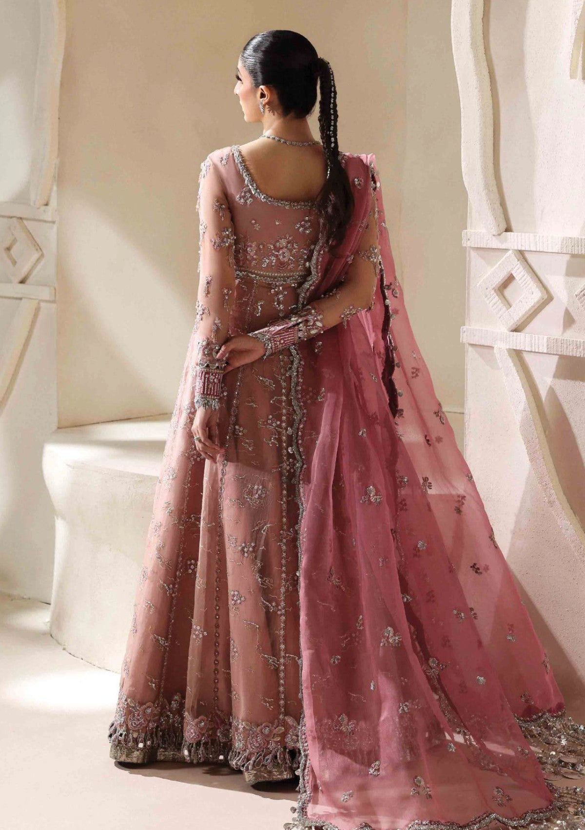 In dreamy dusty peach, this organza paneled pishwas captures the essence of feminine grace. The bodice shimmers with an intricate silver sequin jaal, while cascading panels bloom with delicate floral embroidery framed in soft pink satin for a whisper of refinement. Paired with an ethereal pink organza dupatta, the ensemble exudes quiet grandeur a perfect harmony of charm and sophistication, designed to leave a graceful impression wherever you go.