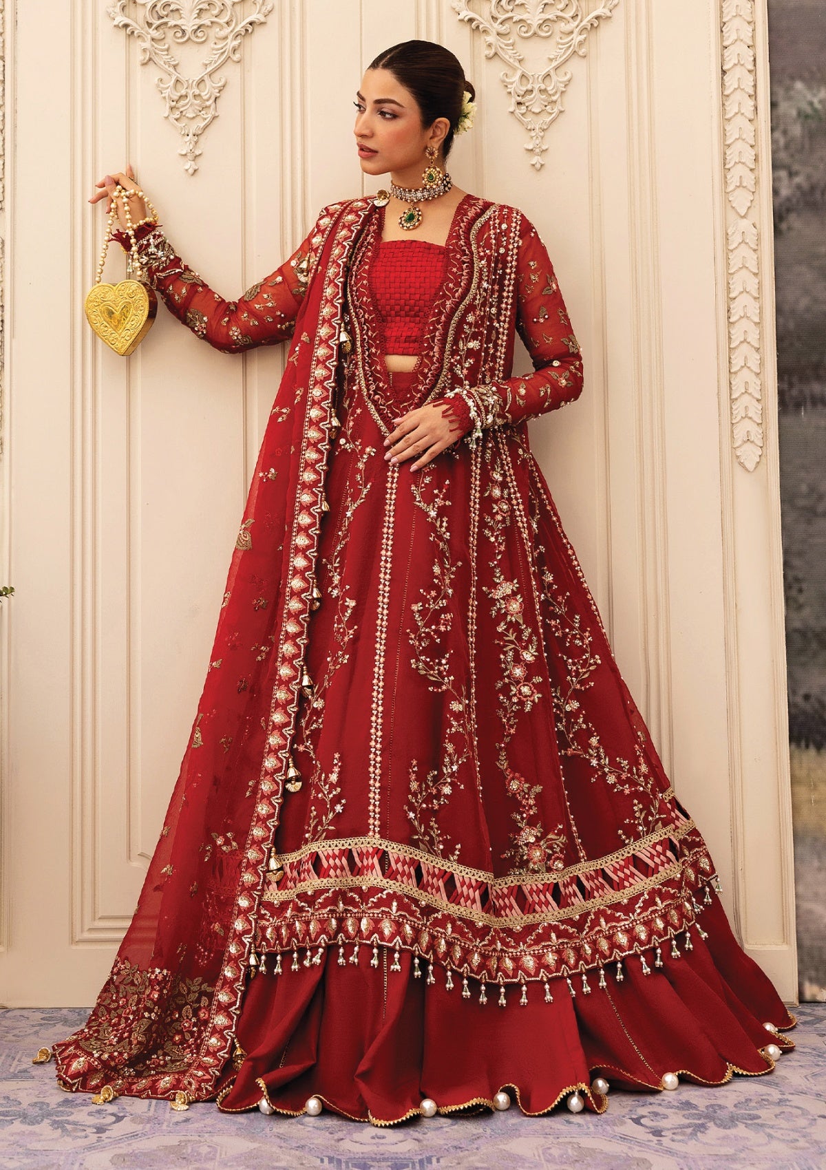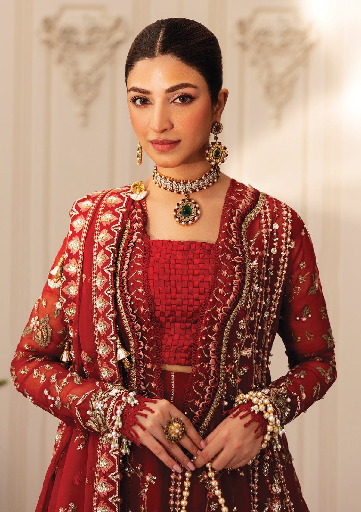 Designed as a kalidar, this gorgeous red organza 6 panel peshwas offers a perfect modern touch to the classic cut. Floral vines climb up the stylishly composed panels and are delicately hand embellished with finesse using nakshi, dabka, pearls and glistening crystals. Paired with an organza embroidered and sequin embellished heavy dupatta to complete the formal festive look. An ideal pick for a show stopping appearance.